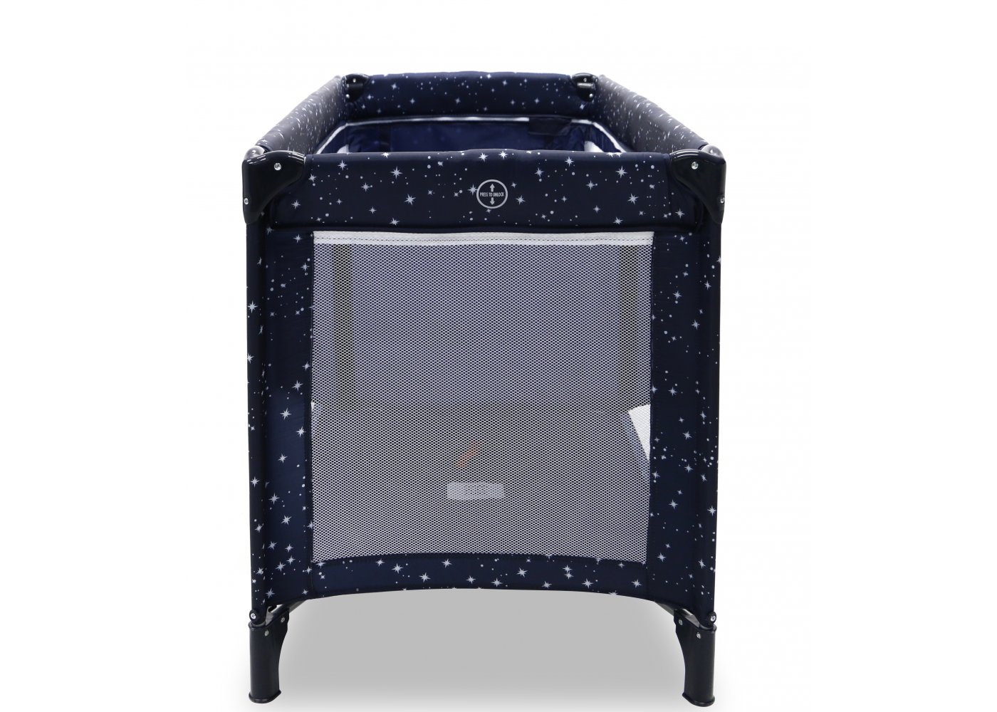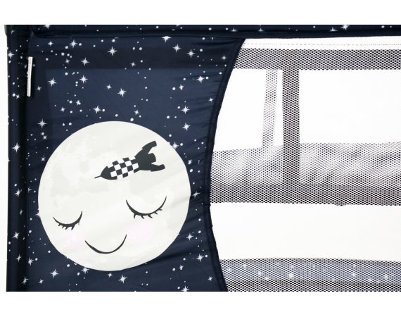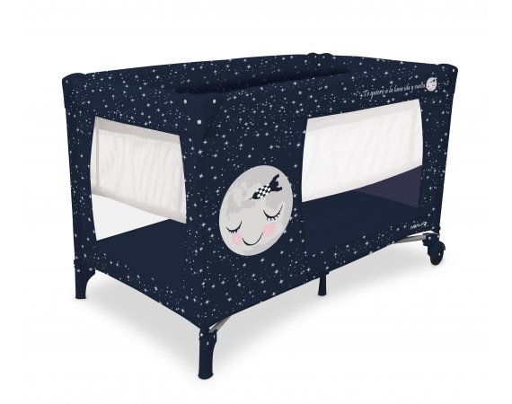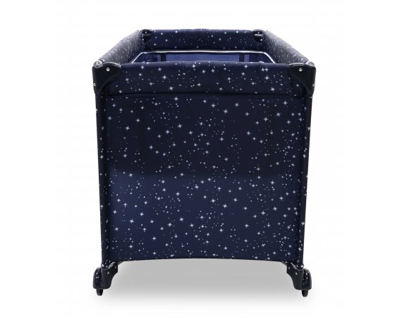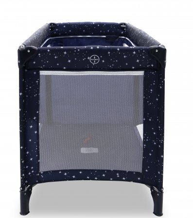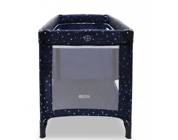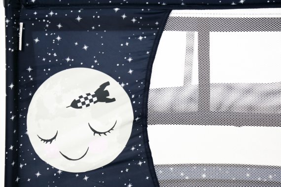 Den har två hjul som kan bromsas och fyra stora nätfönster, så att du enkelt kan se ditt barn från alla håll - och på avstånd. Den fjärde sidan är utrustad med en ficka till muslinfiltar eller leksaker.