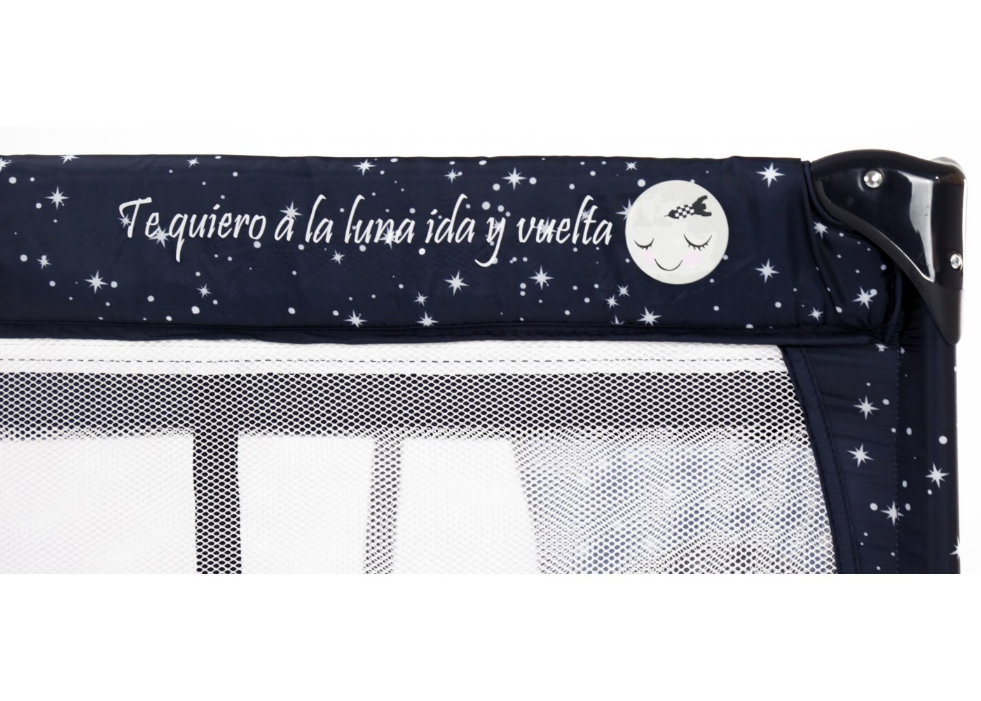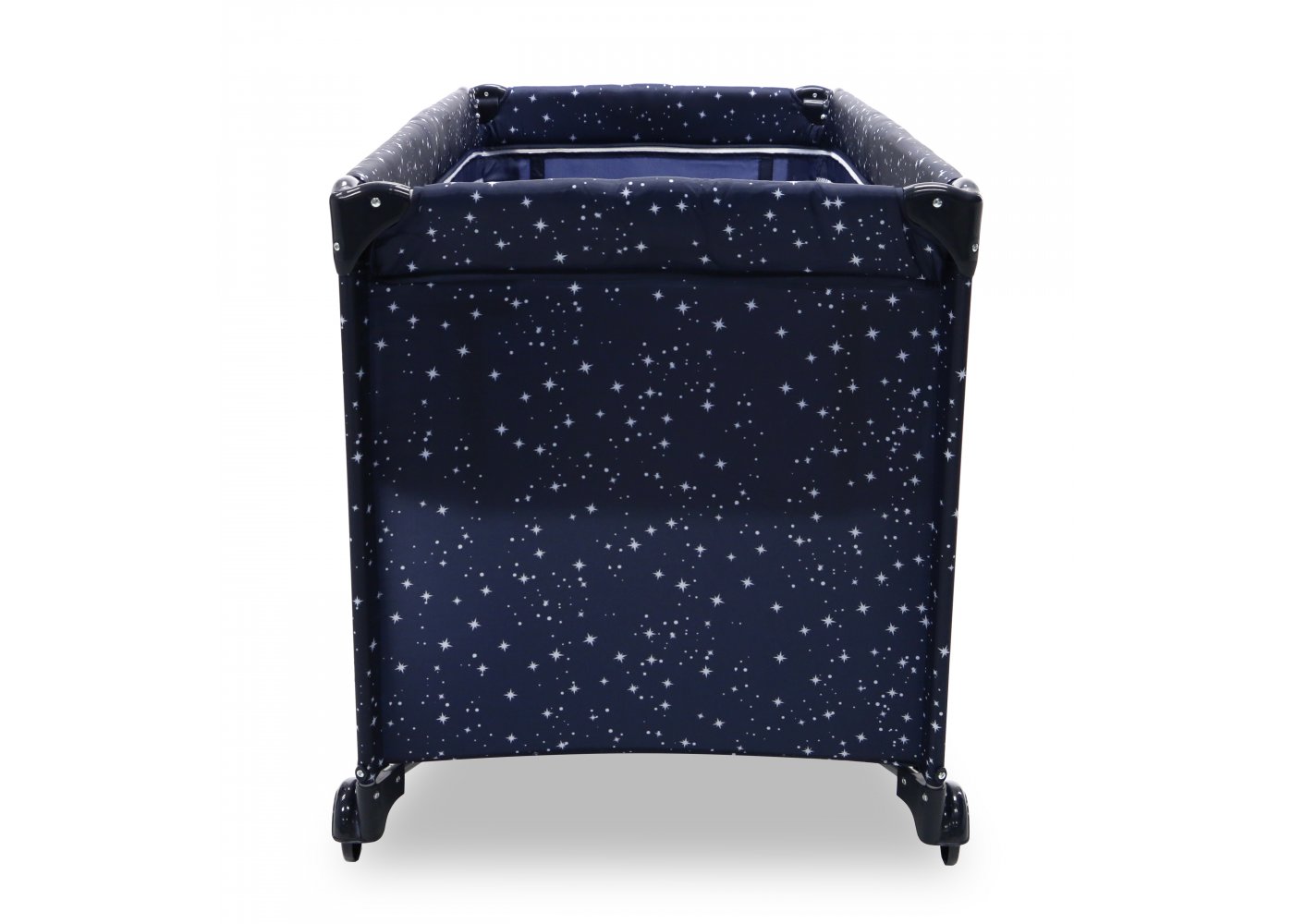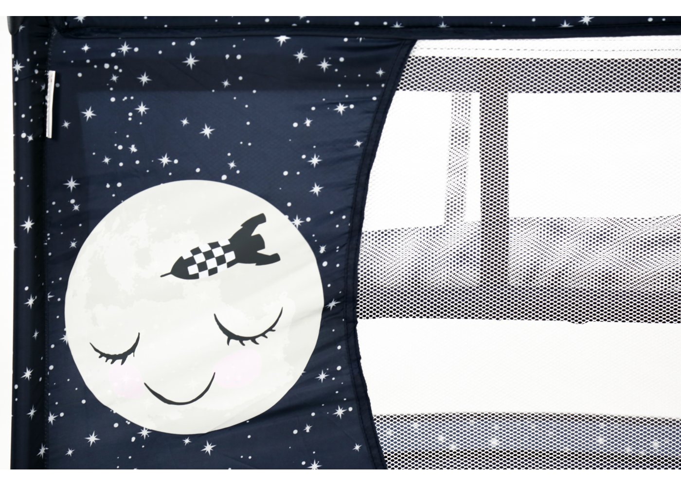 Den har två hjul som kan bromsas och fyra stora nätfönster, så att du enkelt kan se ditt barn från alla håll - och på avstånd. Den fjärde sidan är utrustad med en ficka till muslinfiltar eller leksaker.