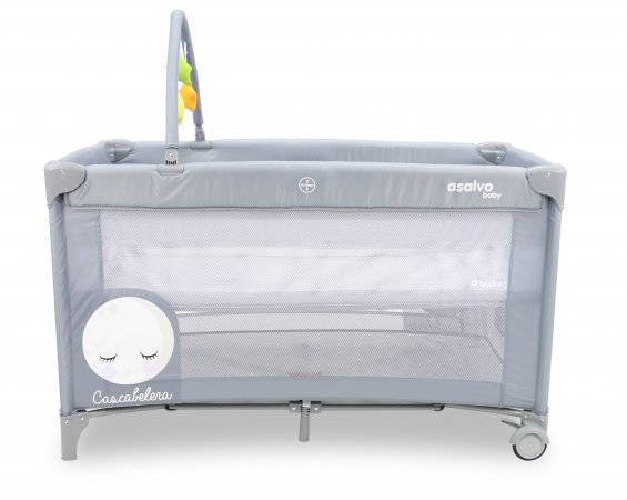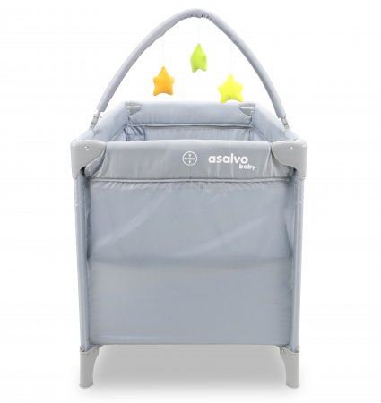 Asalvo Moon är i grått, har en ficka och en söt lekmobil ingår att fästa i sängen, så barnet har något att leka med. Den har en smart insats till höjdjustering, för att lägga den lilla bebisen, så att du inte behöver böja ryggen så långt ner i sängen, om du ska ge napp eller gosa lite, vid läggdags. Den kan naturligtvis bara användas till de mycket små bebisarna. När/om du inte längre behöver insatsen längre, tas den lätt ut och resesängen fungerar som en helt vanlig säng.