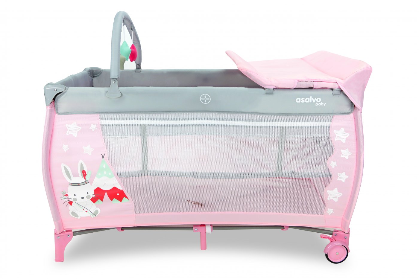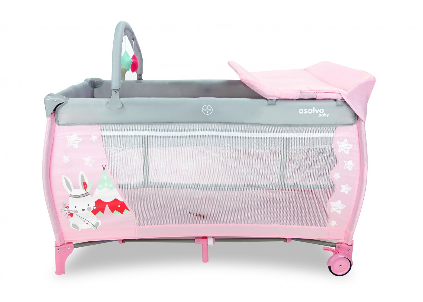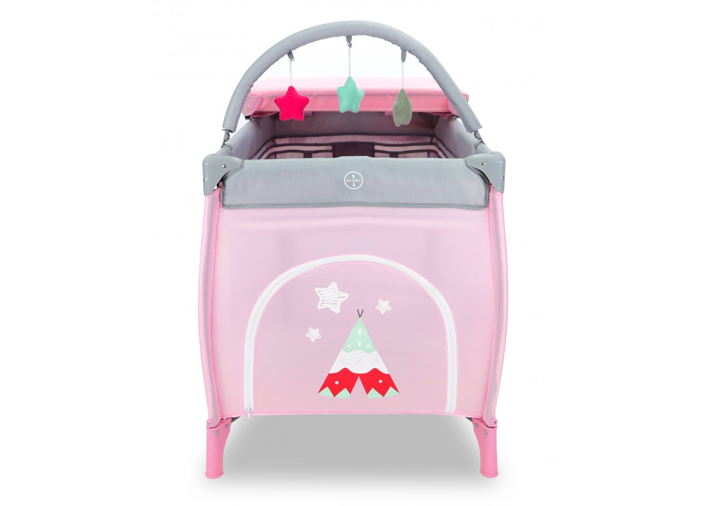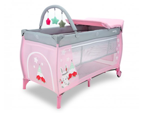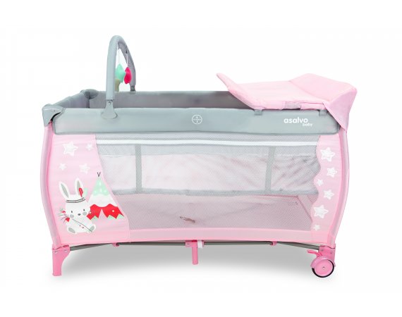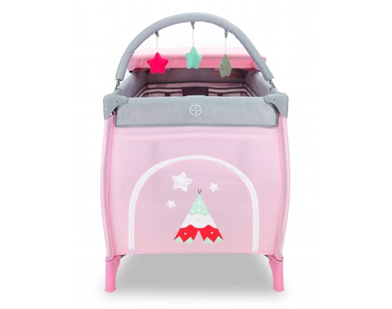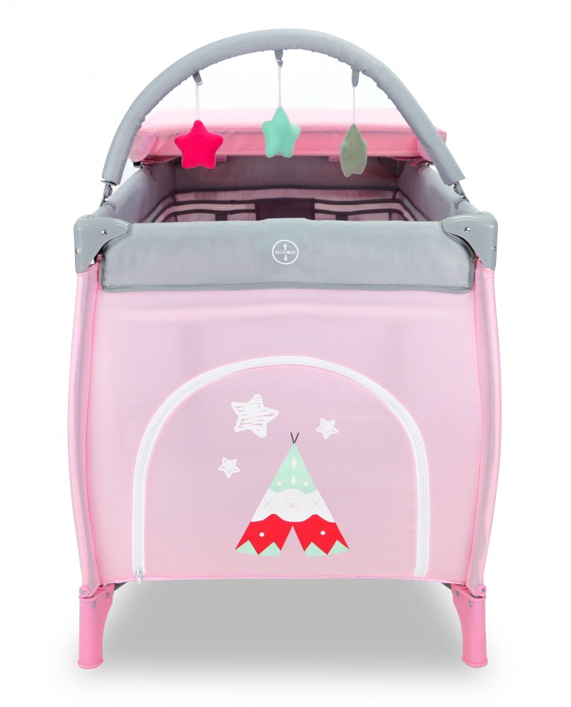 Resesängen har två hjul som kan bromsas och två stora nätfönster så att du enkelt kan se ditt barn från sidorna. Den tredje sidan är utrustad med en blixtlåsöppning som gör att barnet kan krypa ur sängen.