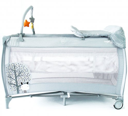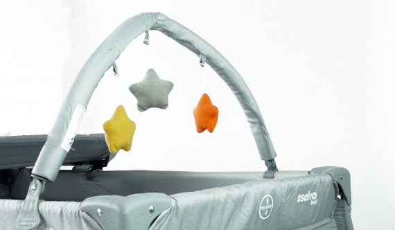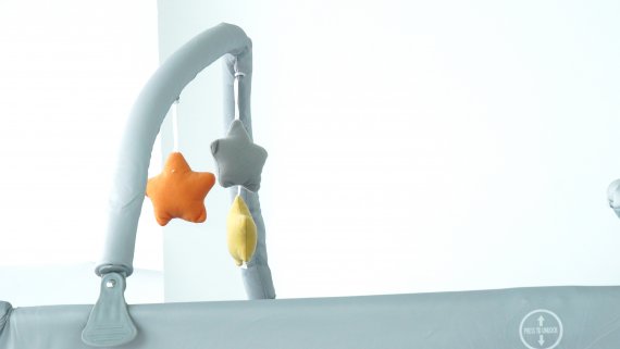 Det ingår en söt leksaksmobil att fästa på sängen, så barnet har något att titta på.