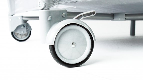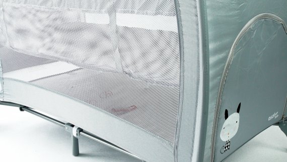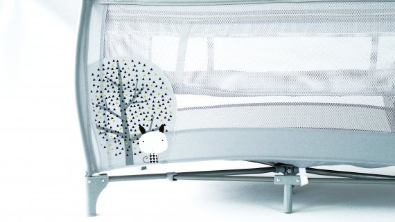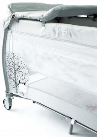 Resesängen har två hjul som kan bromsas och två stora nätfönster så att du enkelt kan se ditt barn från sidorna. Den tredje sidan är utrustad med en blixtlåsöppning som gör att barnet kan krypa ur sängen.