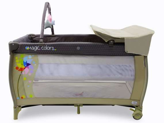 Resesängen har två hjul som kan bromsas och två stora nätfönster så att du enkelt kan se ditt barn från sidorna. Den tredje sidan är utrustad med en blixtlåsöppning som gör att barnet kan krypa ur sängen.
