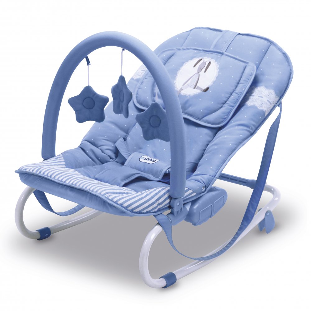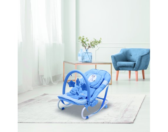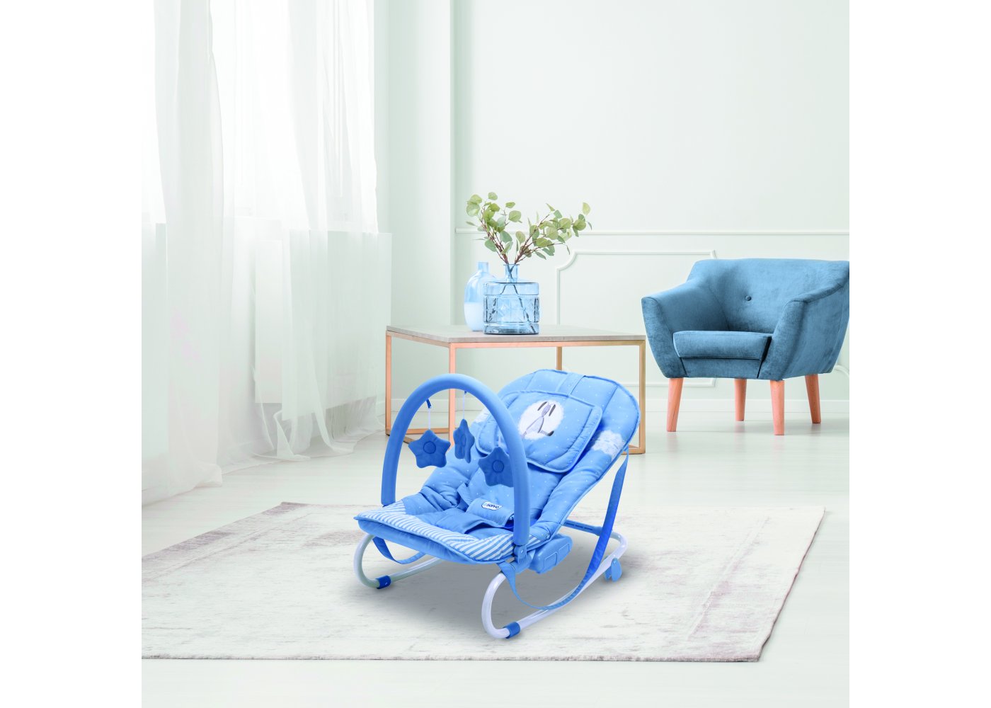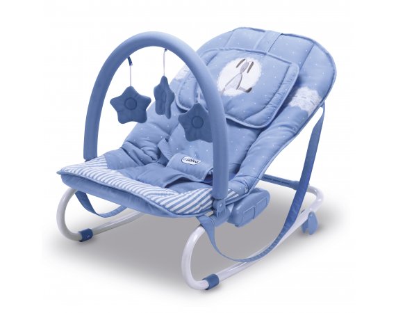 Babysittern har en 3-punktssele och är utrustad med en leksaksbygel som kan användas som transporthandtag.