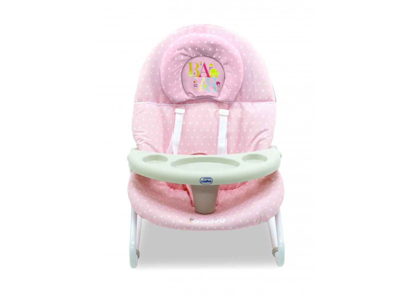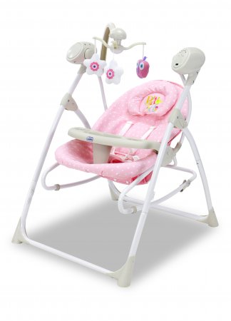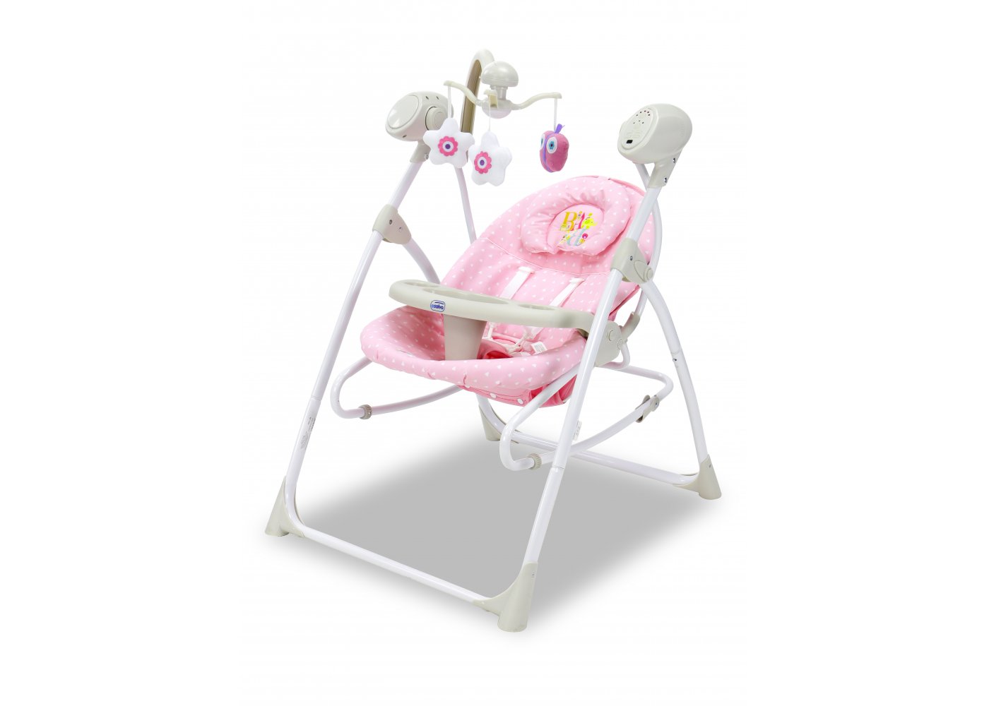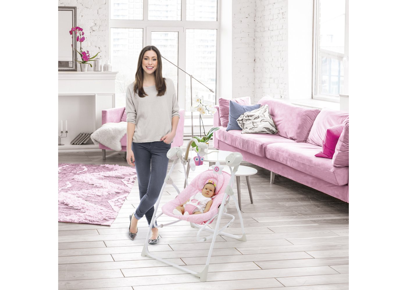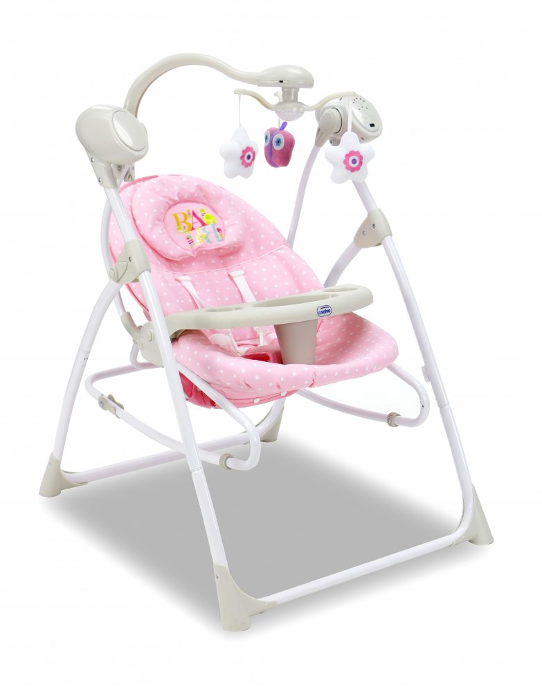 Asalvo Baby Swing har en snygg mobil som kan snurra runt i olika hastigheter, och som innehåller musik, naturljud och kromoterapi (färgterapi). E Det ingår en kopphållare som enkelt kan tas bort om det är dags att vippa lite!
