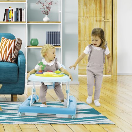 Aktivitetsdelen är utrustad med leksaker, lampor och musik. Gåvagnen har hjul på undersidan och 6 bromsklossar som säkerställer att gåstolen låses när det kommer höjdskillnader.