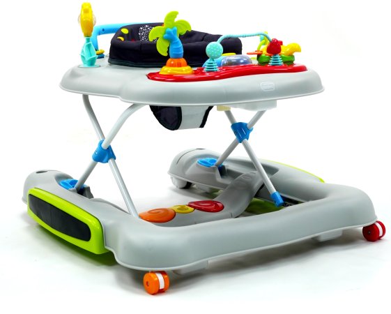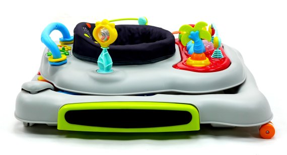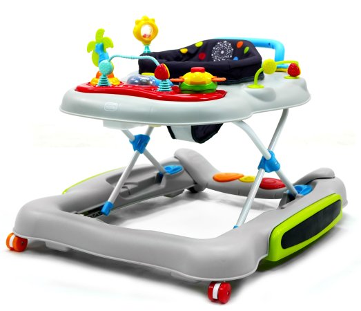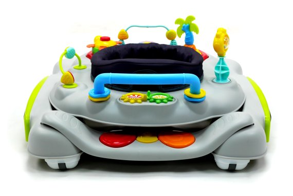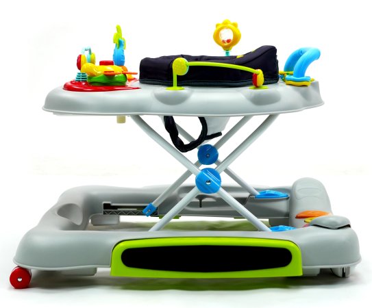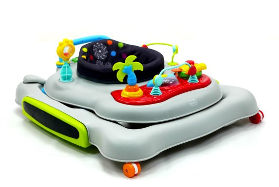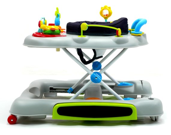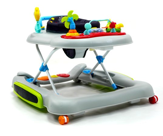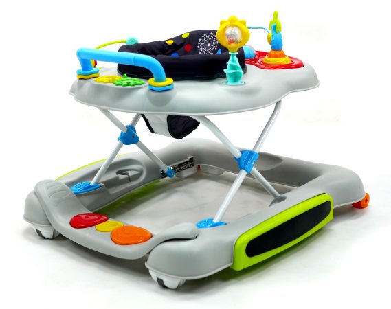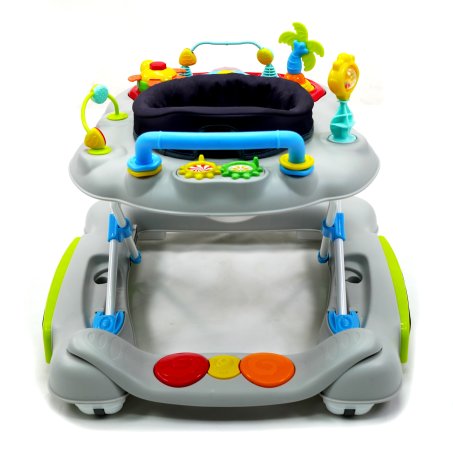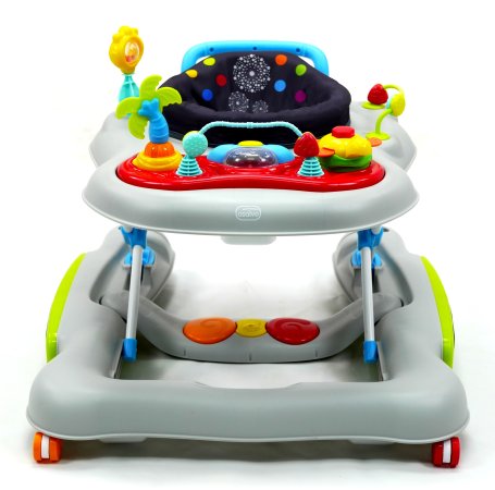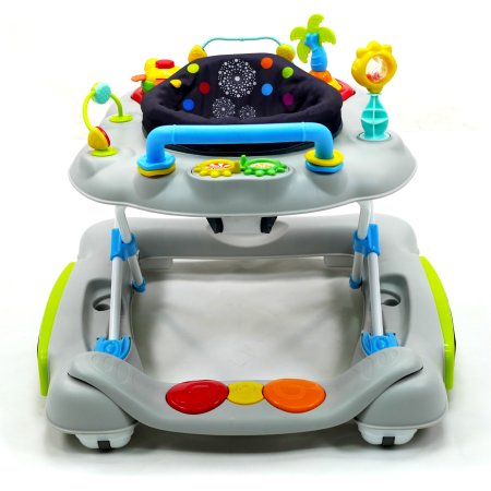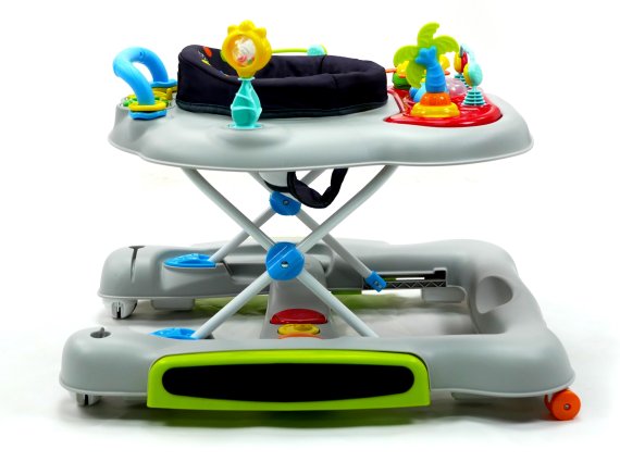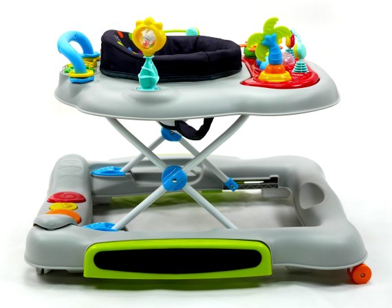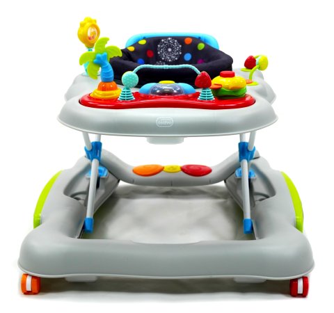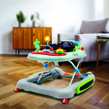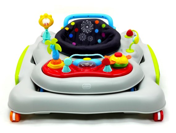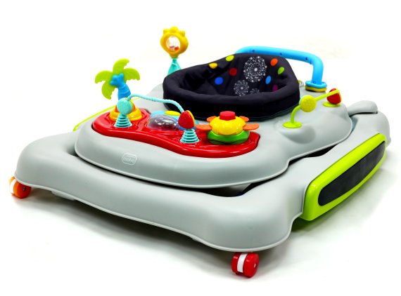 Aktivitetsdelen är utrustad med leksaker, lampor och musik. Gåvagnen har hjul på undersidan och 6 bromsklossar som säkerställer att gåstolen låses när det kommer höjdskillnader.