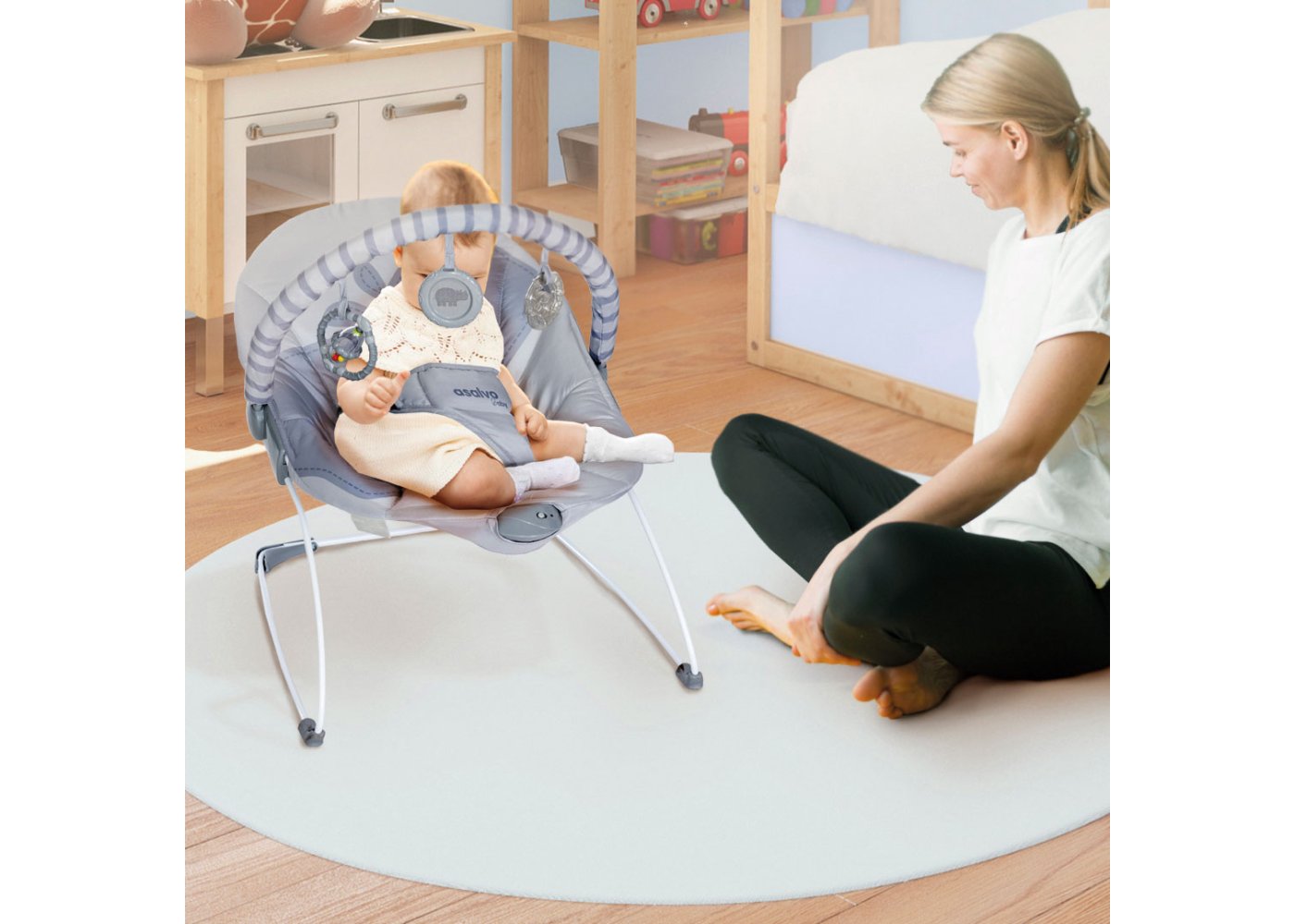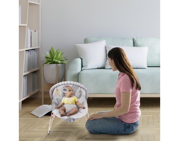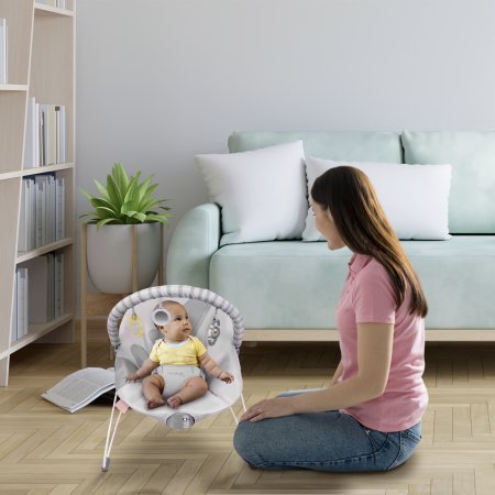 Den perfekta barnstolen för både lek och avkoppling! Med en avtagbar lekstång med 3 roliga leksaker stimuleras barnets nyfikenhet och sinnen. Den milda vibrationsfunktionen skapar en lugnande atmosfär, medan den justerbara 3-punktsselen garanterar maximal säkerhet. Den är lätt att flytta runt i hemmet och det avtagbara, tvättbara tyget gör rengöringen enkel.