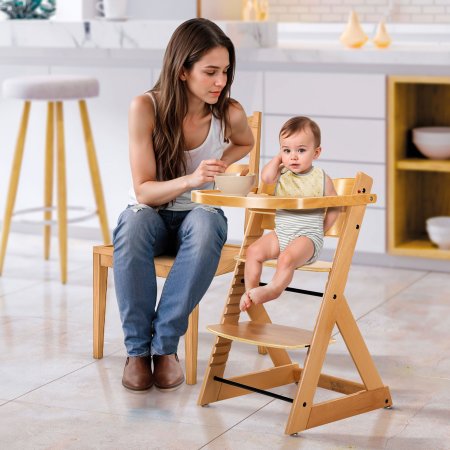 Den är designad för både måltider och lek och kan omvandlas till en vanlig stol och användas upp till 35 kg.