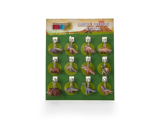 Fin display med 72 nyckelringar med dinosaurierNyckelringarna kan användas för större evenemang i institutioner eller som en liten present till födelsedagsevenemang.