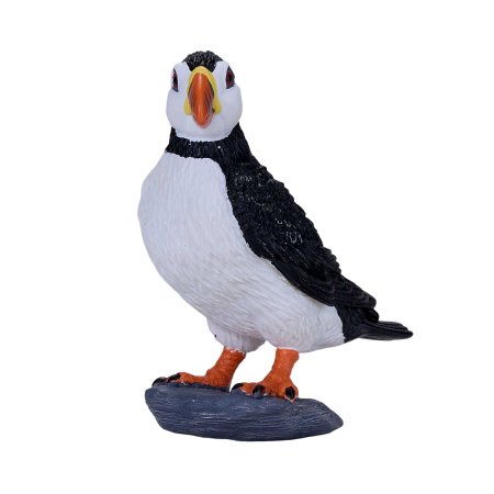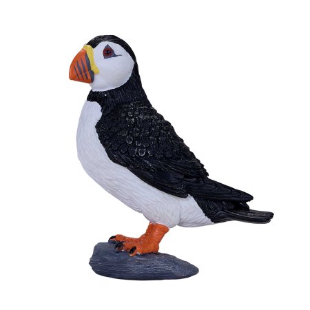 Den har en karakteristiskt utseende, inklusive en färgglad näbbskiva, rödorange fötter och en svartvit fjäderdräkt.