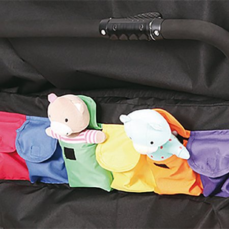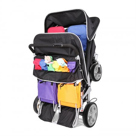 Två avtagbara parasoller medföljer som kan vara riktigt bra att ha med när solen skiner. Varje säte kan bära upp till ca 18 kg. Vagnen är utrustad med stora varukorgar med plats för förvaring.