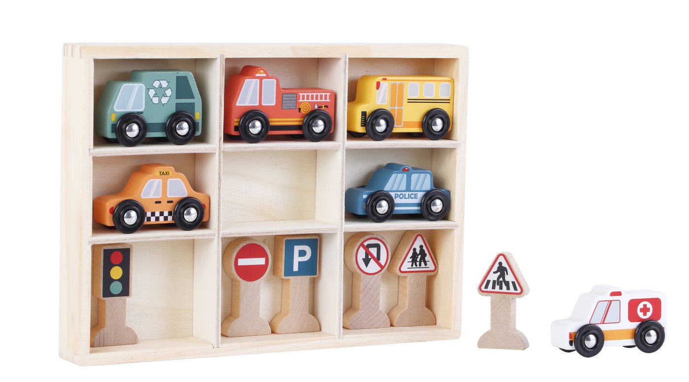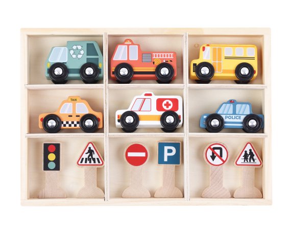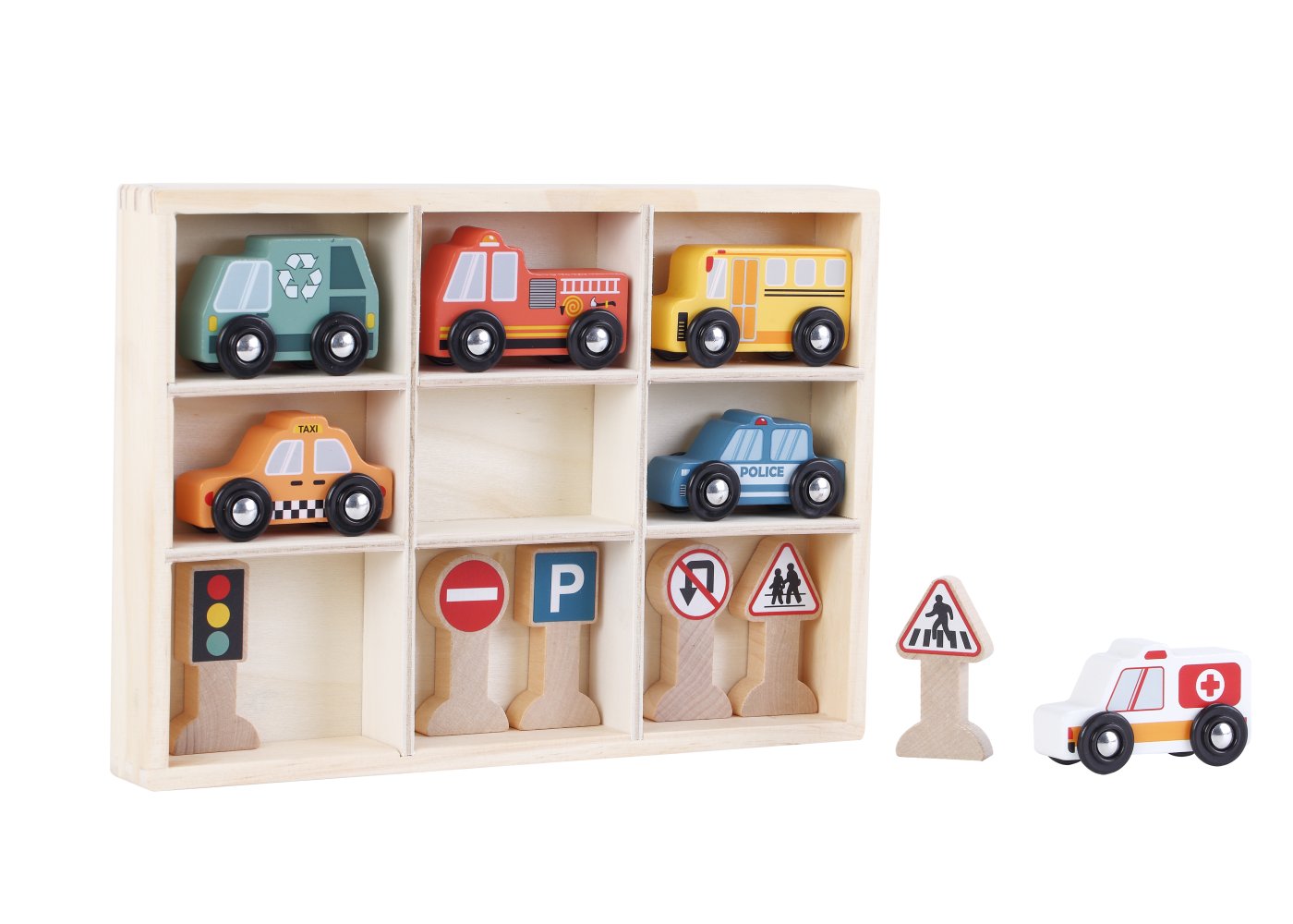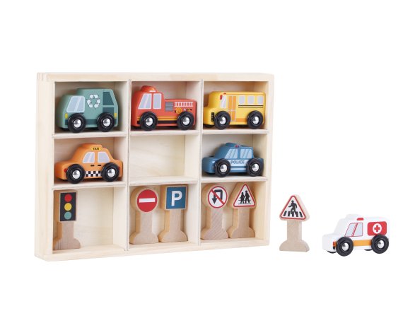Trälåda med trafikskyltar och fordon i trä från Kinder and Kids, tolv delar.