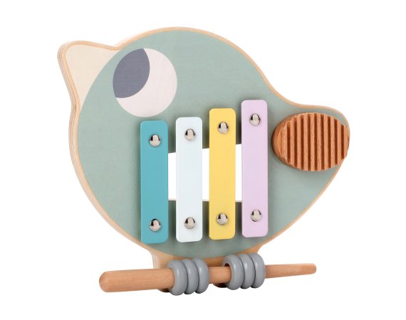 Fågeln är ett fint musikinstrument med ett inbyggt xylofon och slagverksinstrument.