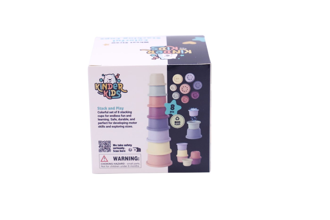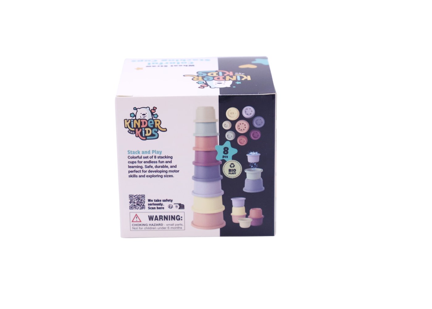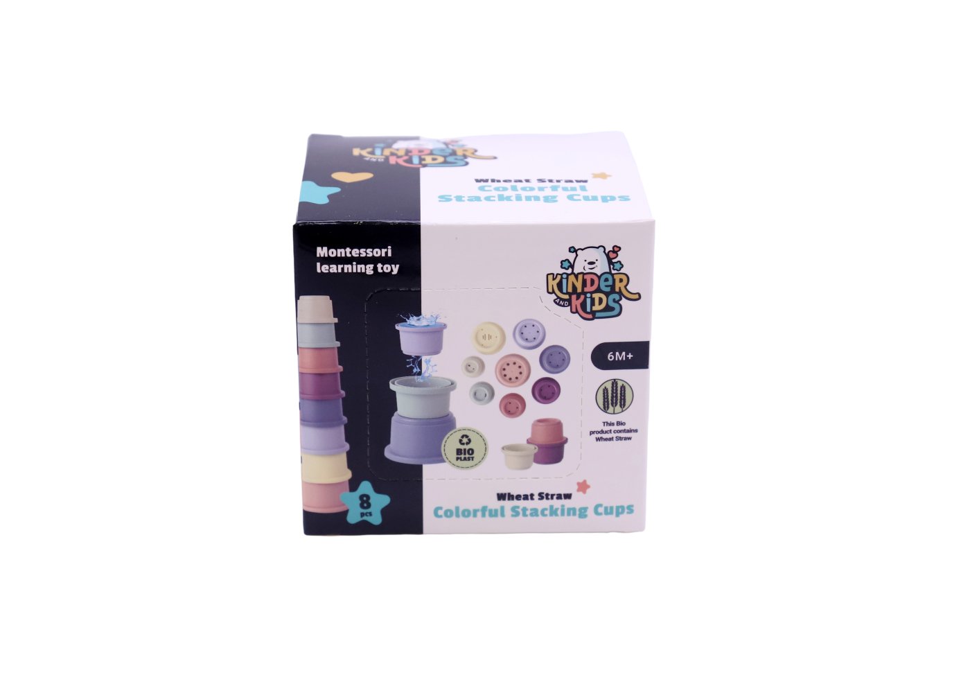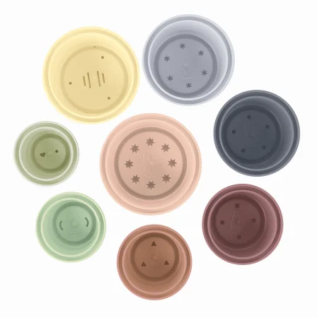 Åtta stapelbara koppar med siffror och hål för rolig vattenlek från Kinder och Kids.