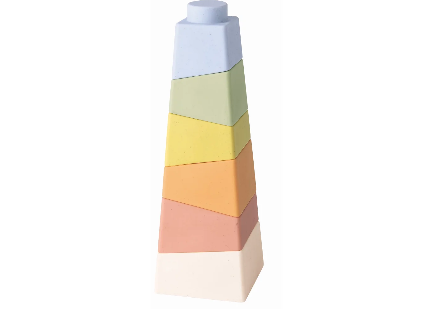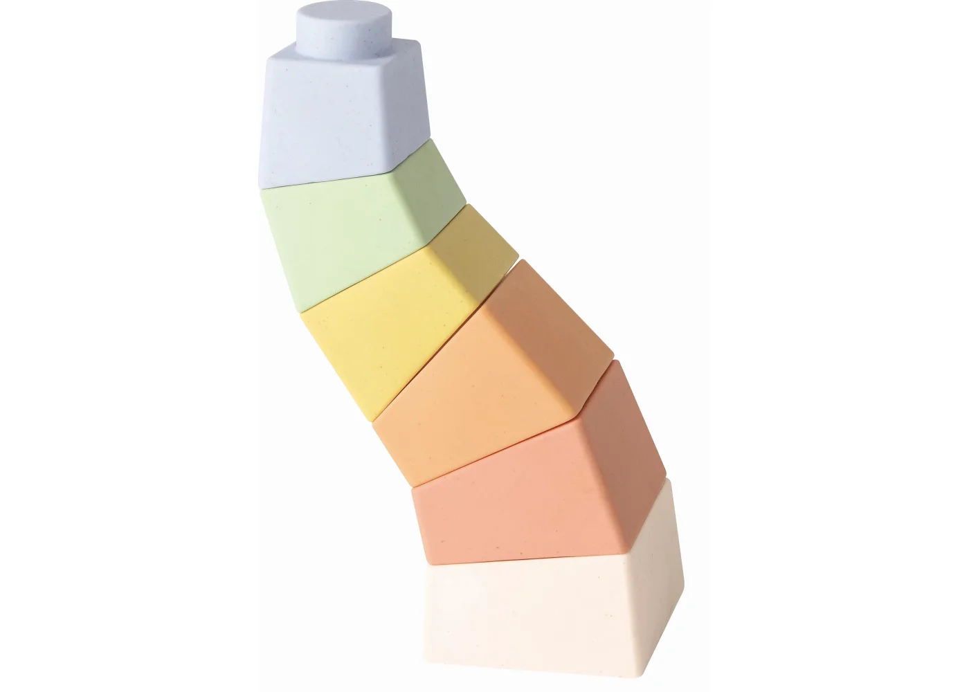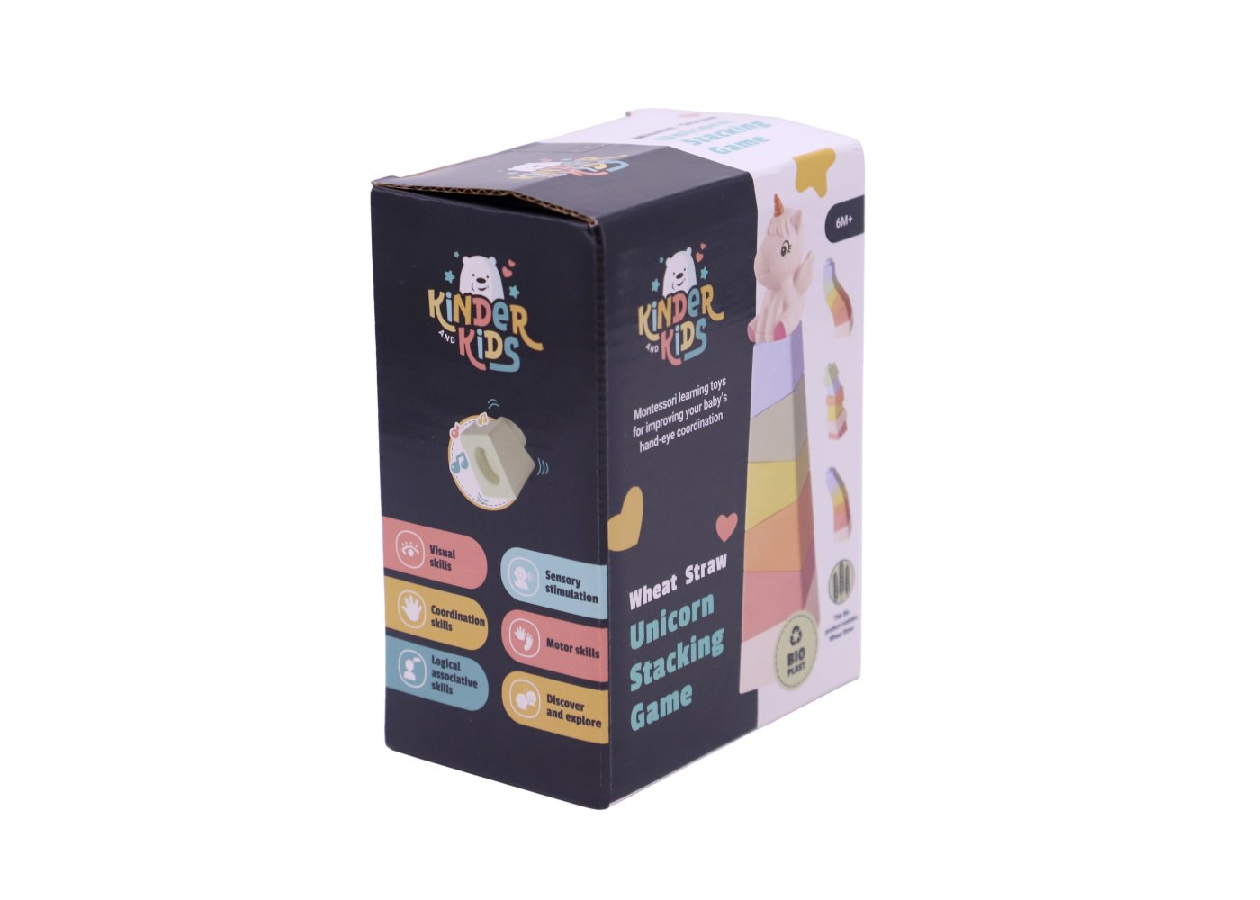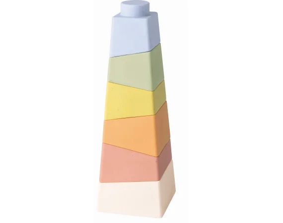 Det vackra stapeltornet i läckra dämpade färger kommer med 6 BIOplast-klossar i olika storlekar och former som måste passa ihop och en söt enhörning att sätta på toppen av tornet.