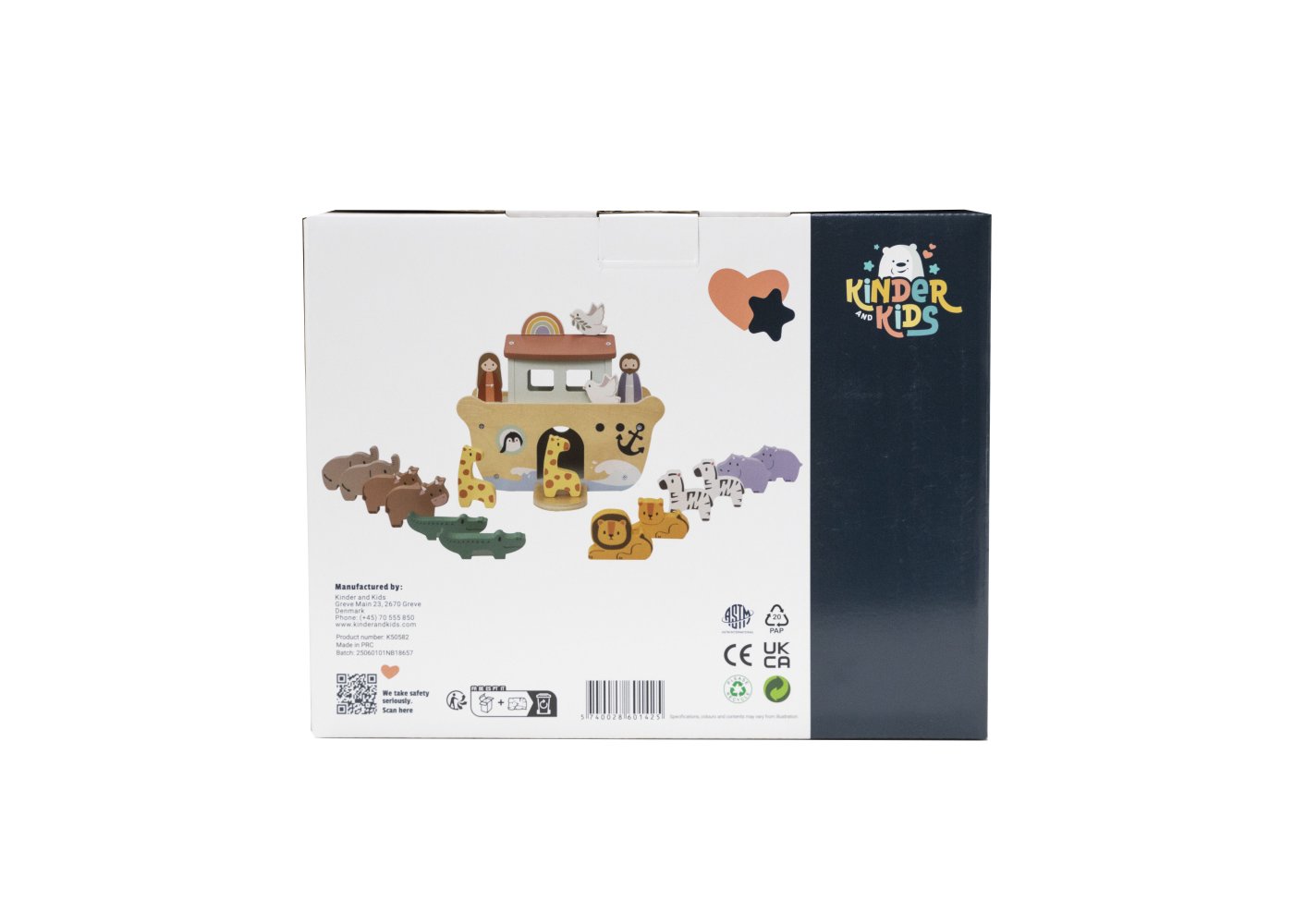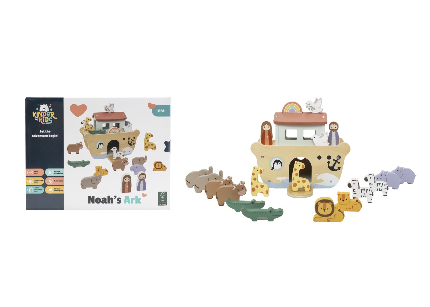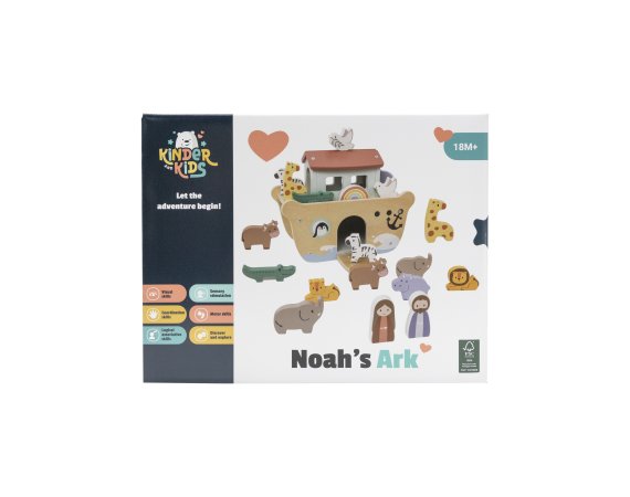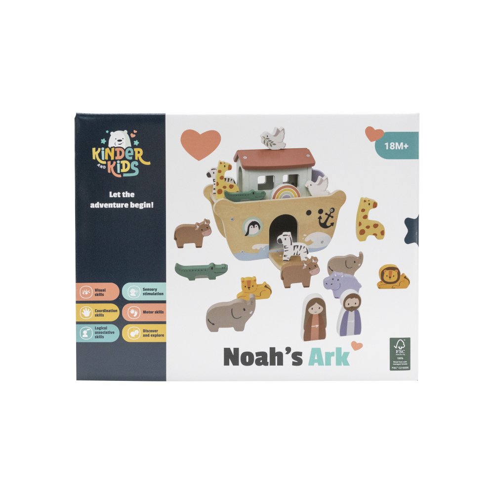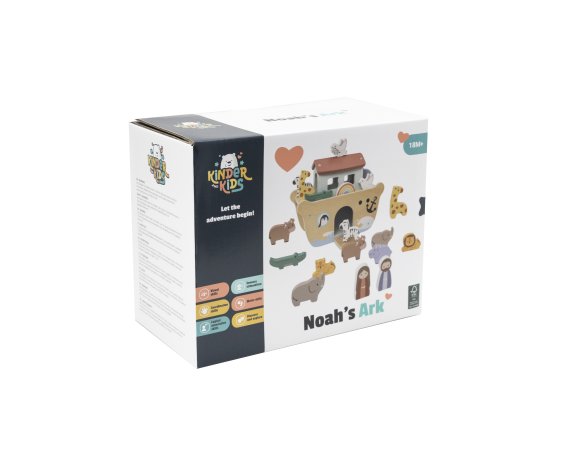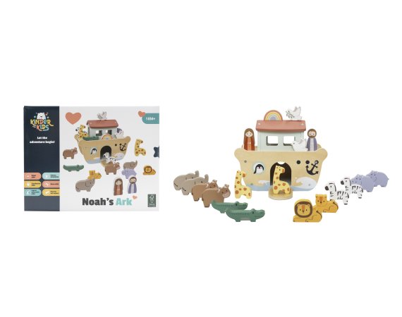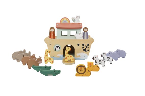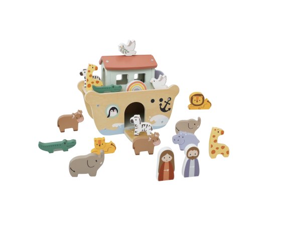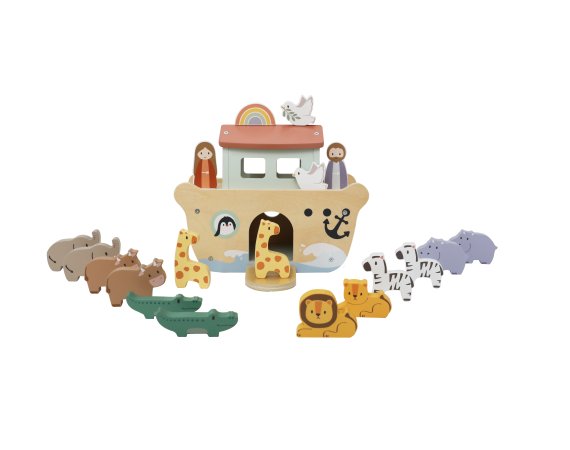 En vacker Noaks ark i trä där barnen kan leka med både djur och figurer. Djuren kan gå in i arken två och två och leken kan utvecklas till små berättelser om resor till sjöss och livet ombord.