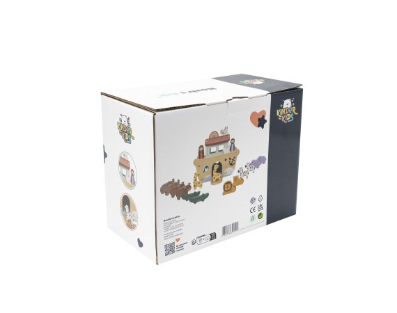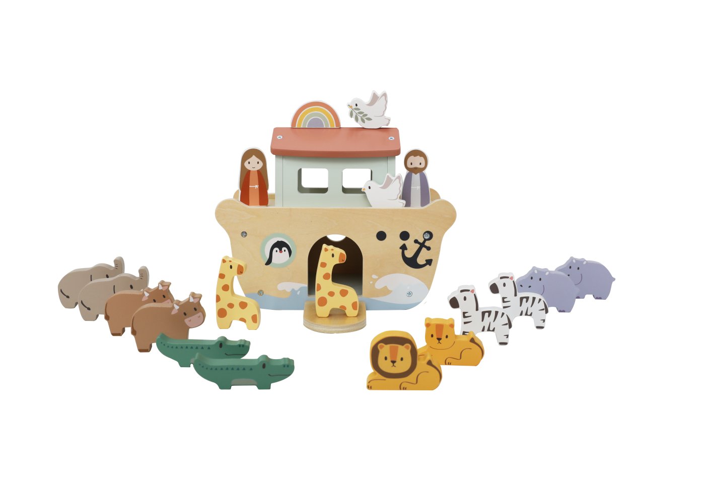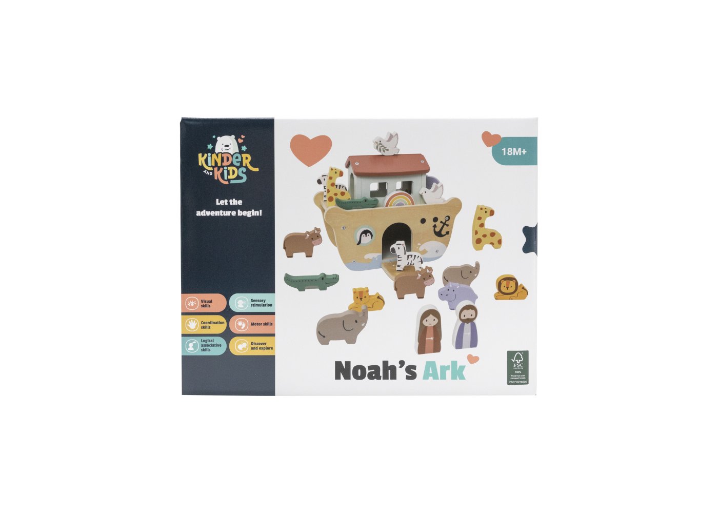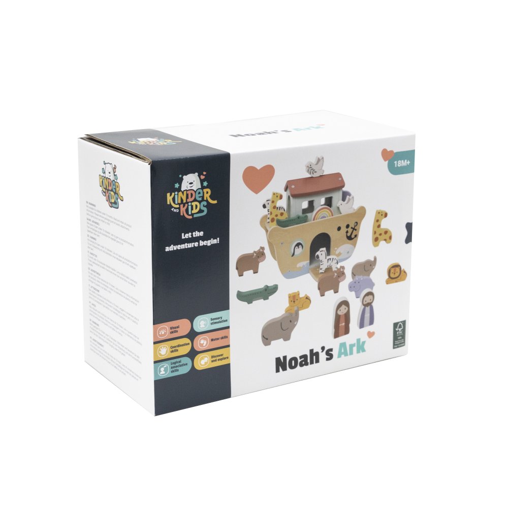 En vacker Noaks ark i trä där barnen kan leka med både djur och figurer. Djuren kan gå in i arken två och två och leken kan utvecklas till små berättelser om resor till sjöss och livet ombord.