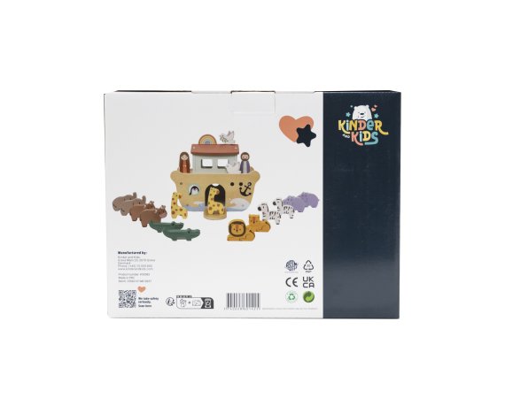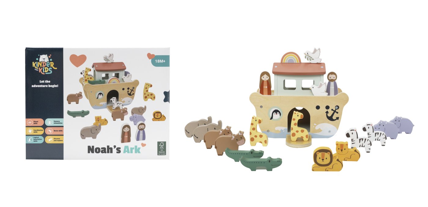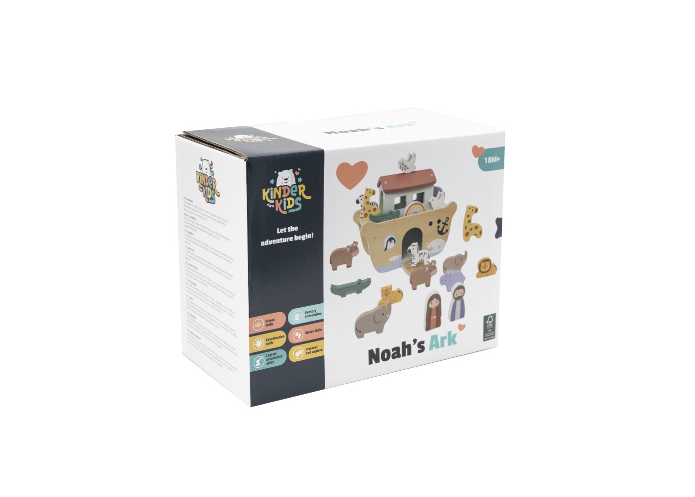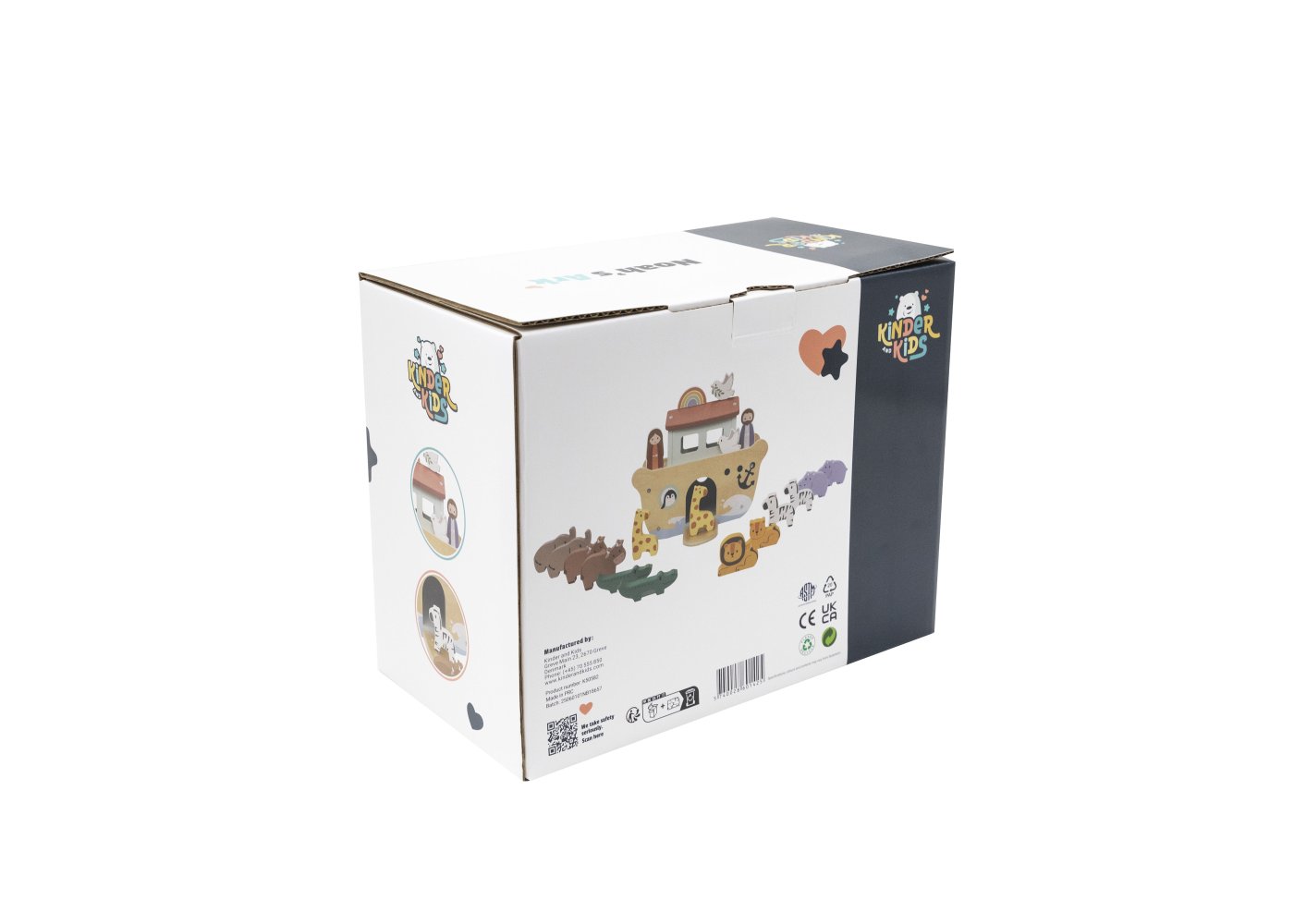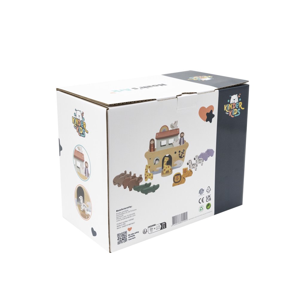 En vacker Noaks ark i trä där barnen kan leka med både djur och figurer. Djuren kan gå in i arken två och två och leken kan utvecklas till små berättelser om resor till sjöss och livet ombord.