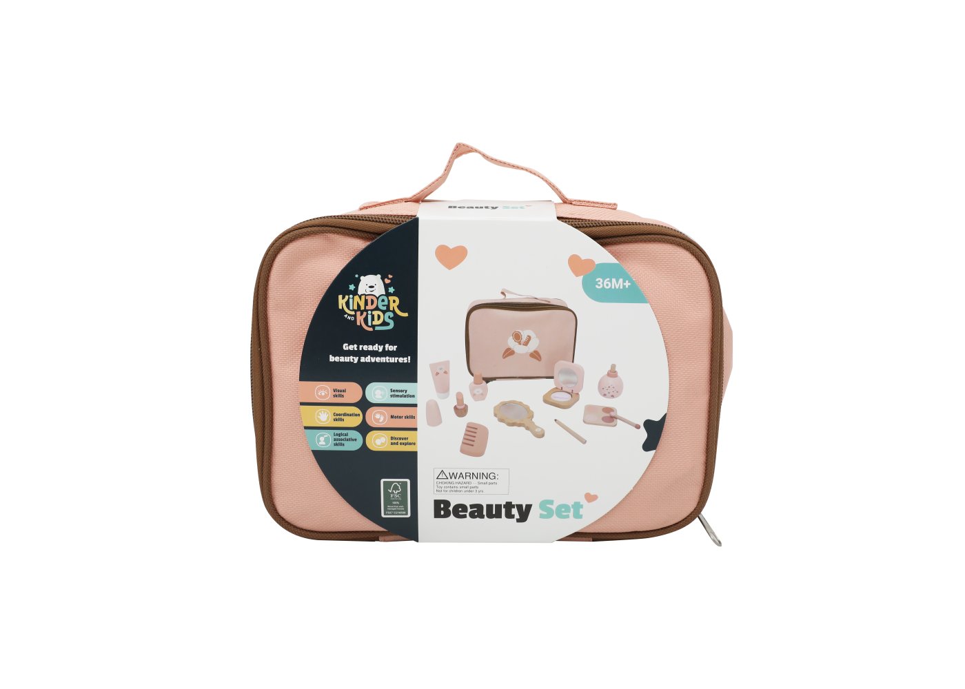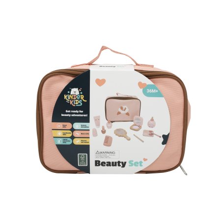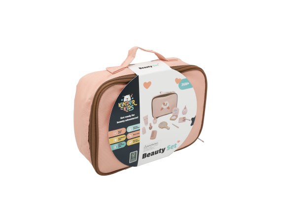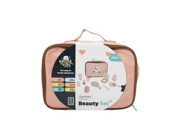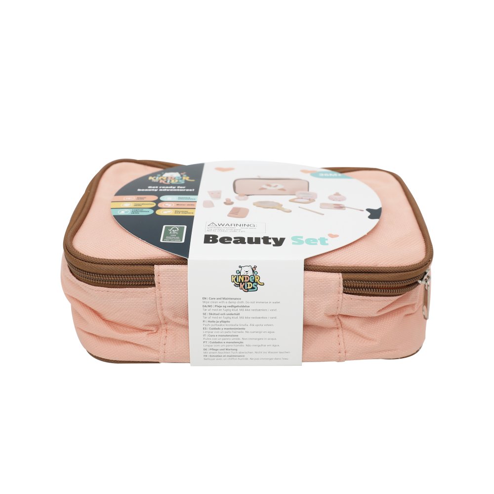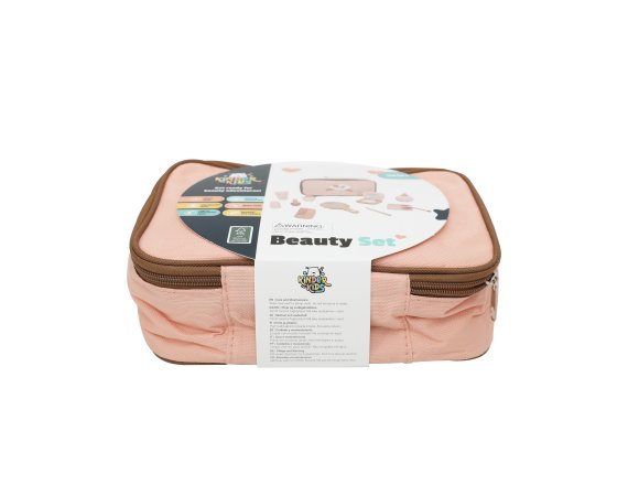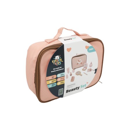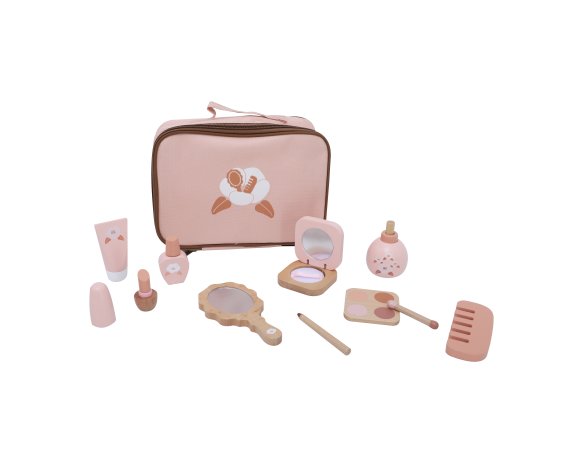 Ett charmigt skönhetsset i trä som ger barnen många möjligheter att leka frisör eller makeupartist. Alla tillbehör är samlade i en söt rosa tygpåse, så att de enkelt kan tas med dig och förvaras igen efter lek.