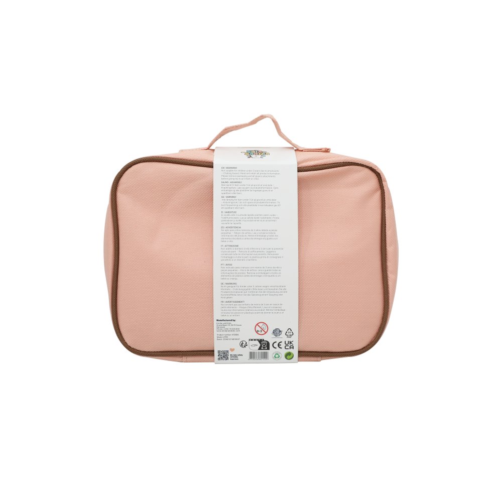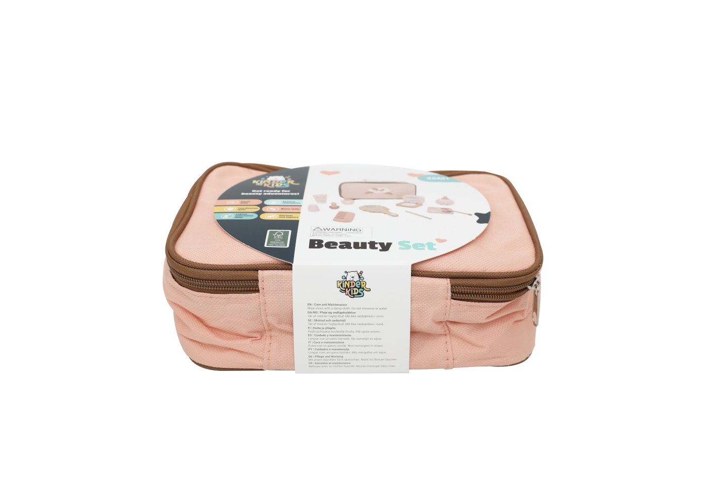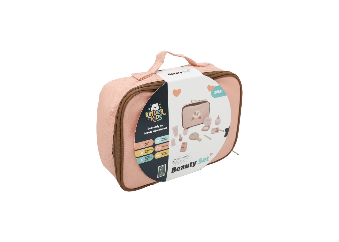Ett charmigt skönhetsset i trä som ger barnen många möjligheter att leka frisör eller makeupartist. Alla tillbehör är samlade i en söt rosa tygpåse, så att de enkelt kan tas med dig och förvaras igen efter lek.