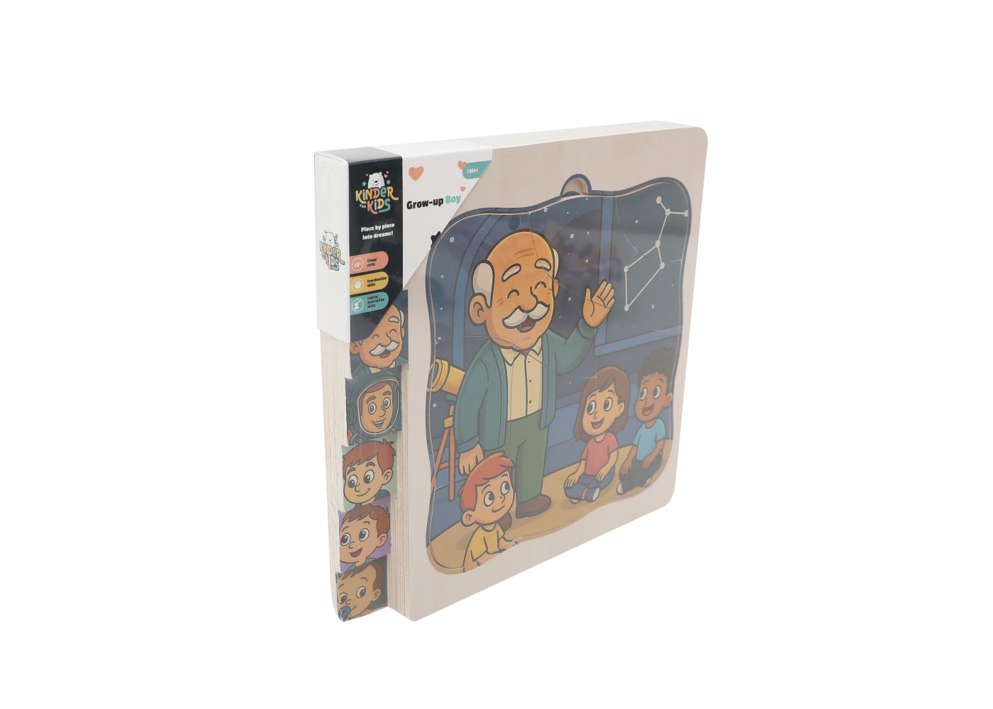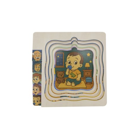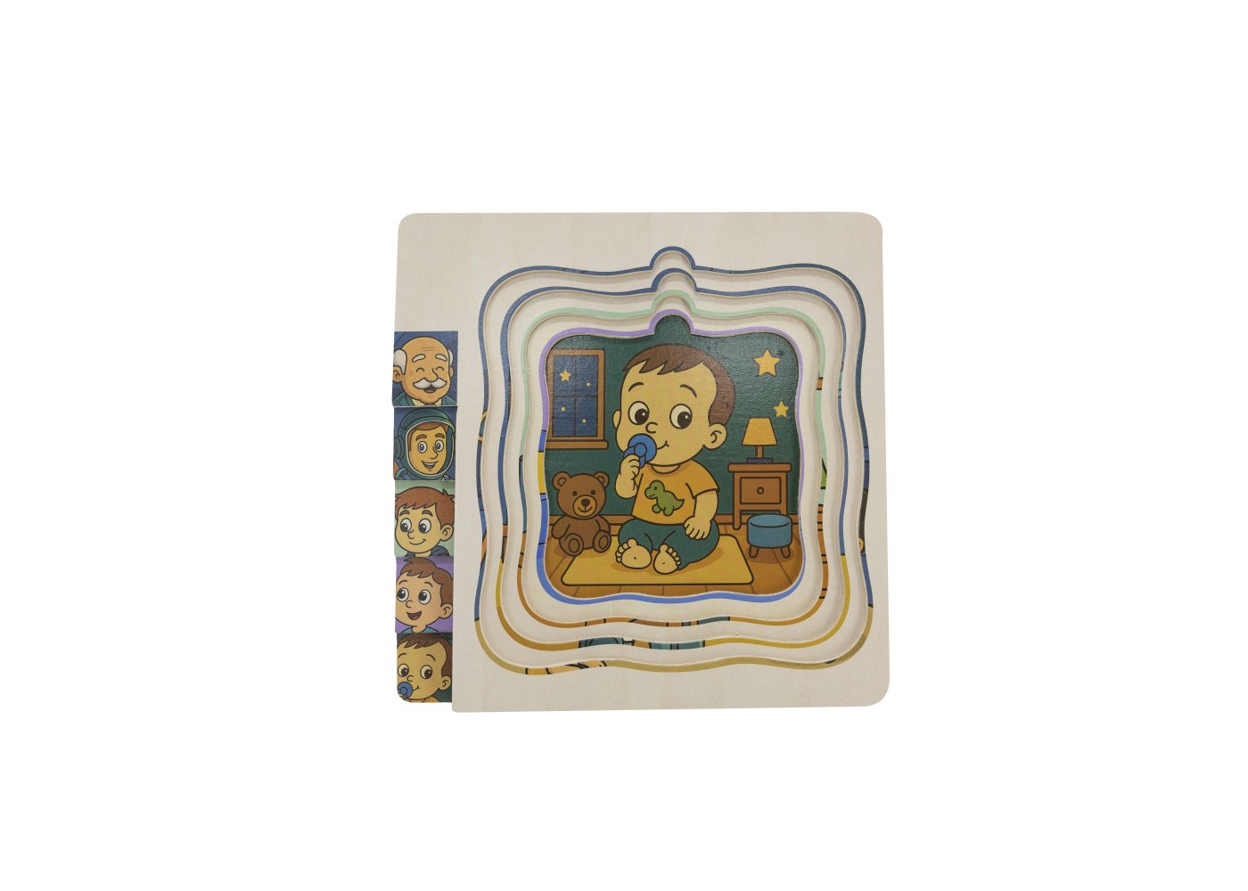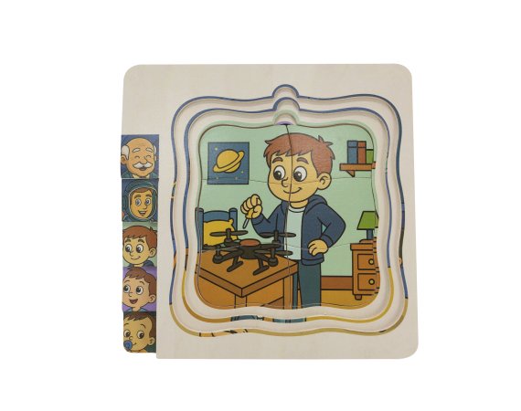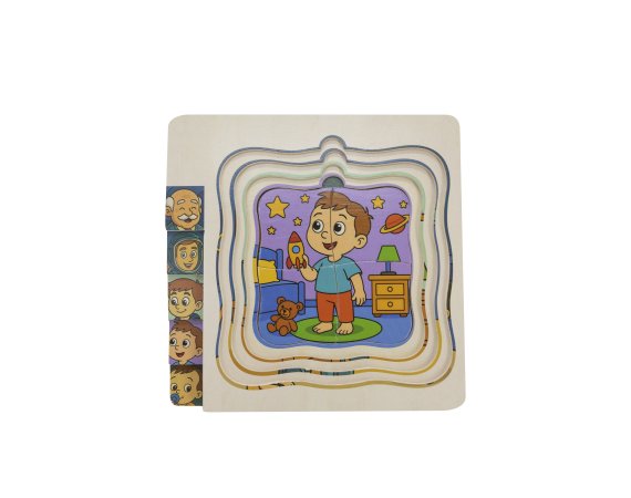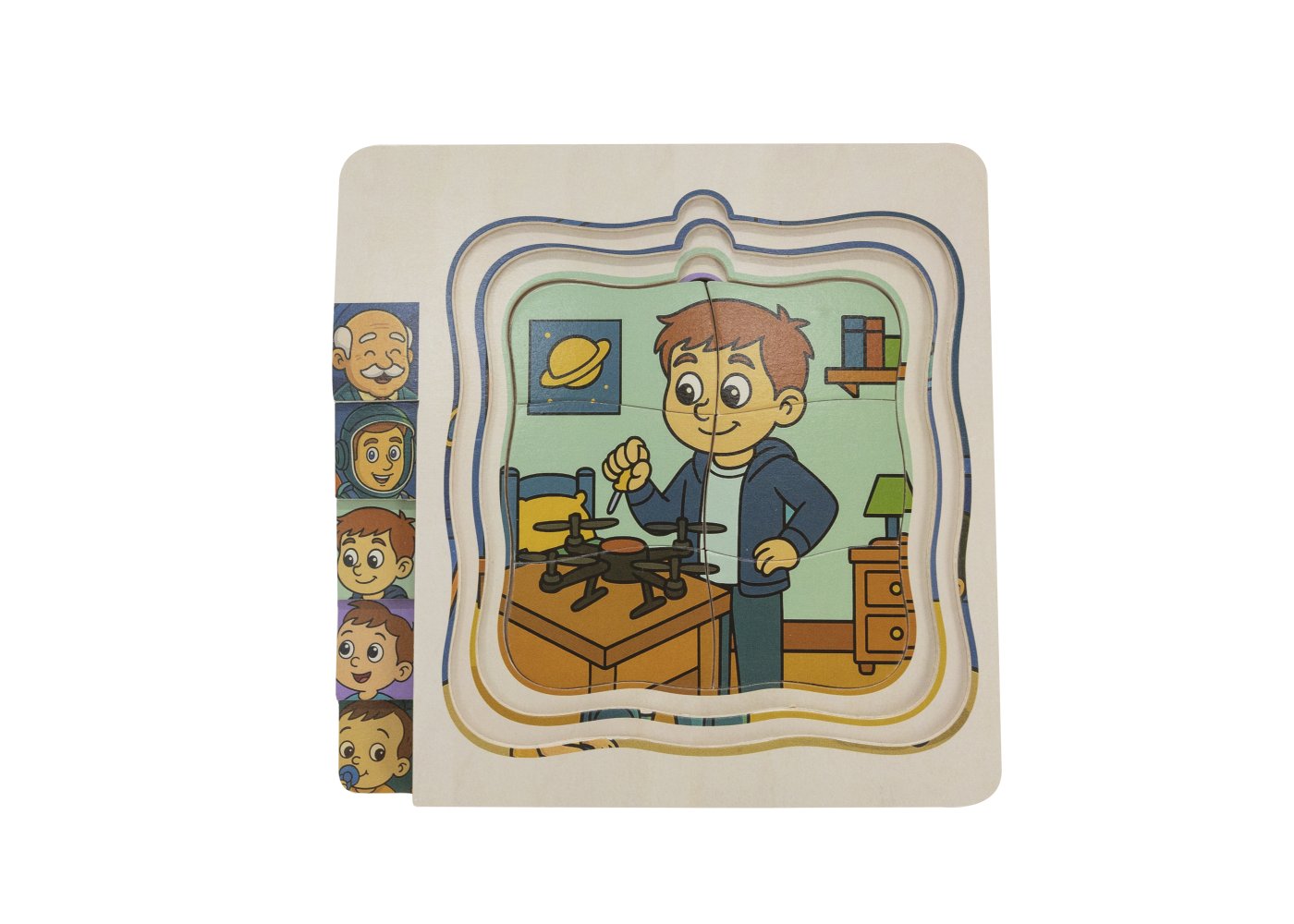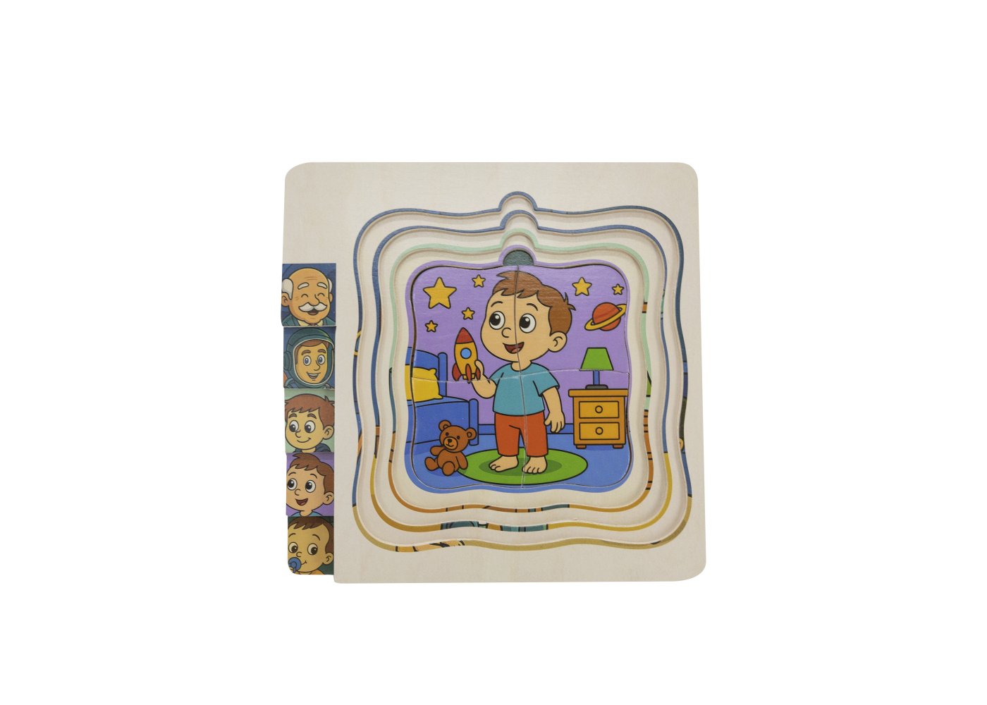 Lager för lager följer pusslet pojkens livsresa – från barndomens nyfikenhet till vuxenlivets möjligheter. Varje lager ger barnet en ny tid att upptäcka och inbjuder till lek, fantasi och samtal om drömmar.