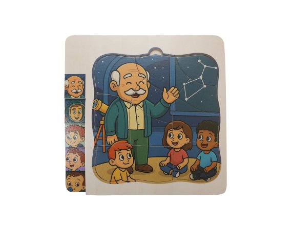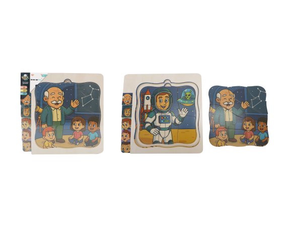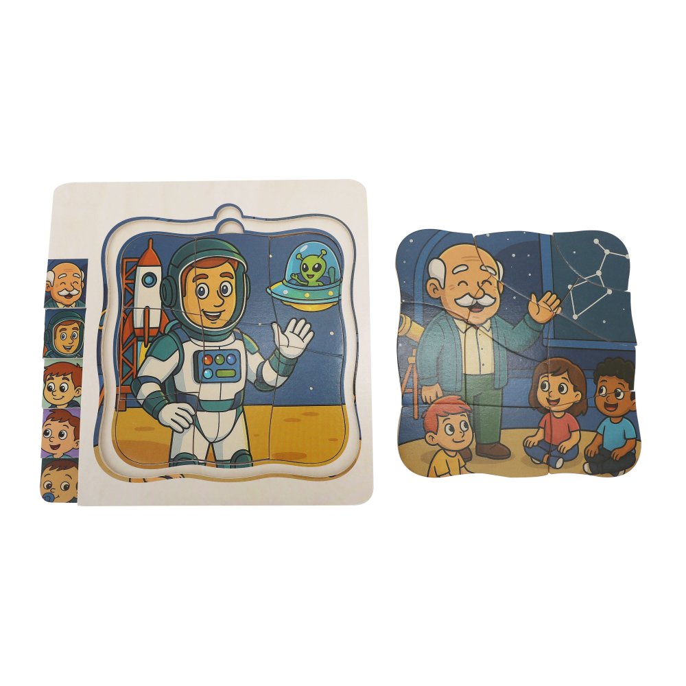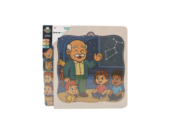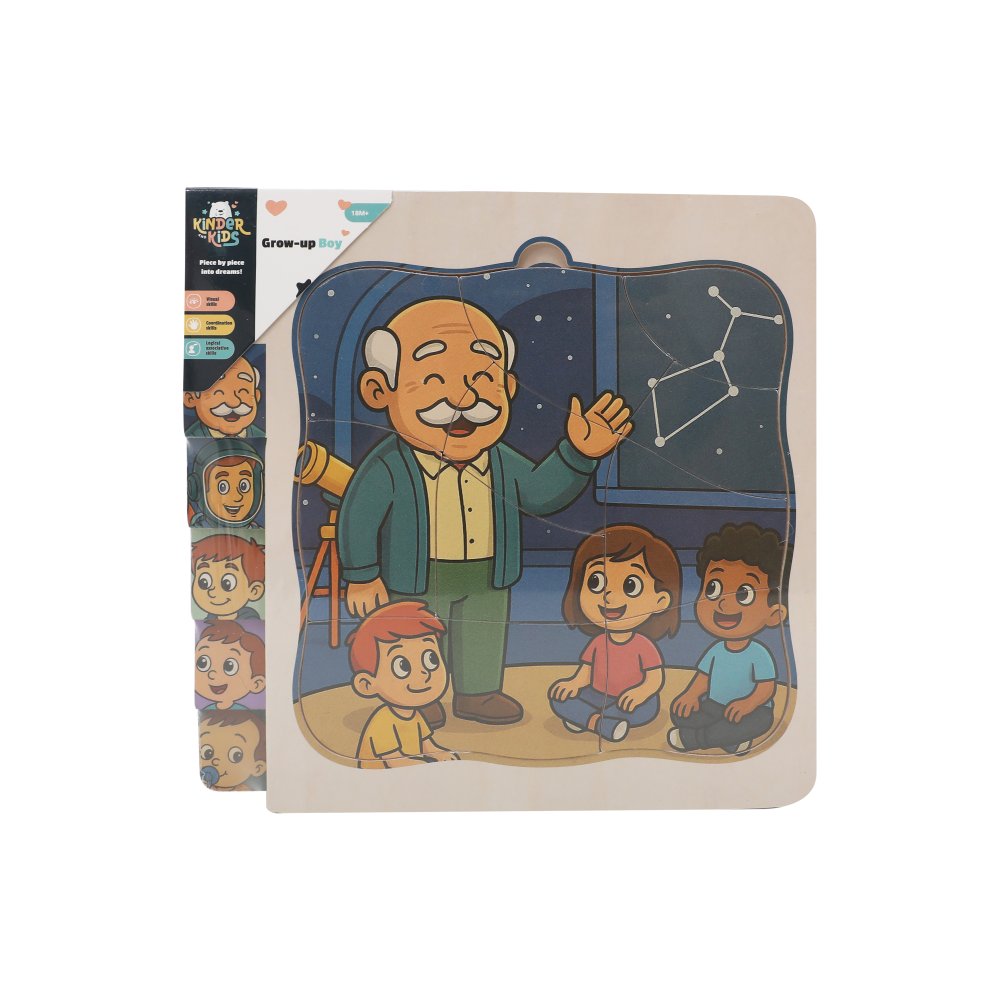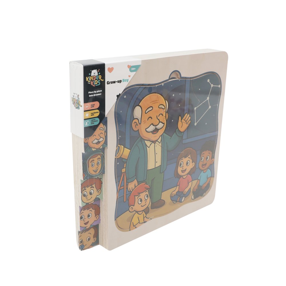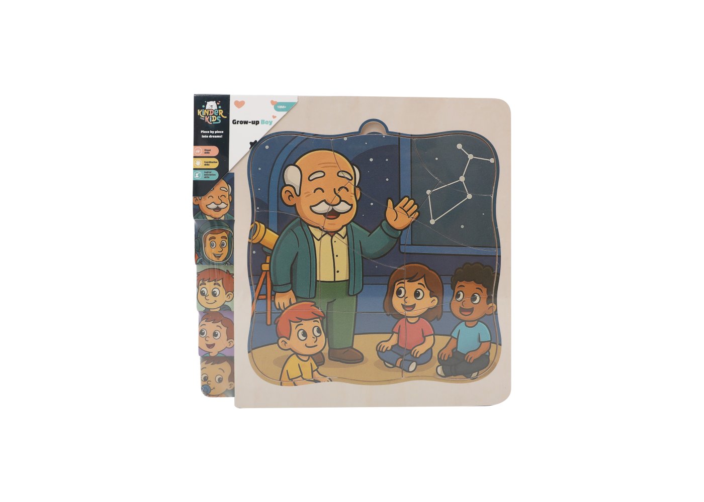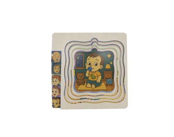 Lager för lager följer pusslet pojkens livsresa – från barndomens nyfikenhet till vuxenlivets möjligheter. Varje lager ger barnet en ny tid att upptäcka och inbjuder till lek, fantasi och samtal om drömmar.