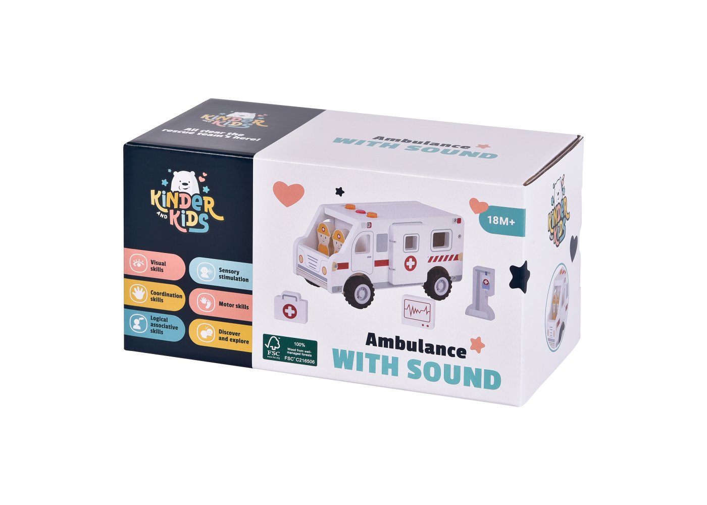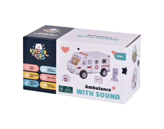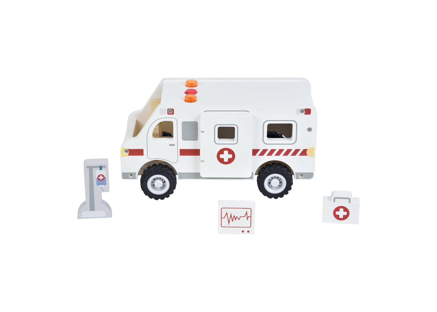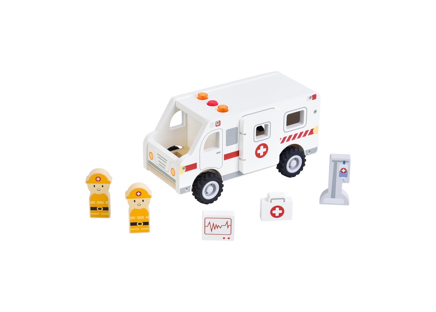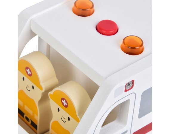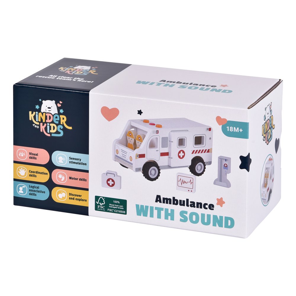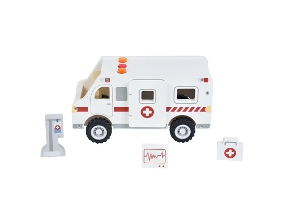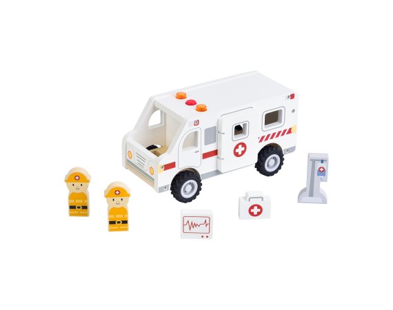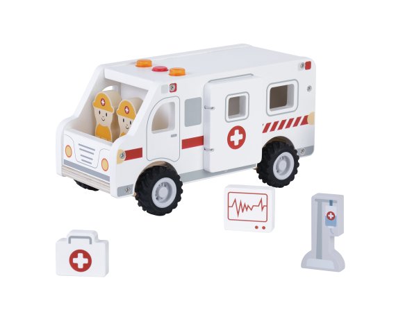 När ambulansen susar förbi med ljus och ljud blir leken genast mer spännande. Barnen kan köra räddningstjänst, rädda patienter och ta dem säkert till sjukhuset. Setet är tillverkat av certifierat trä och innehåller både figurer och utrustning som gör leken levande.