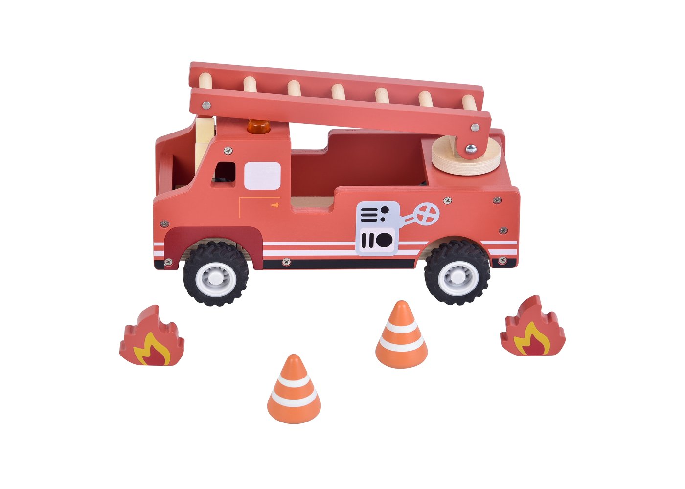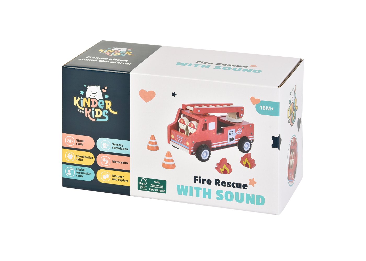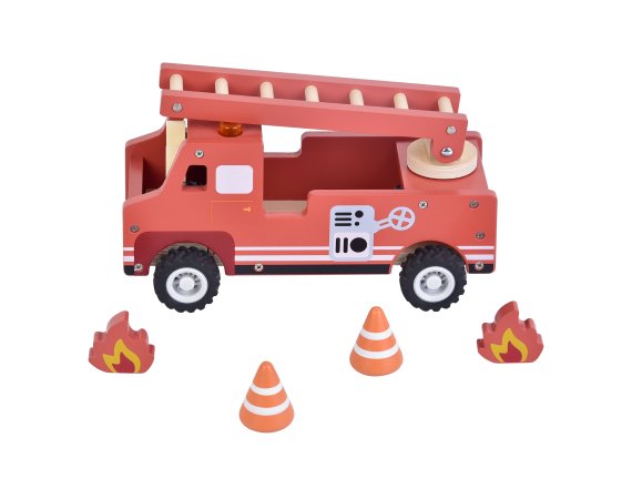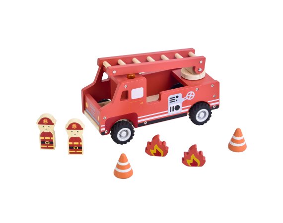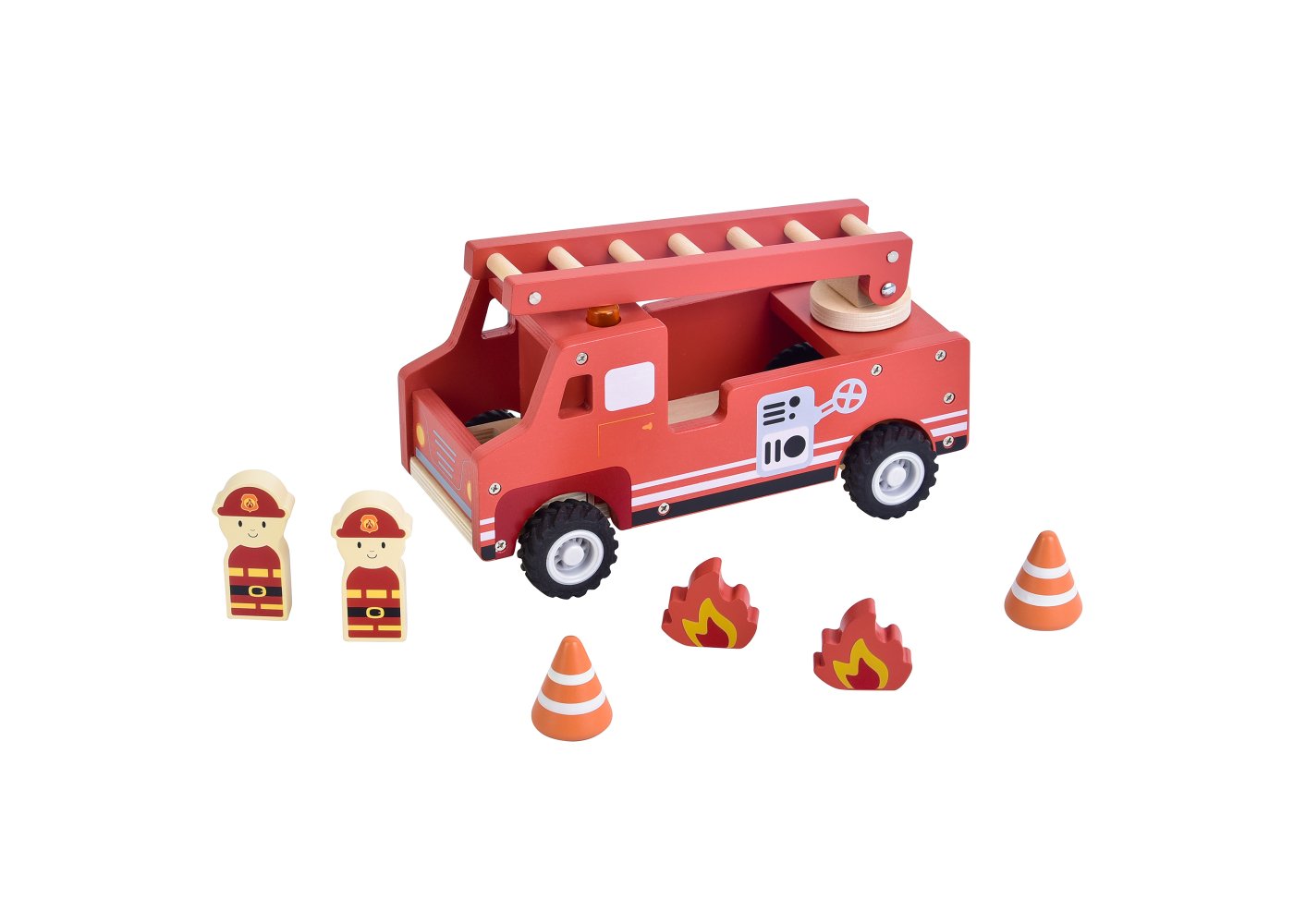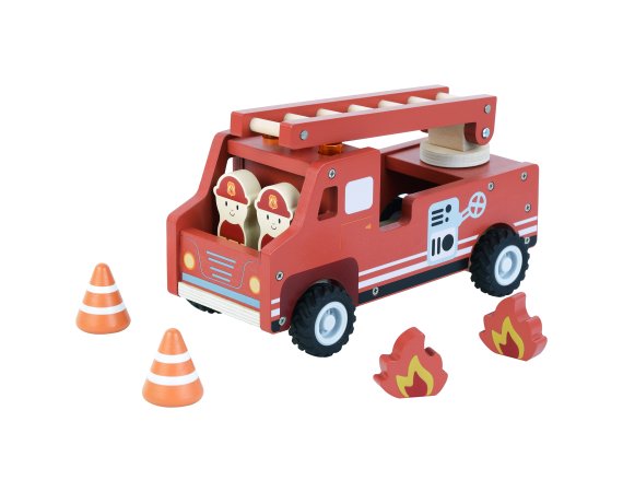När larmet går och brandbilen kör iväg med ljud och stege blir leken snabbt dramatisk. Barnen kan flytta ut, släcka bränder och rädda dagen tillsammans med de små brandmännen. Setet i certifierat trä innehåller även kottar och lågor som gör leken extra rolig och realistisk.