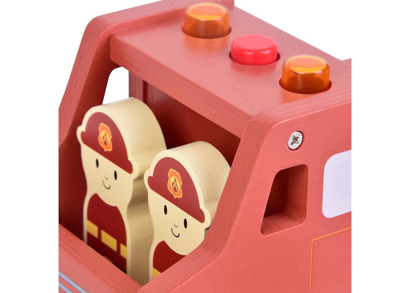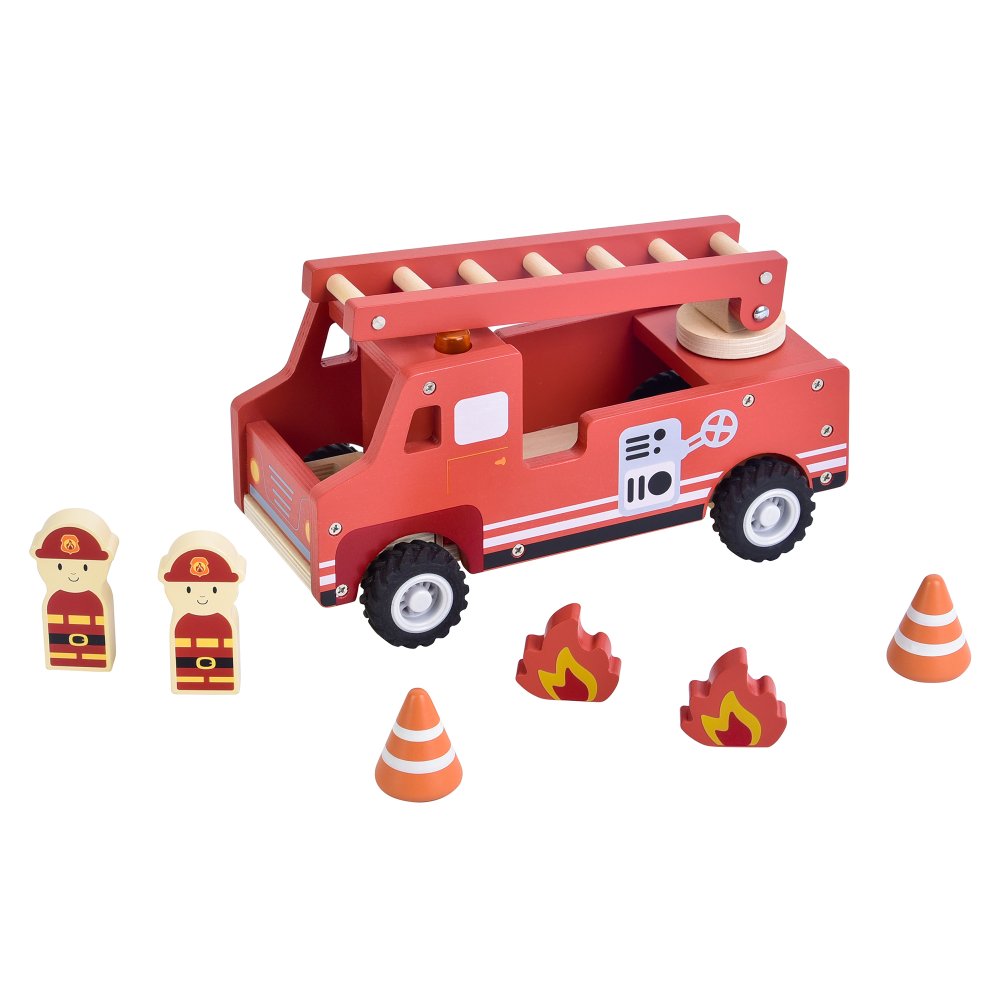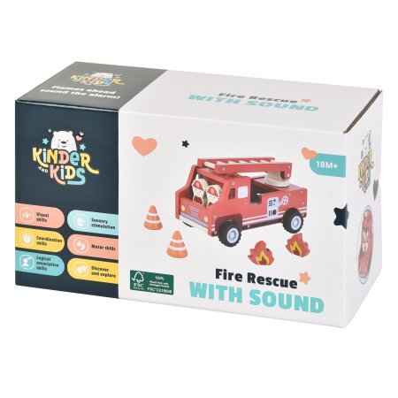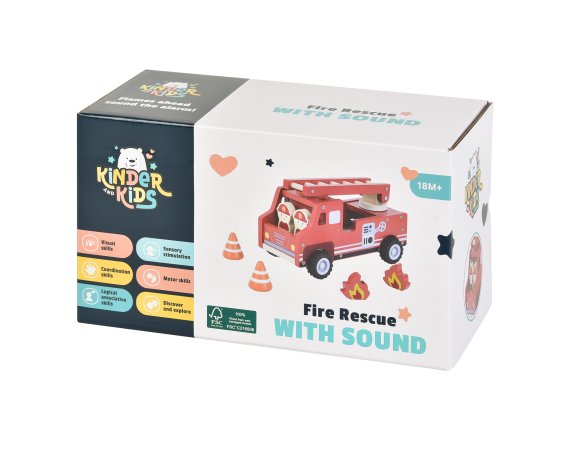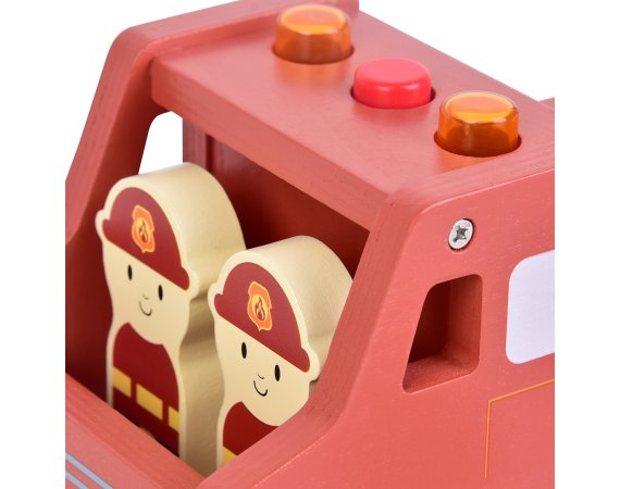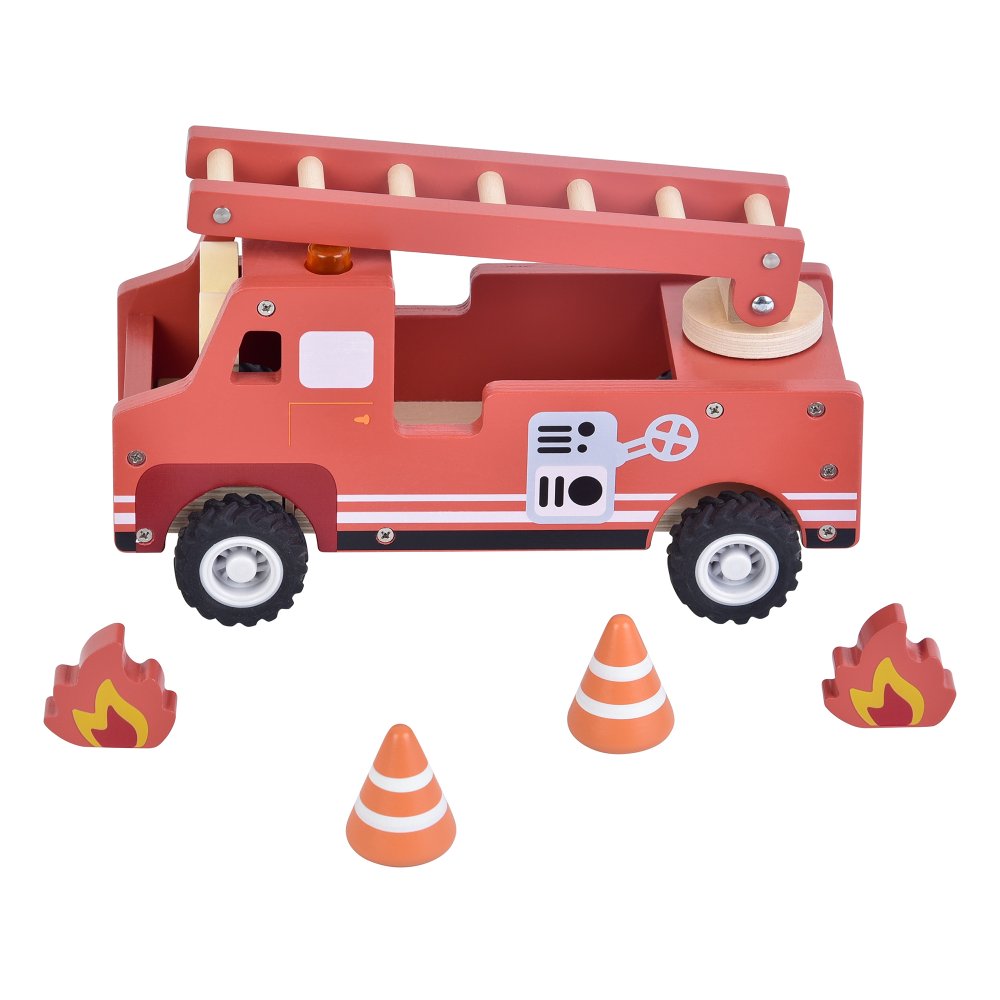 När larmet går och brandbilen kör iväg med ljud och stege blir leken snabbt dramatisk. Barnen kan flytta ut, släcka bränder och rädda dagen tillsammans med de små brandmännen. Setet i certifierat trä innehåller även kottar och lågor som gör leken extra rolig och realistisk.