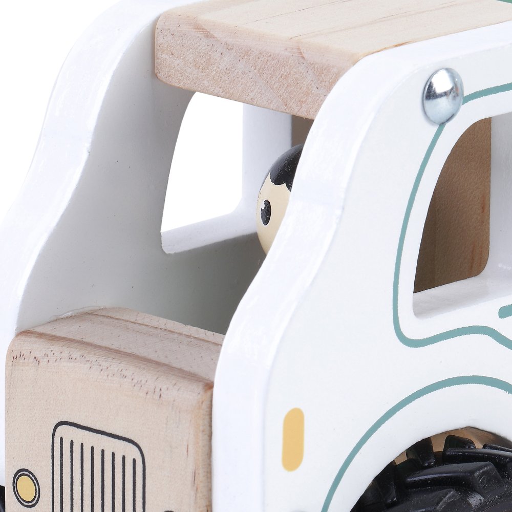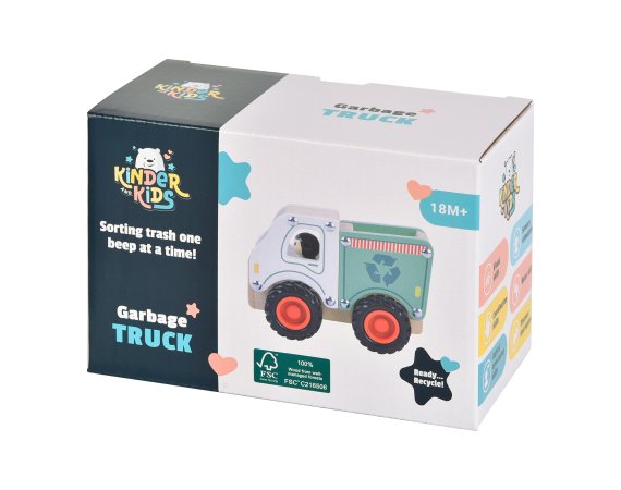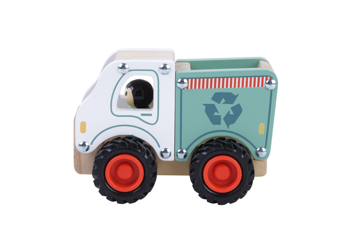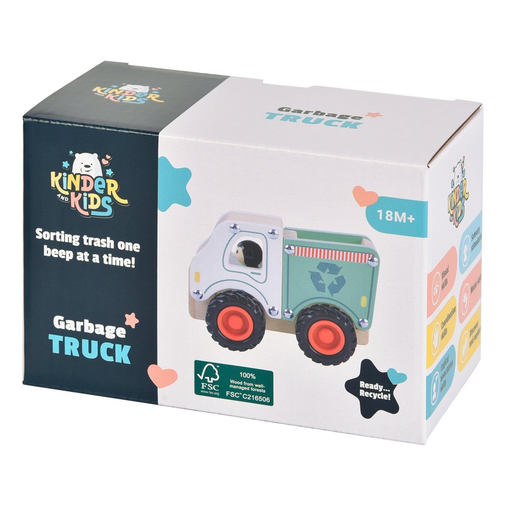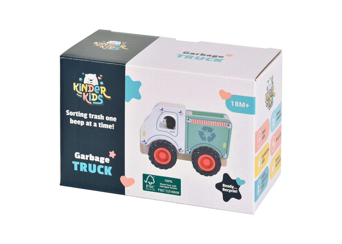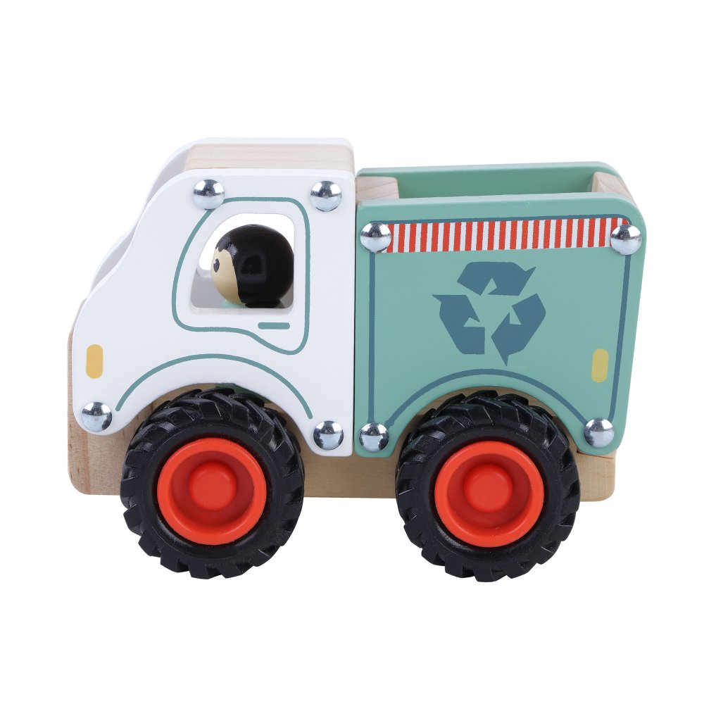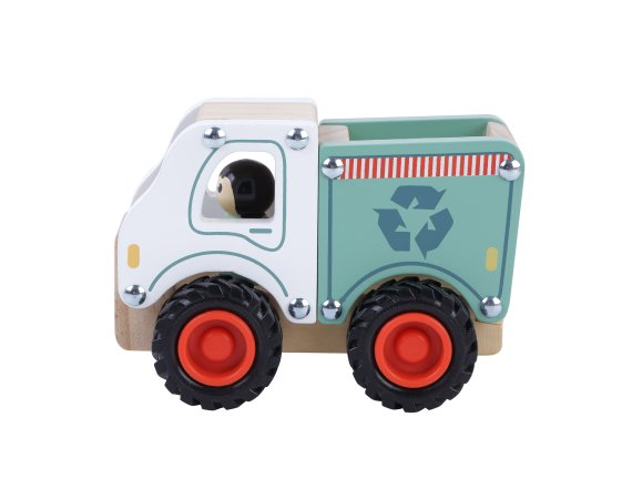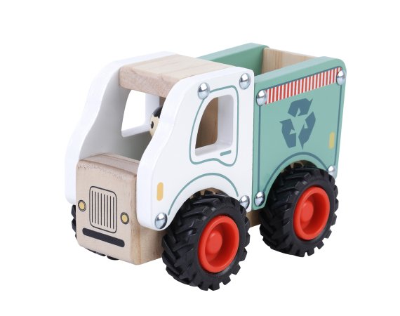 En vacker grön sopbil i trä som står redo att köra genom staden och samla in sopor. Bilen har stora hjul som gör den lätt att köra runt – både på golvet och på mattan.
