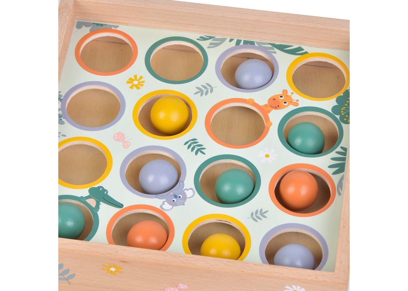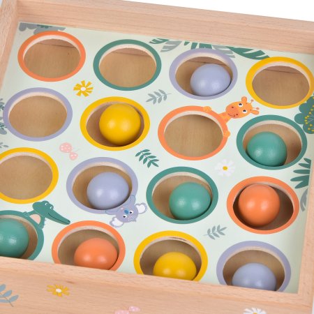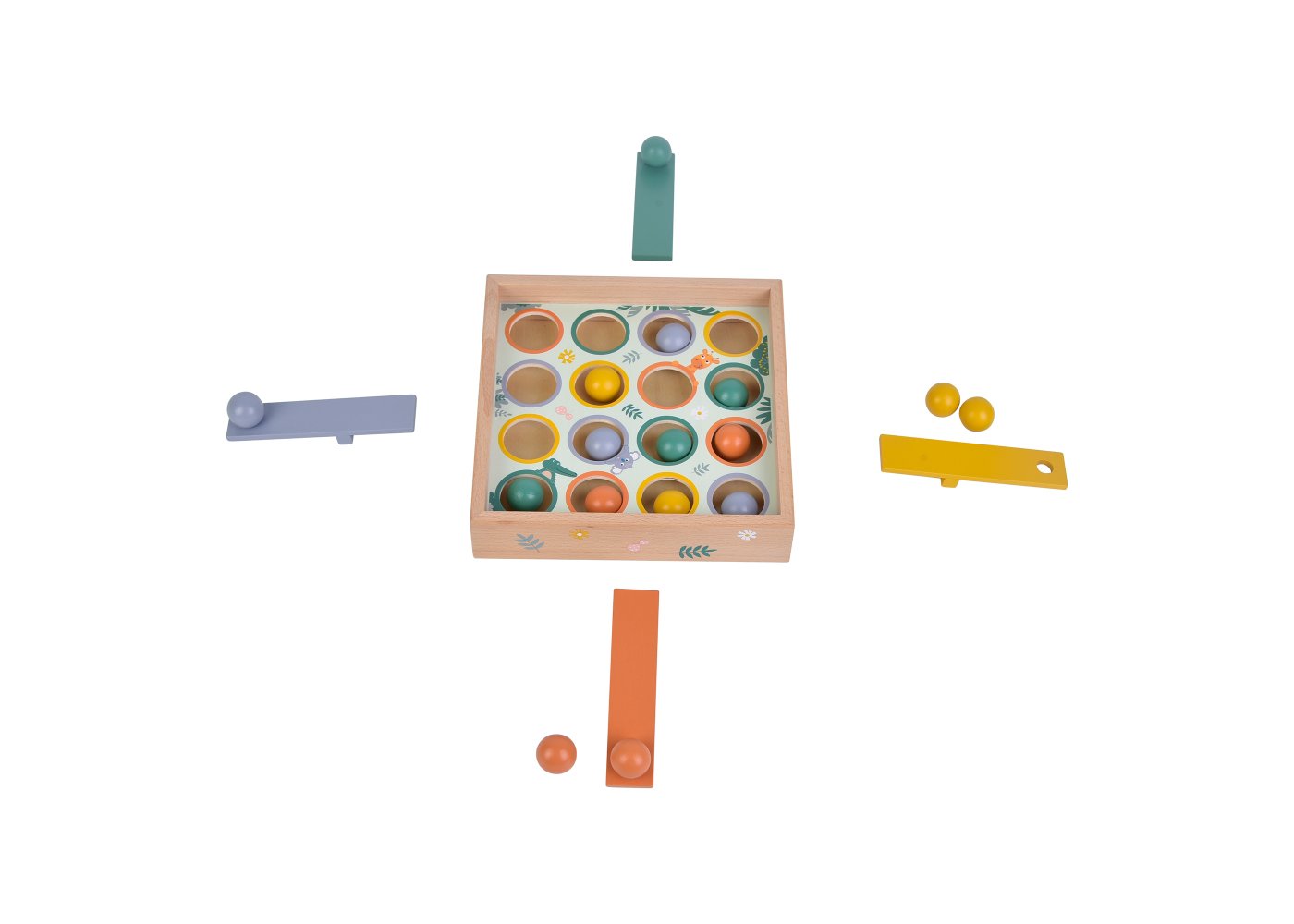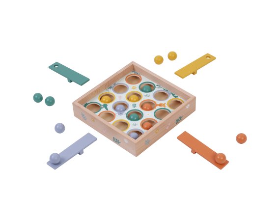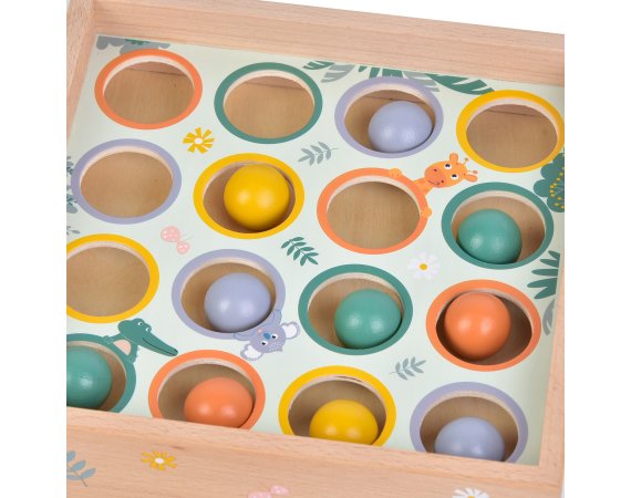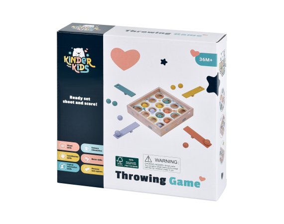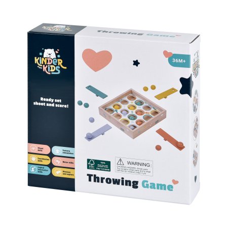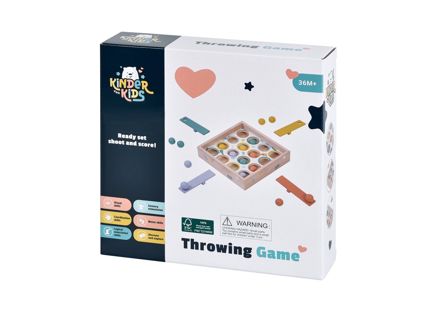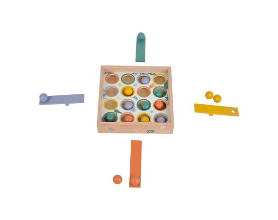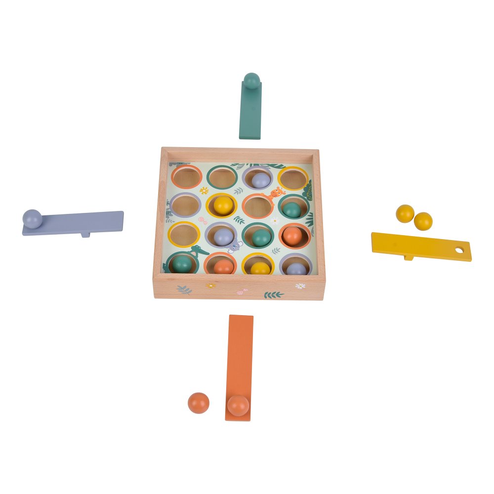 Ett underhållande kastspel i trä där barnen kan tävla om att träffa hålen och samla flest poäng. De färgglada kulorna avfyras från små ramper, och det är viktigt att kontrollera både kraft och precision när kulorna avfyras.