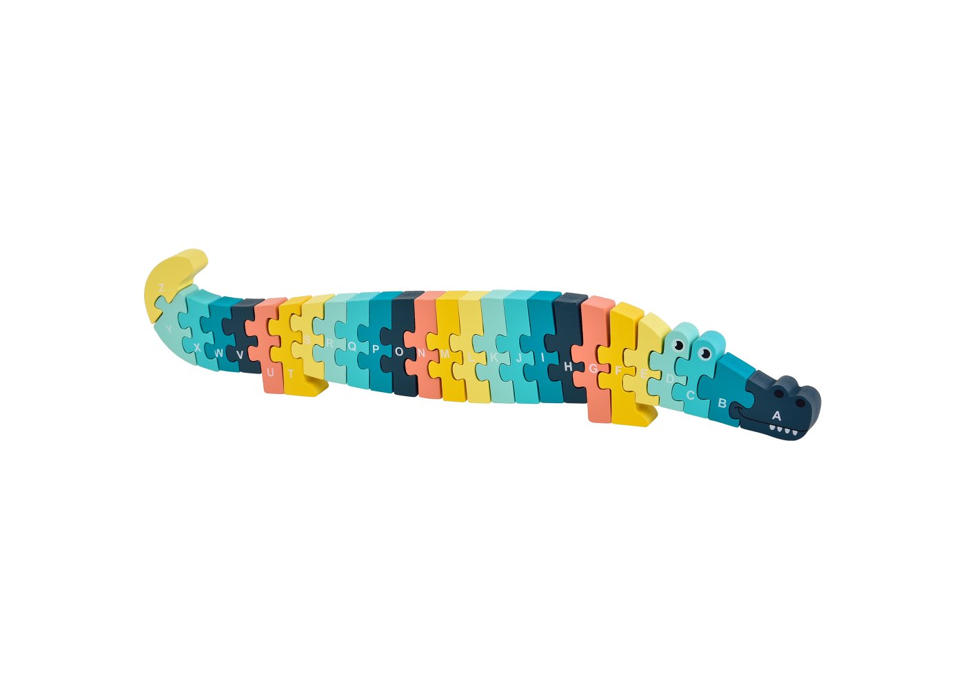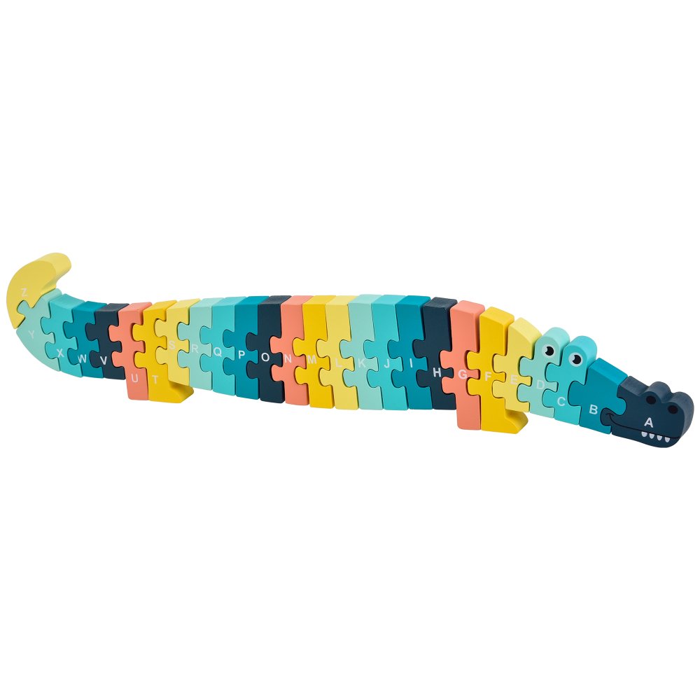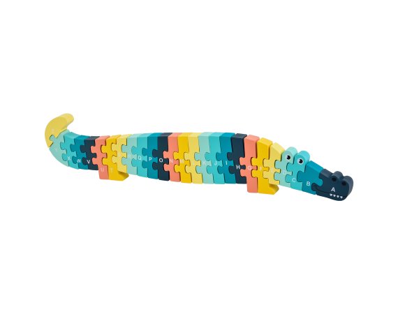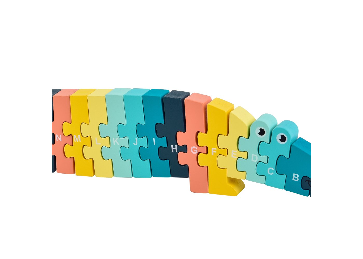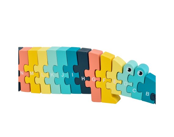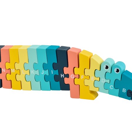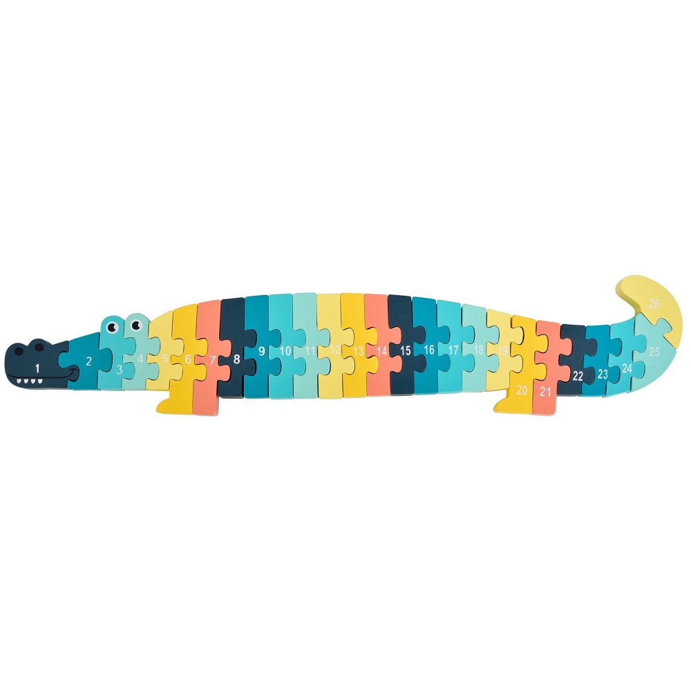 En krokodil som kan lära barnet både siffror och bokstäver gör leken extra spännande. Pusslet är vändbart med siffror på ena sidan och alfabetet på den andra, så att barnet kan öva på flera färdigheter i samma spel.