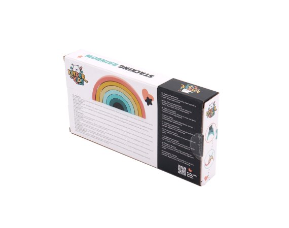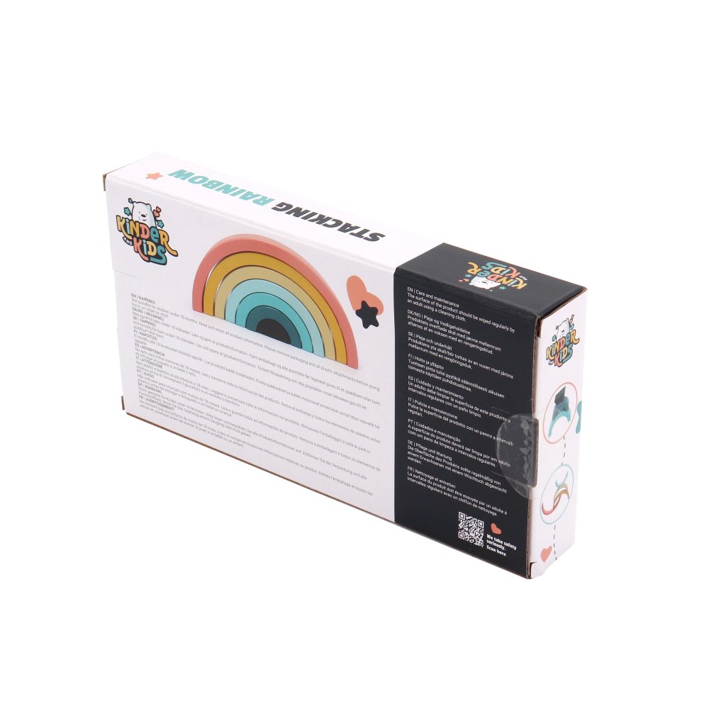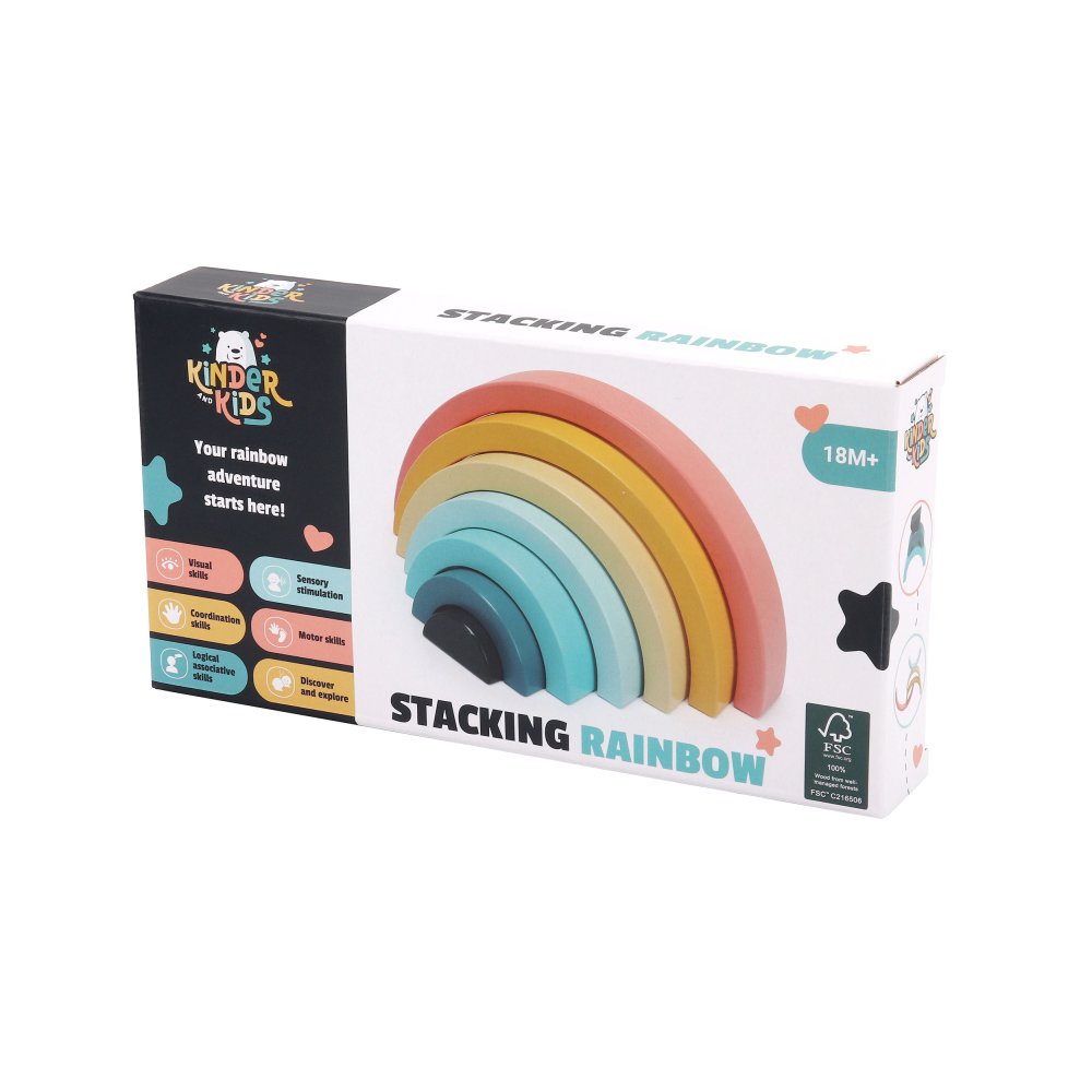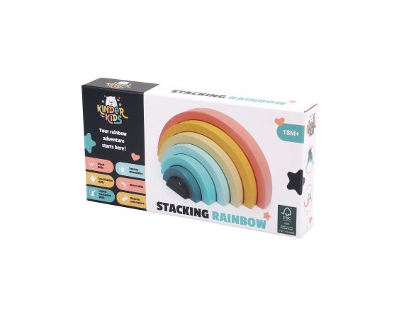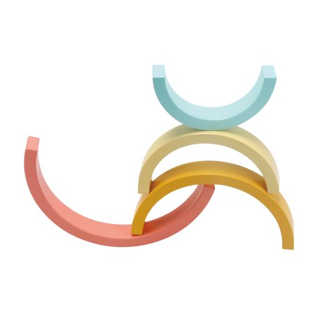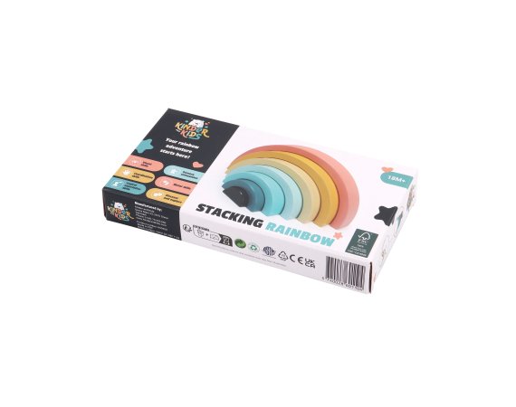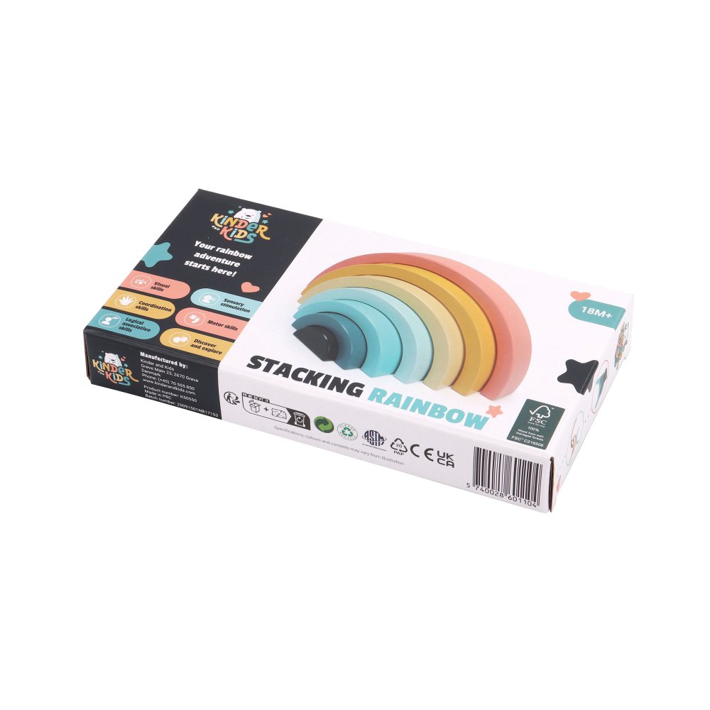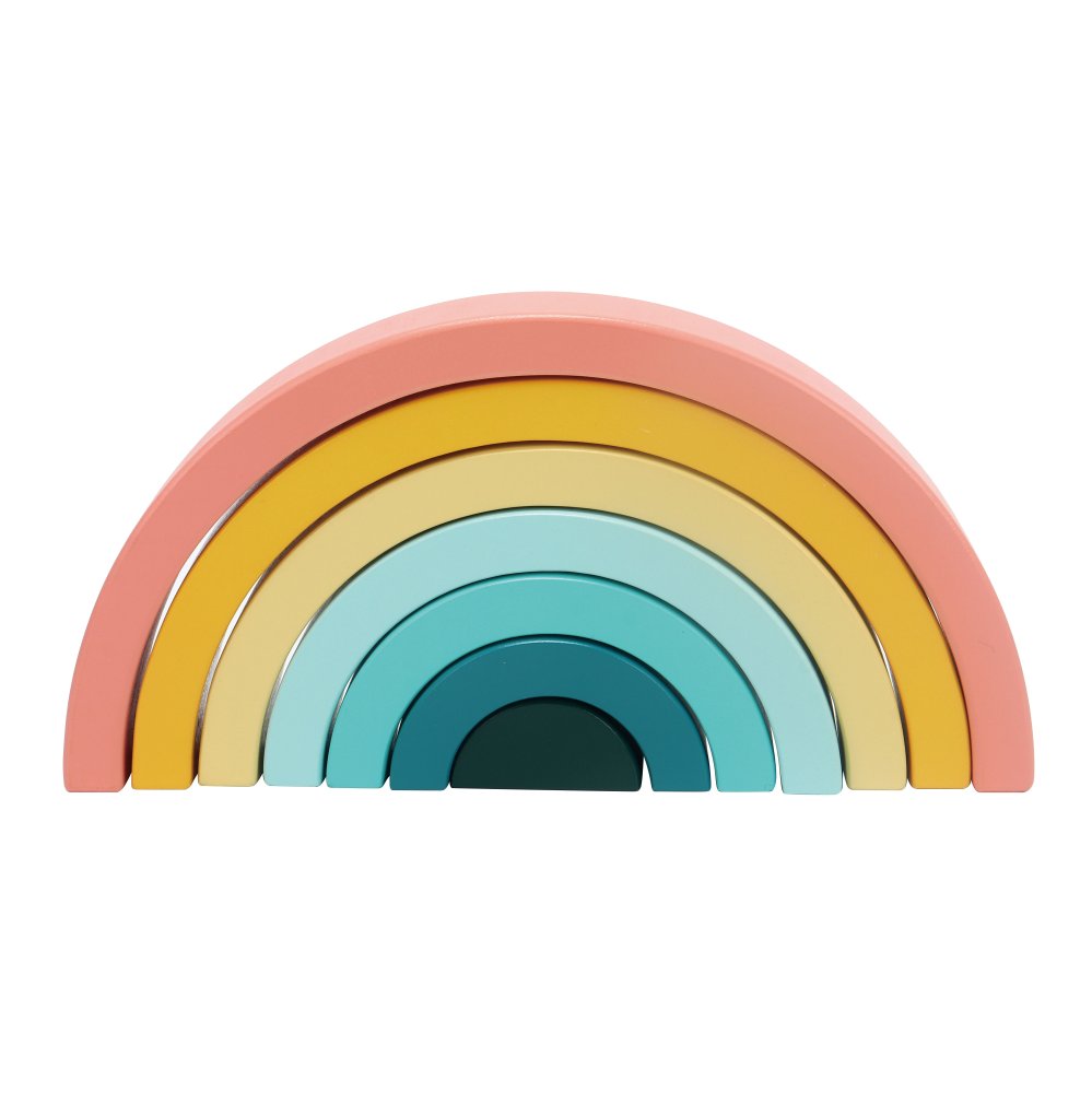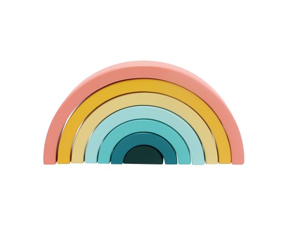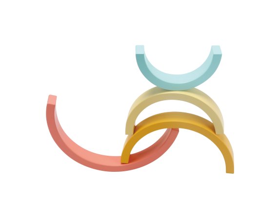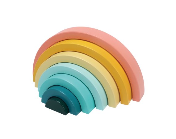 Den enkla designen och de mjuka färgerna gör regnbågen både dekorativ och rolig att leka med. De yngsta kan öva på att stapla och balansera, medan de äldre barnen hittar på lekar där bågarna blir en del av deras egna berättelser.