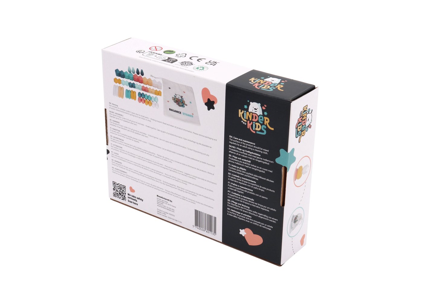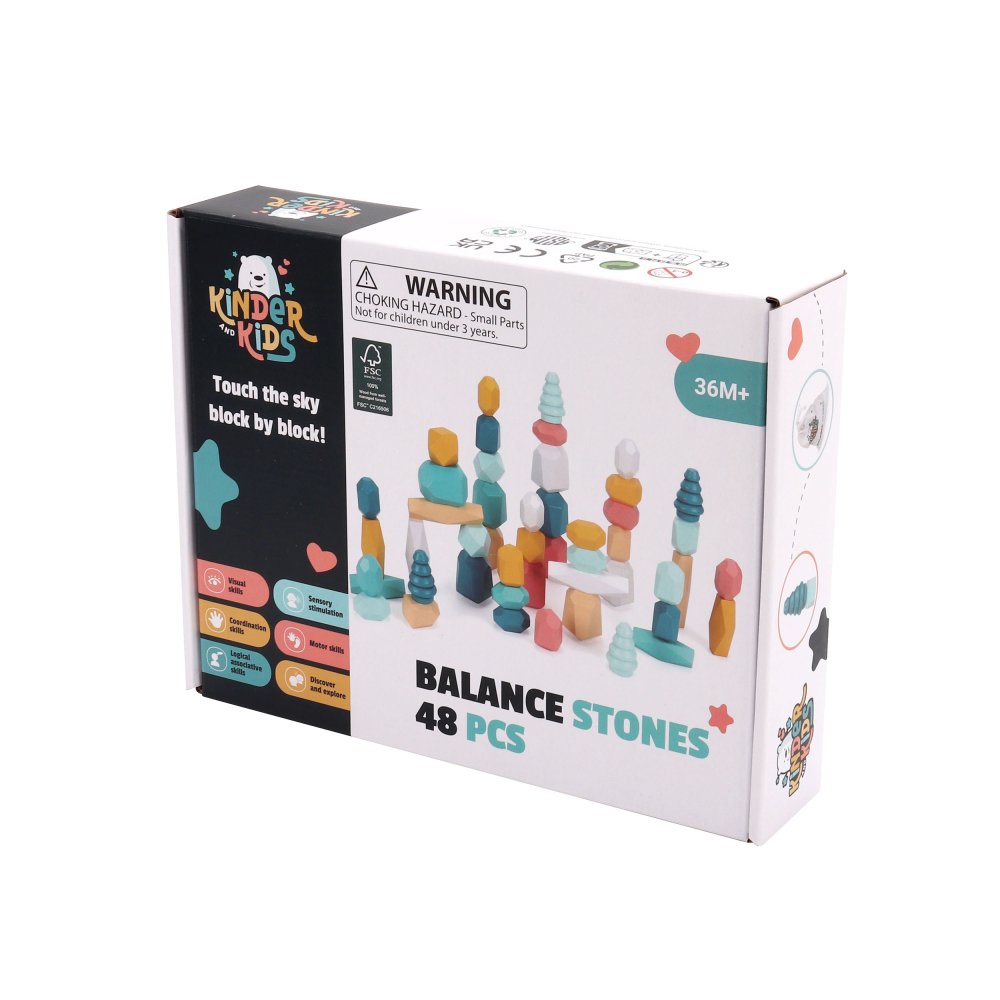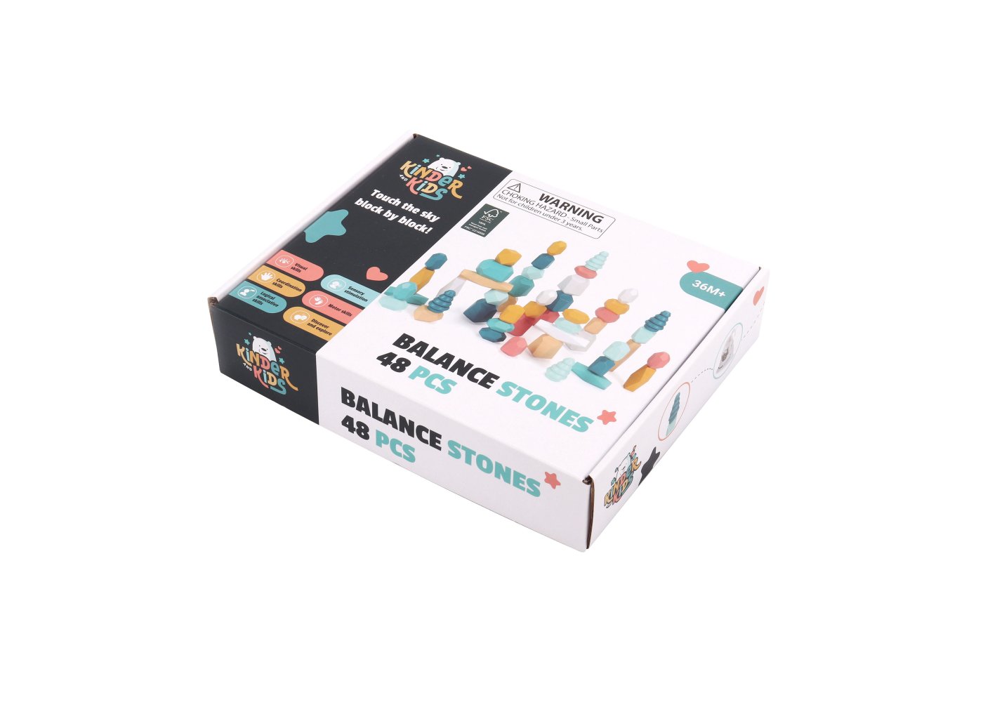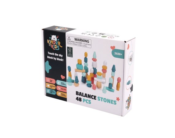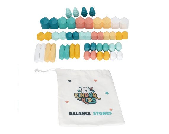 Kinder and Kids Balance Stone, 48 delar. är ett certifierat lekset som utmanar både fantasi och finmotorik. De färgglada träteglet har olika former och kan staplas på många sätt – antingen till höga torn, små broar eller helt krokiga konstruktioner som kräver både lugn och precision.