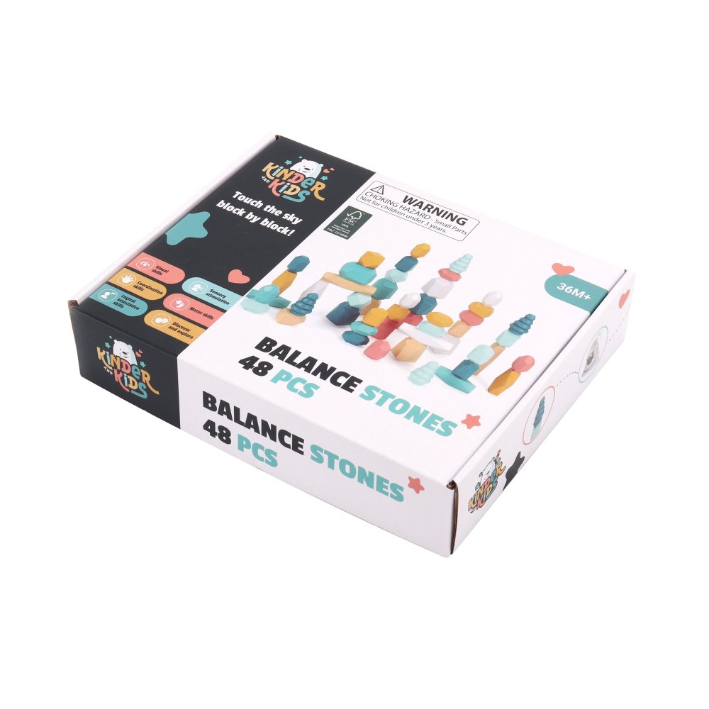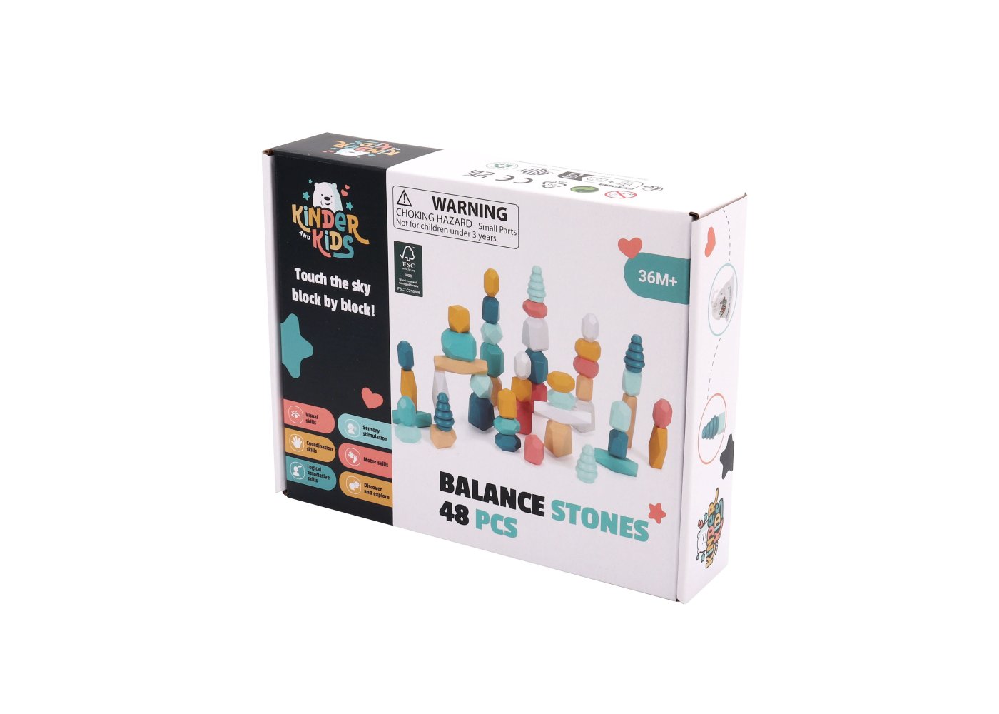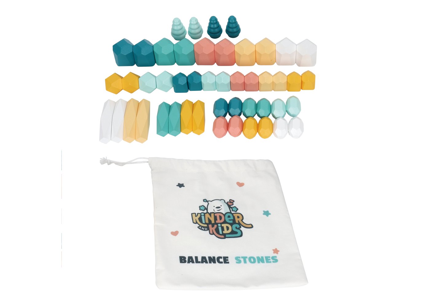 Kinder and Kids Balance Stone, 48 delar. är ett certifierat lekset som utmanar både fantasi och finmotorik. De färgglada träteglet har olika former och kan staplas på många sätt – antingen till höga torn, små broar eller helt krokiga konstruktioner som kräver både lugn och precision.