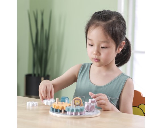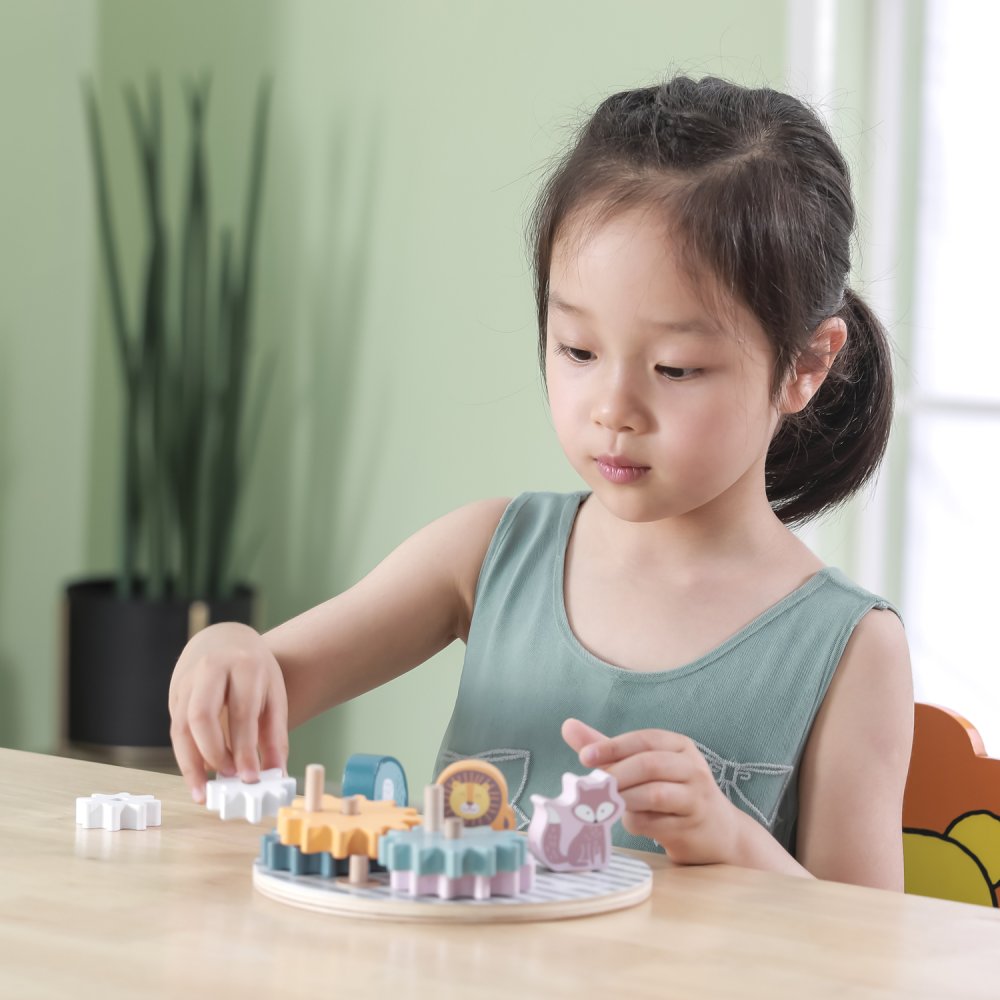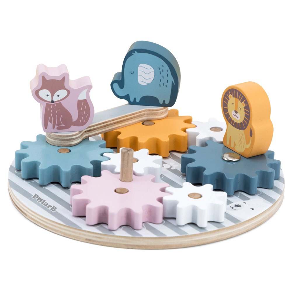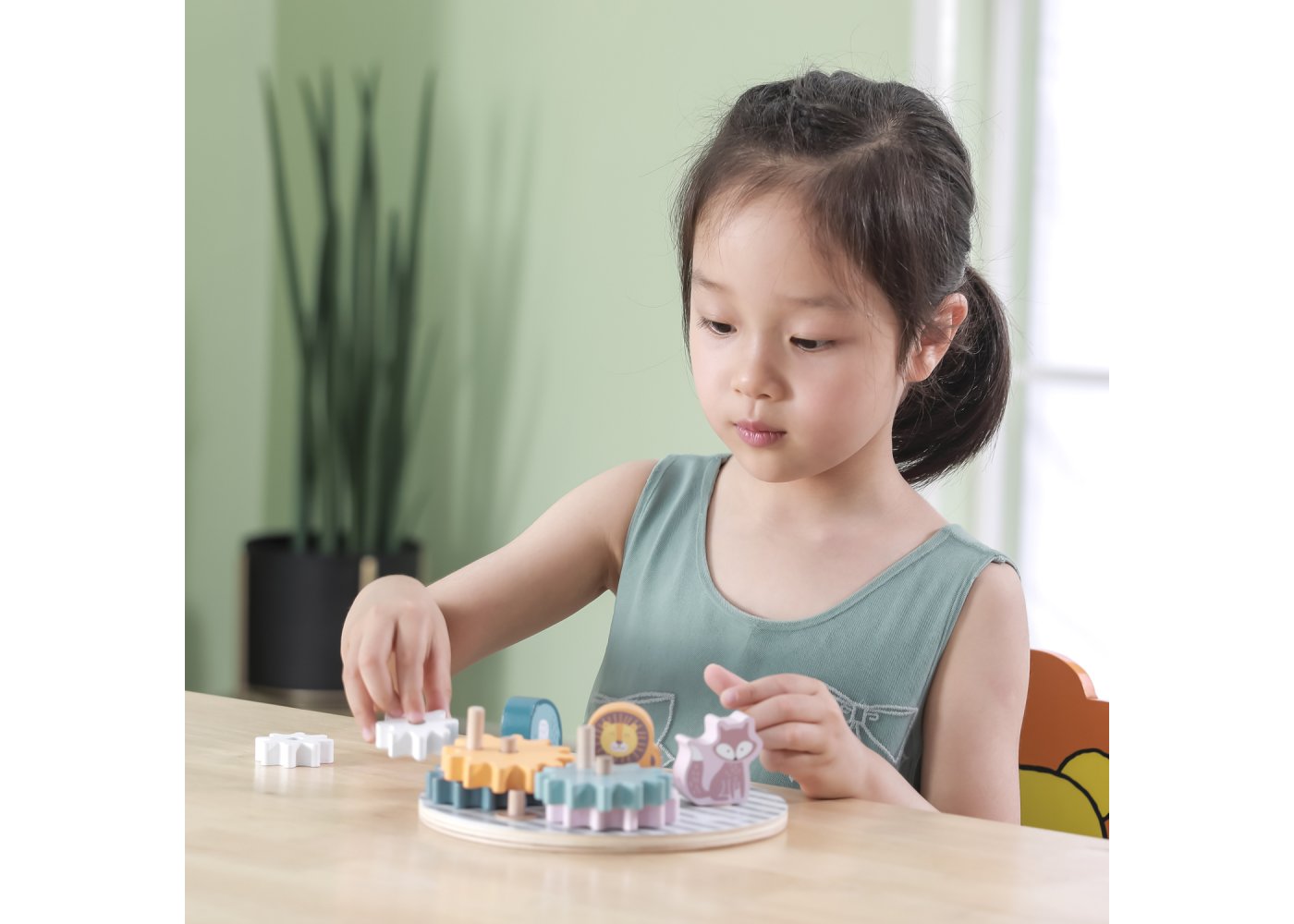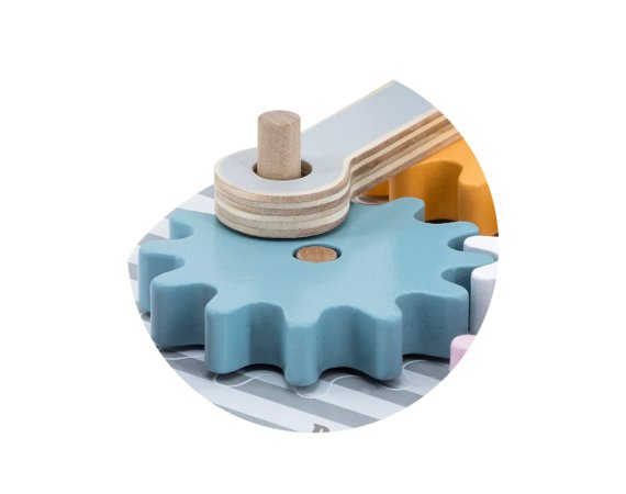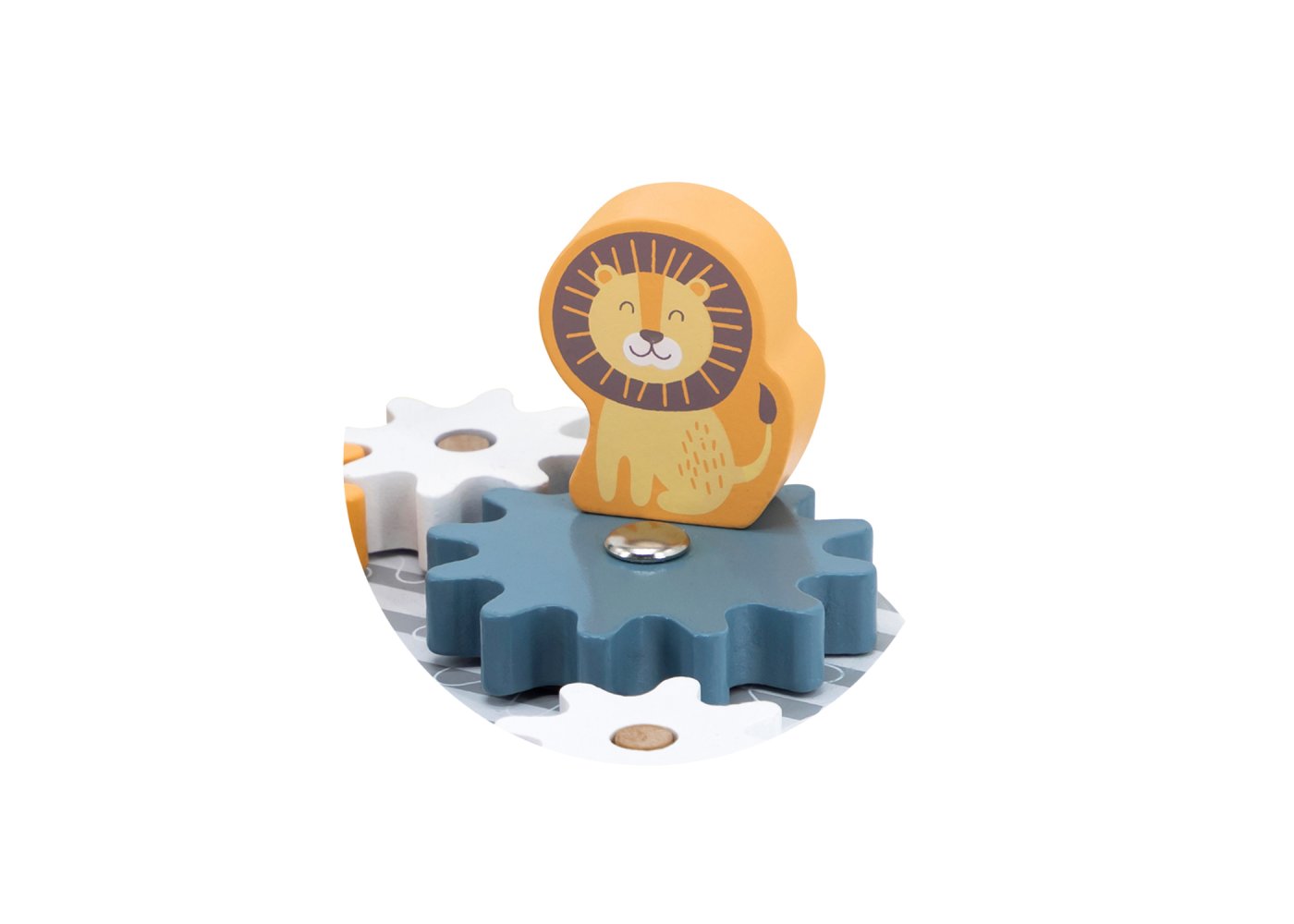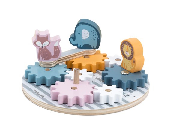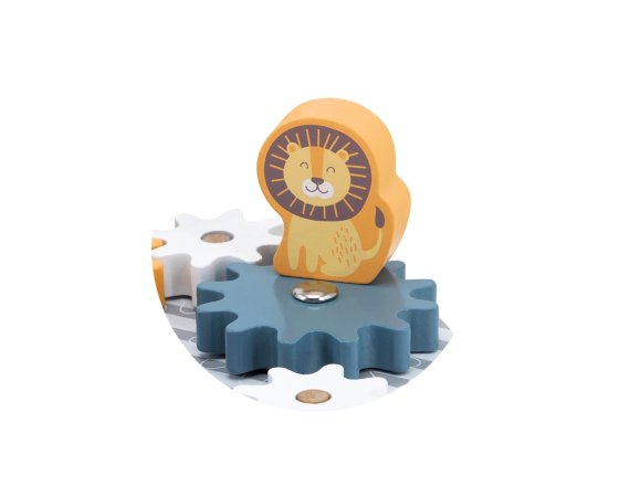 Denna fina motorikbräda i vackra varma färger är underhållande för små barn. Placera kugghjulen på plattan och djuren ovanpå. Det kräver lite arbete, men det blir roligt när djuren snurrar runt. Att leka med kugghjulen främjar barnets motorik.