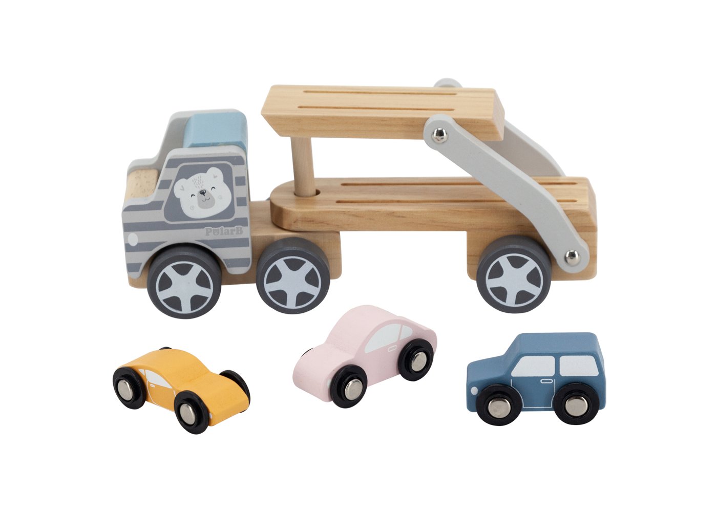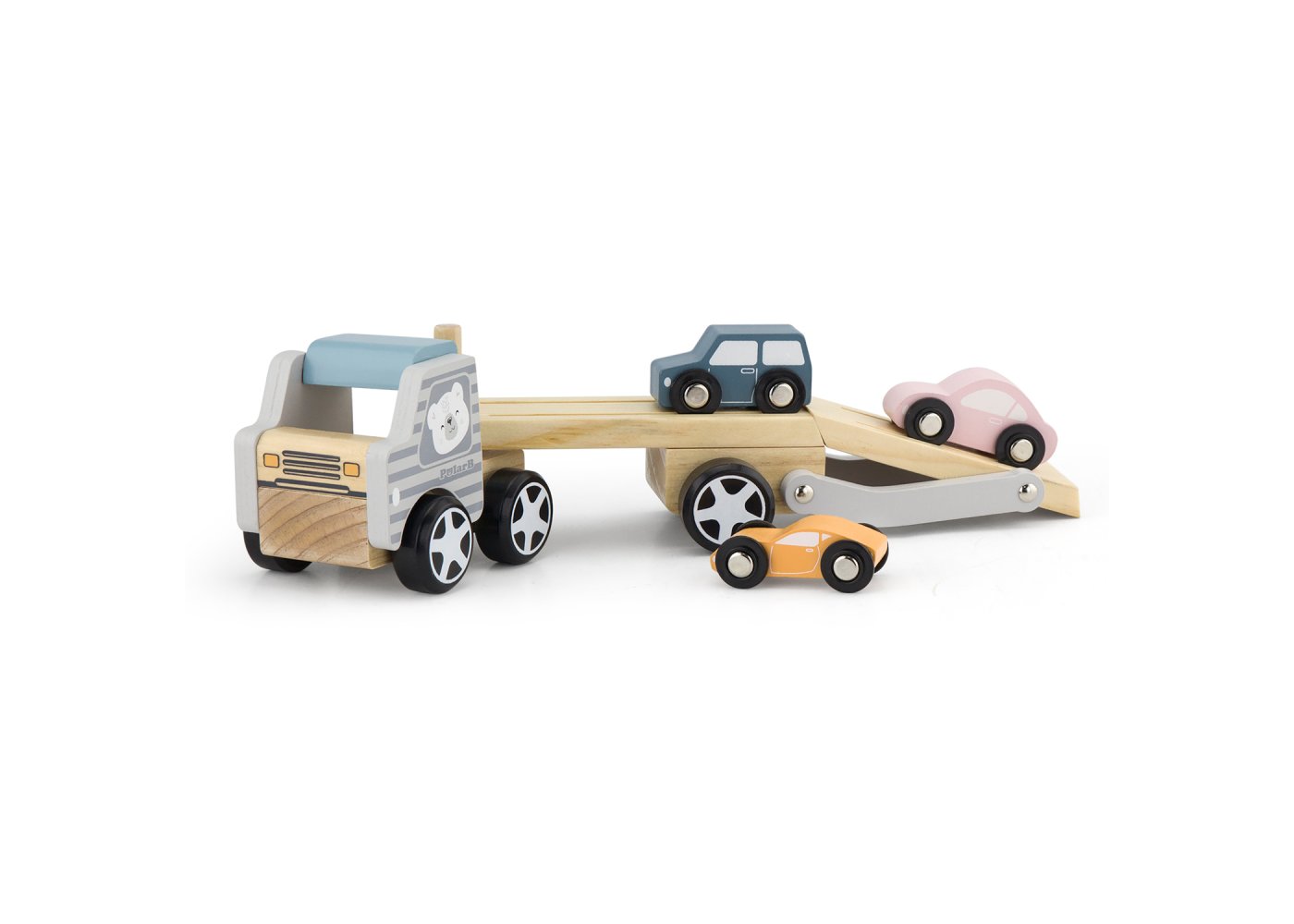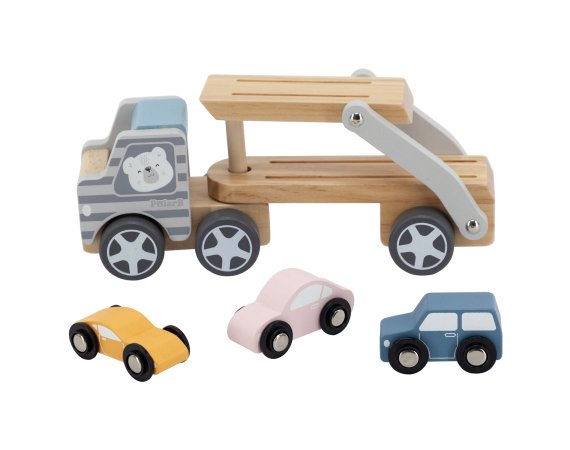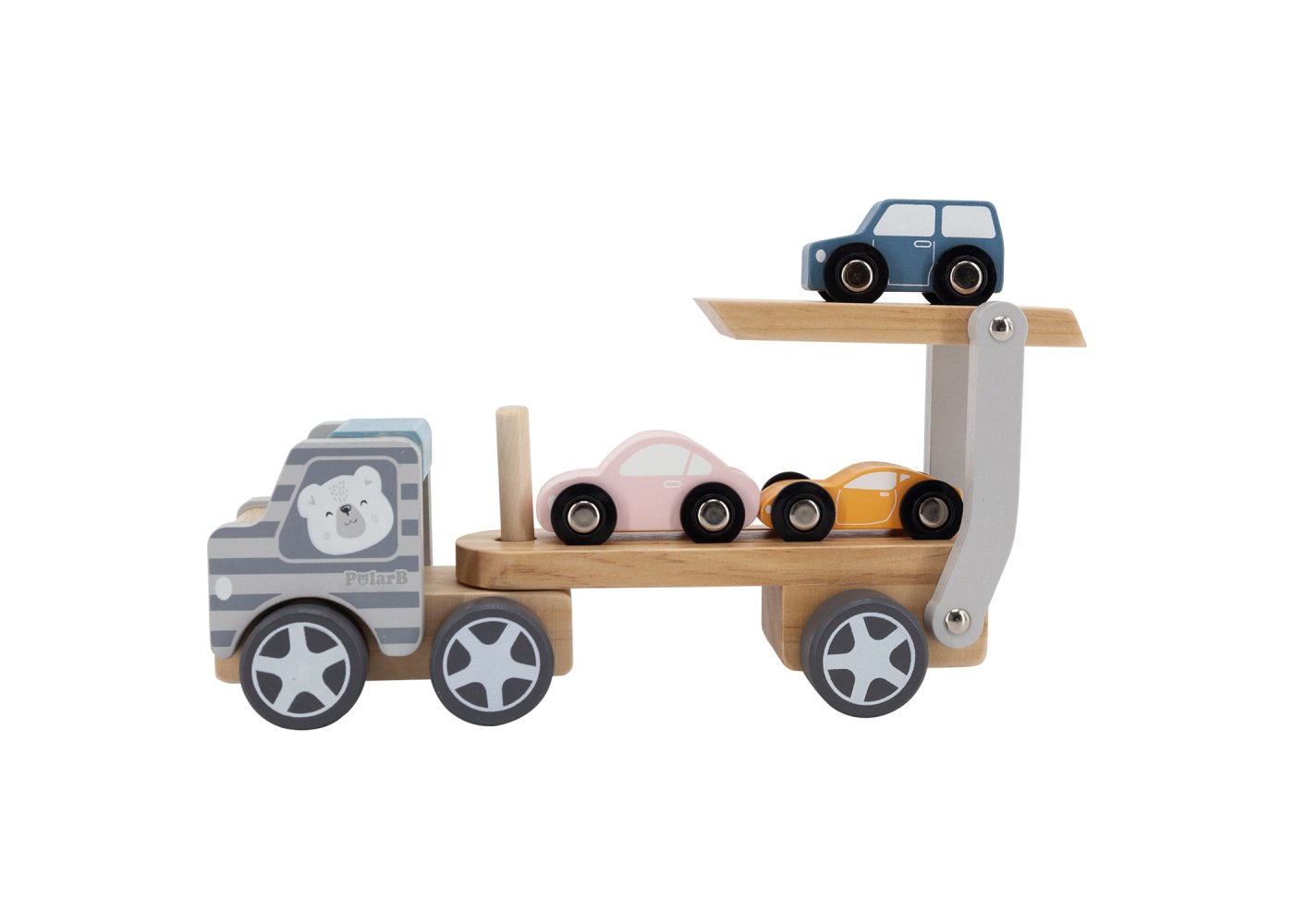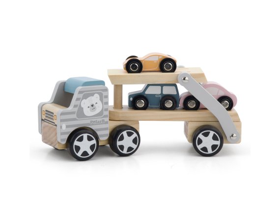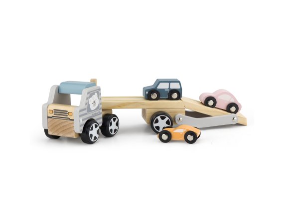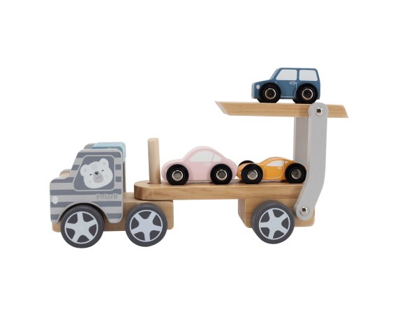 För att kunna leverera nya bilmodeller från A till B behöver du verkligen denna starka biltransportör. Träbilarna körs lätt upp på lastbilen. När bilarna är lastade är det dags att ge sig iväg så att de kan lossas igen!