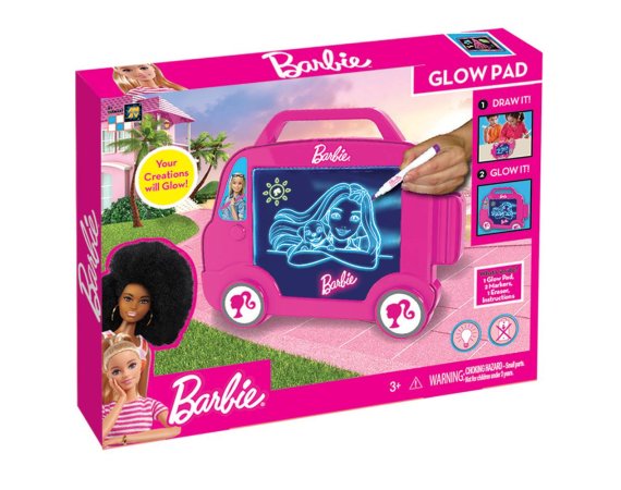 Rita på Barbie 'Camper Van'-stil GLOWPAD med hjälp av de två neonmagiska tuschpennorna och skapa fantastiska motiv och se dem lysa upp i mörkret. Det kommer garanterat imponera på familj och vänner. Ritplattan kan användas för att skapa ett oändligt antal bilder och söta meddelanden.