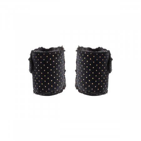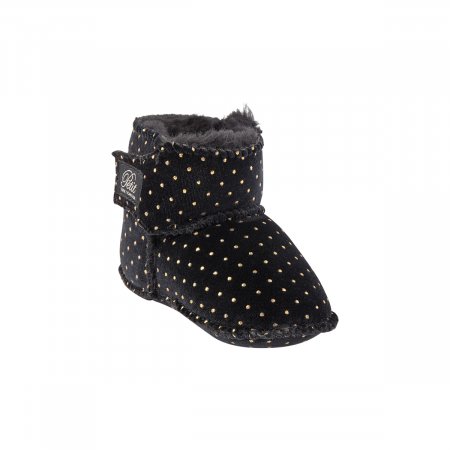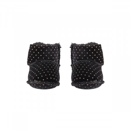 Söta tossor i svart med guldprickar.Tossor med kardborreband som går upp över anklarna. Skorna är fodrade med en mjuk imiterad päls som håller små fötter varma.