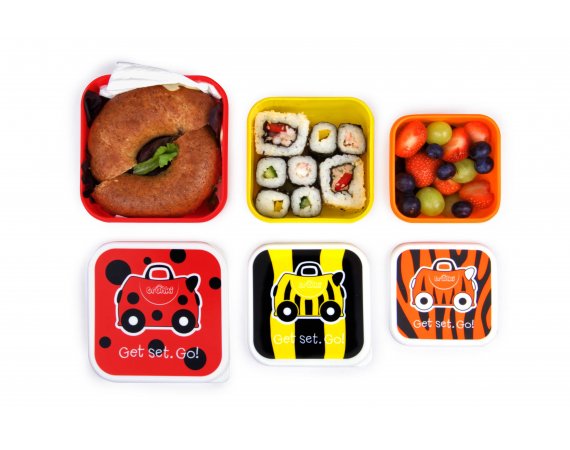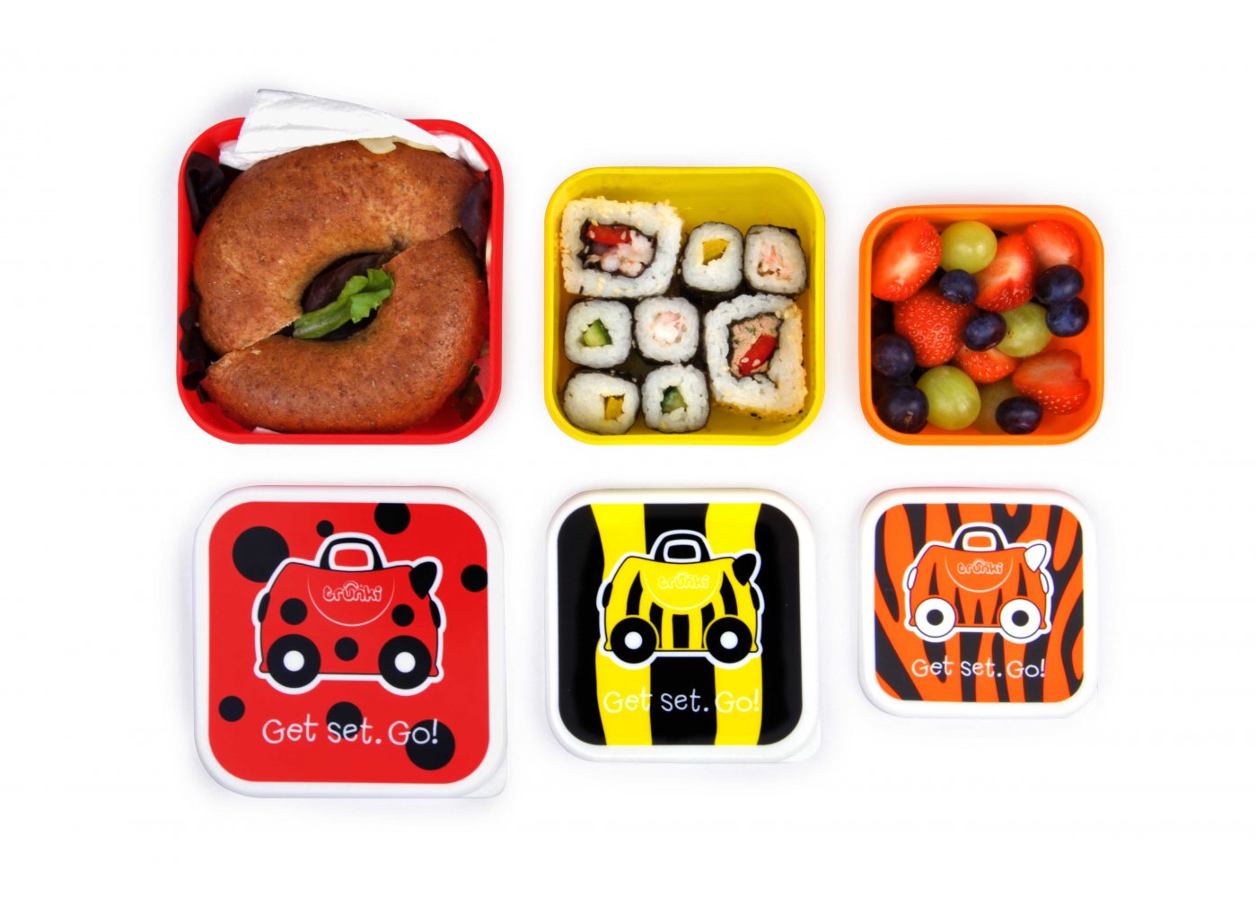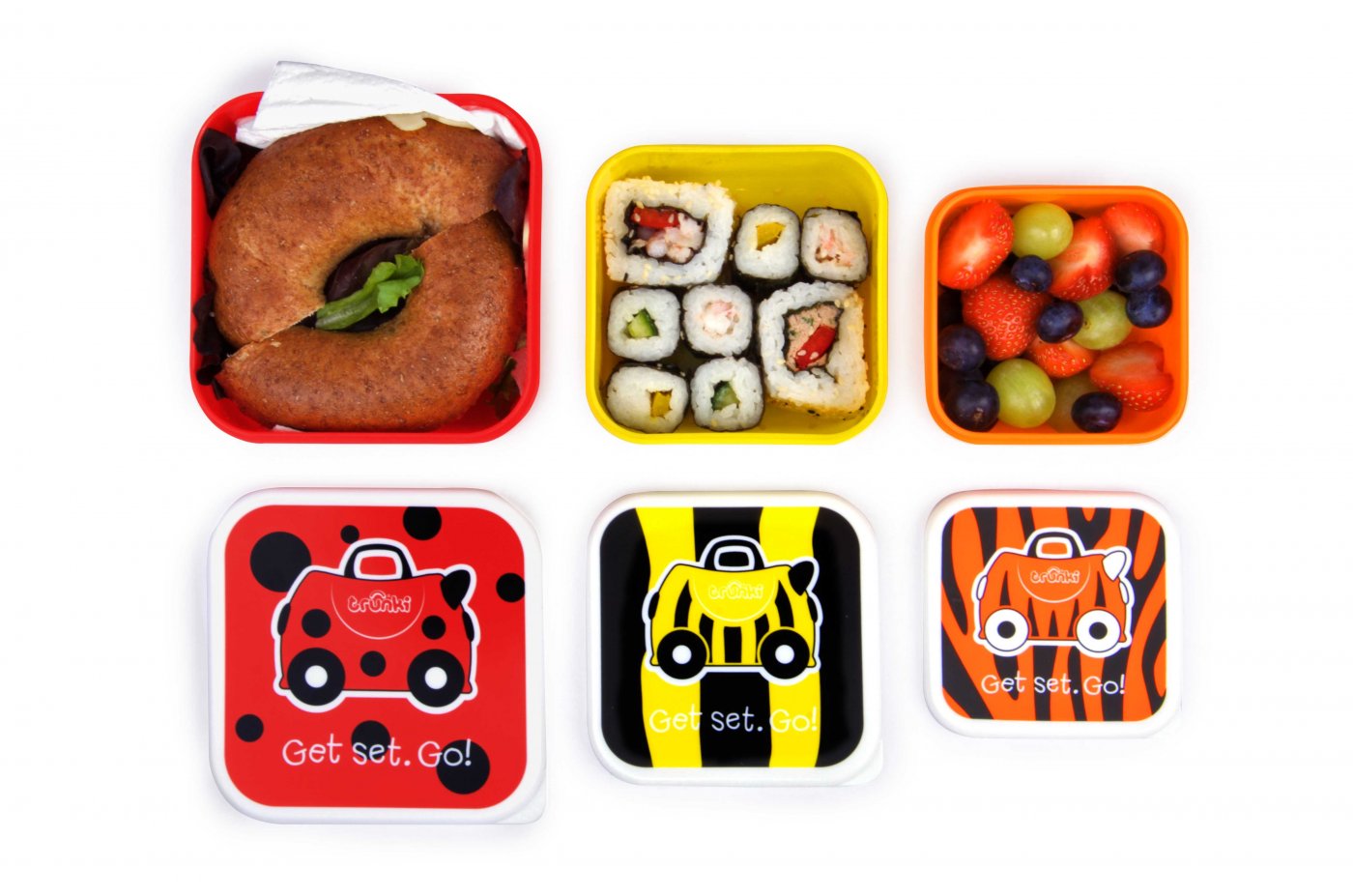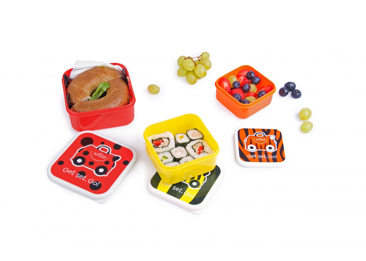 Tre fina matlådor från Trunki.Madlådorna har olika storlekat och ett fint motiv på locket. Ett lock är med Bernard, ett med Harley och ett med Tipu, som också finns som barnresväskor från Trunki.