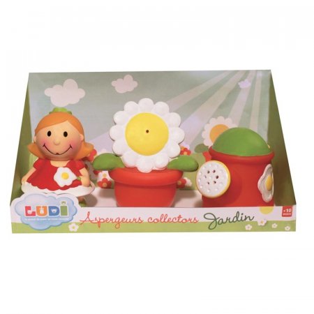 Flicka, vattenkanna och blommor i fina färger som kan spruta vatten när man trycker på dem.Barn älskar att leka med vatten och därför är badleksaker roliga att leka med och kommer alltid att vara en hit.