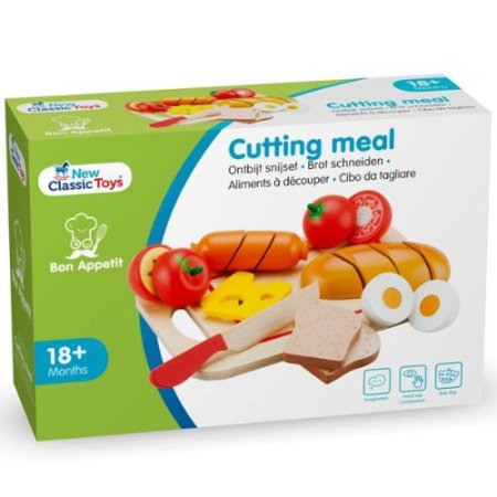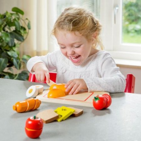 Frukost på skärbräda. Bara att äta!Barn tröttnar aldrig på att imitera vuxna. Därför är denna fina skärbräda i trä med kniv och godsaker helt perfekt. Här kan man leka kock och laga mat. Den lilla träskärbrädan med den fina tomaterna och korven kommer kunna stå och pynta på barnets leksaksspis eller hylla och involveras i matlagningen. Du kommer definitivt bjudas på utsökta maträtter!