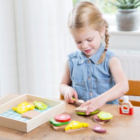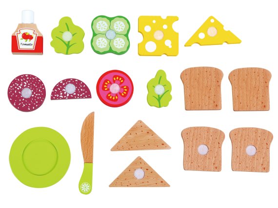 Sandwich-set med bricka.Fin picknickbricka med goda mackor i trä som man kan ta med sig ut i trädgården. Här finns nyttig mat för alla men också möjlighet att göra den lite mer onyttig om man vill det. En flaska ketchup ingår nämligen.