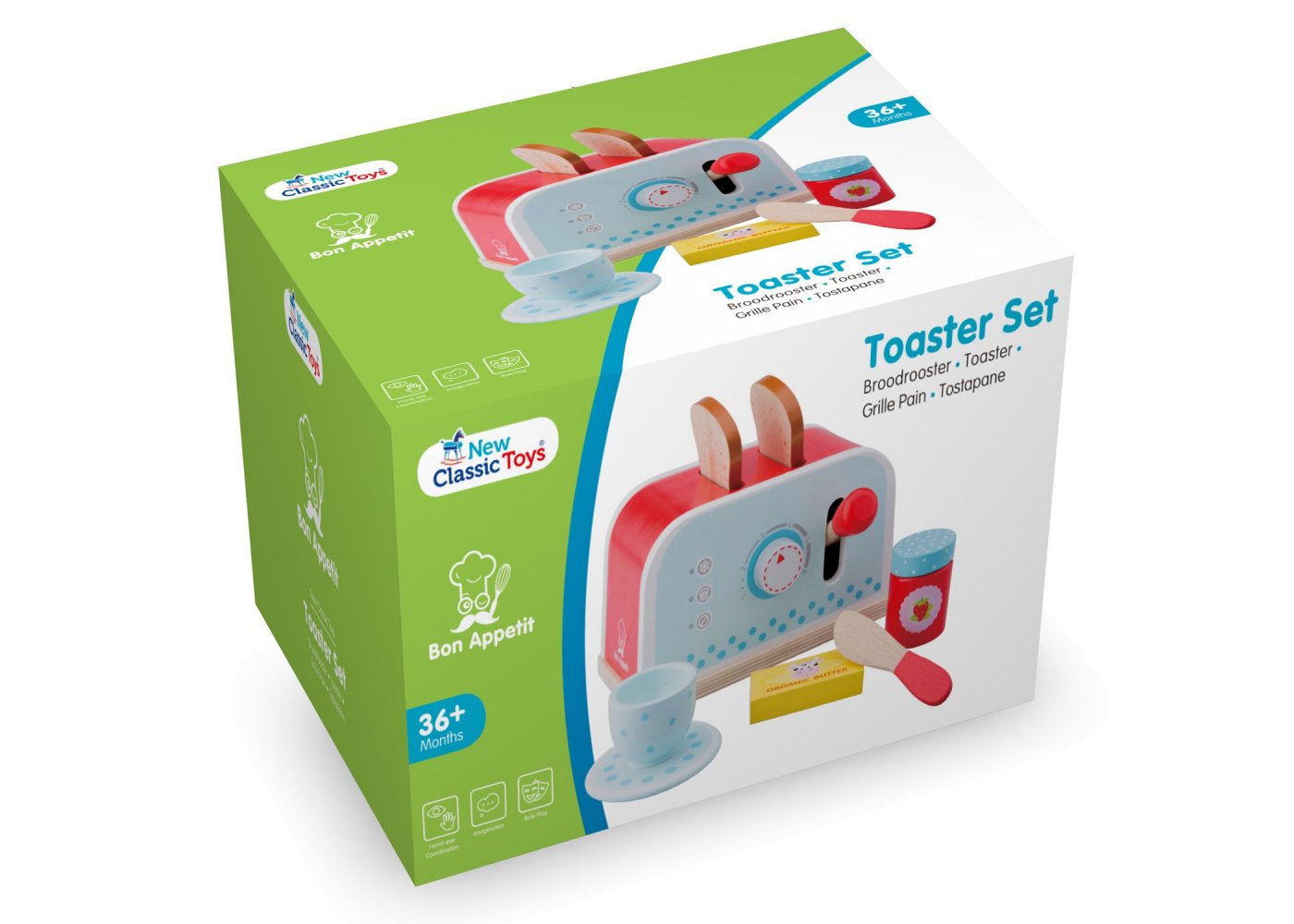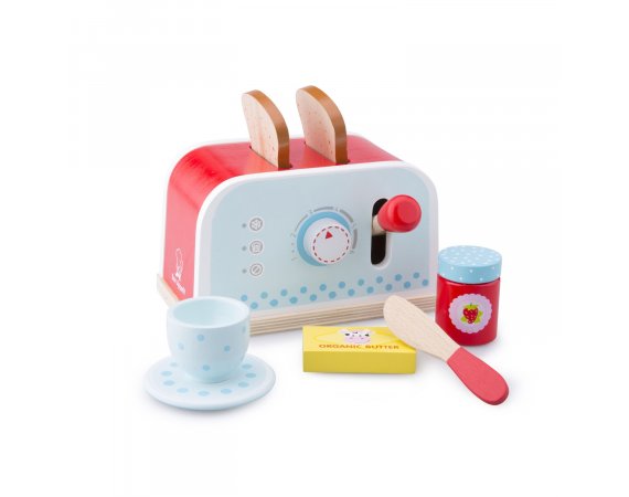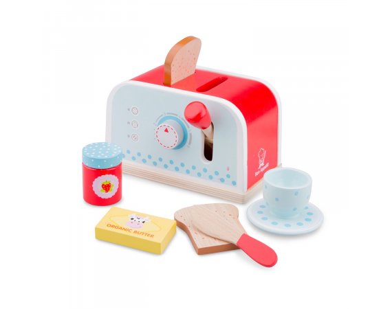 Setet består av en brödrost, bröd, kaffekopp, kniv, smör och marmelad.