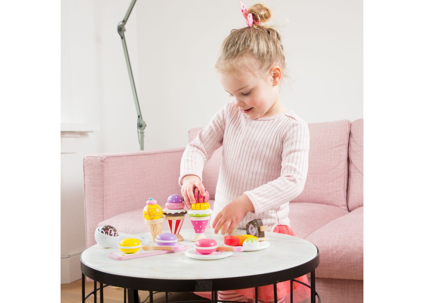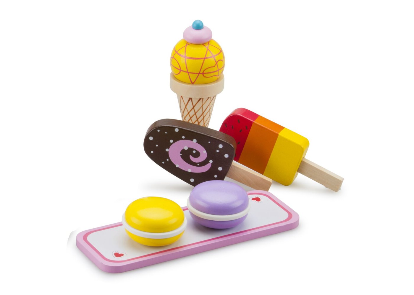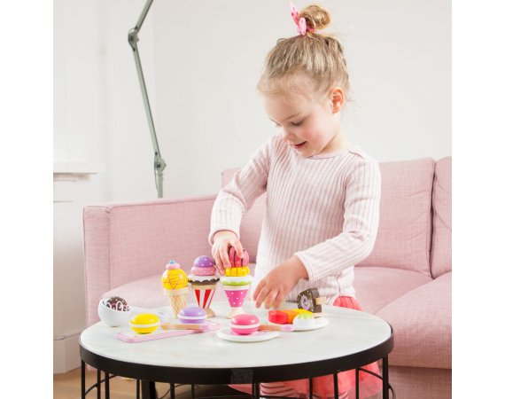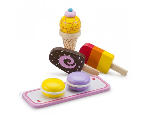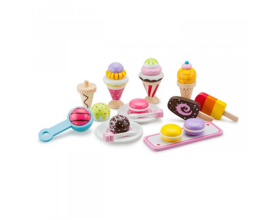 Träglass i olika varianter från New Classic Toys Lek med glass är kul. Detta beror speciellt på att 99% av befolkningen älskar glass. Det smakar gott! Setet består av många olika typer av glass och låter dig öppna din egen glassbar eller servera glass för familjen när det är varmt! Bygg till exempel en glasstrut med glasskulor eller olika lager glassRekommenderas för barn från 3 år
