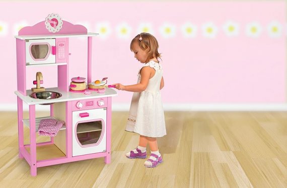 Jättefint och enkelt leksakskök i rosa och vitt, PrinsessaKöket har en ugn, mikrovågsugn, spishäll, träarmatur och metalldiskho samt en klocka på bakväggen så att man kan hålla koll på att maten inte bränns vid.