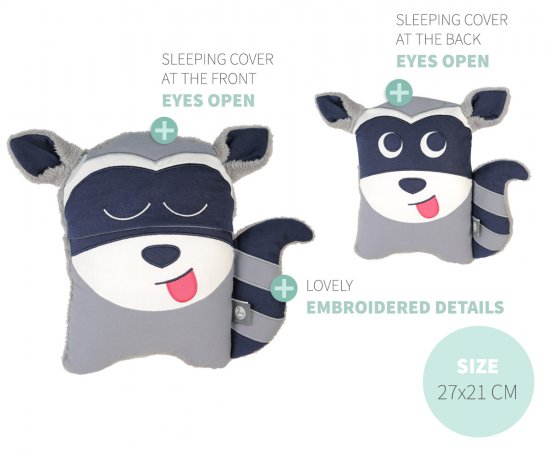 Gosedjuret är i fina färger, utstrålar trygghet och ger en lust att mysa. Tvättbjörnen har en fast huva som kan dras ner över ögonen när det är läggdags. Gosedjuret lägger sig och vaknar nämligen alltid tillsammans med ditt barn!