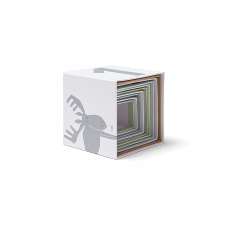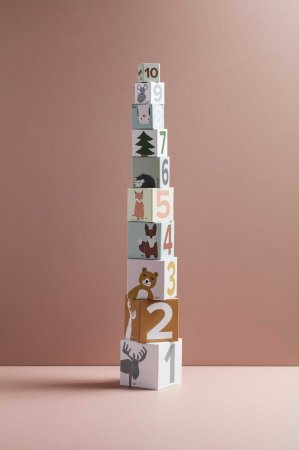 Tio fina tärningar i hård kartong med siffror och figurerTärningar med fina djur och motiv som kan staplas på och i varandra och sorteras i ordning från det minsta till det största och vice versa.