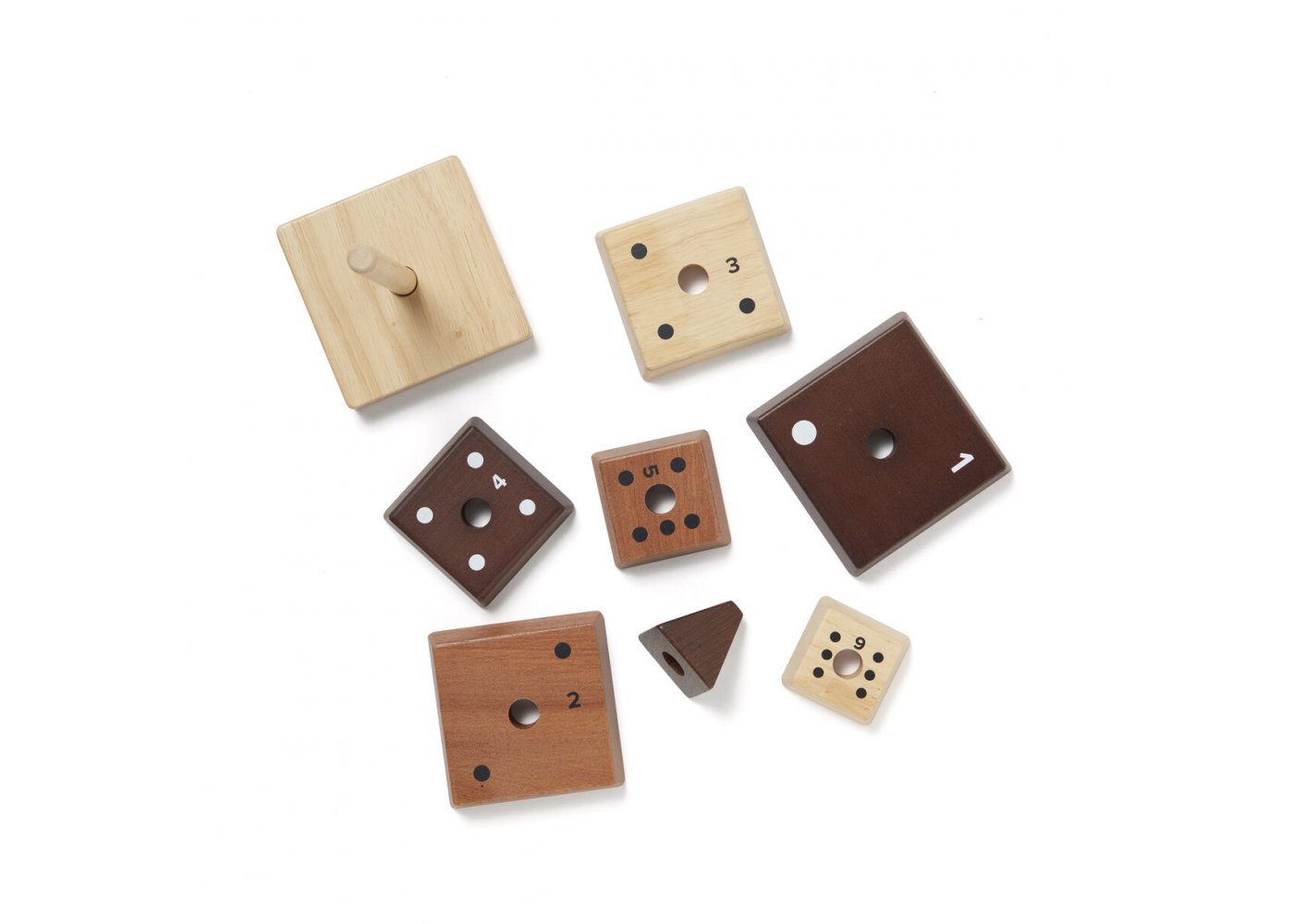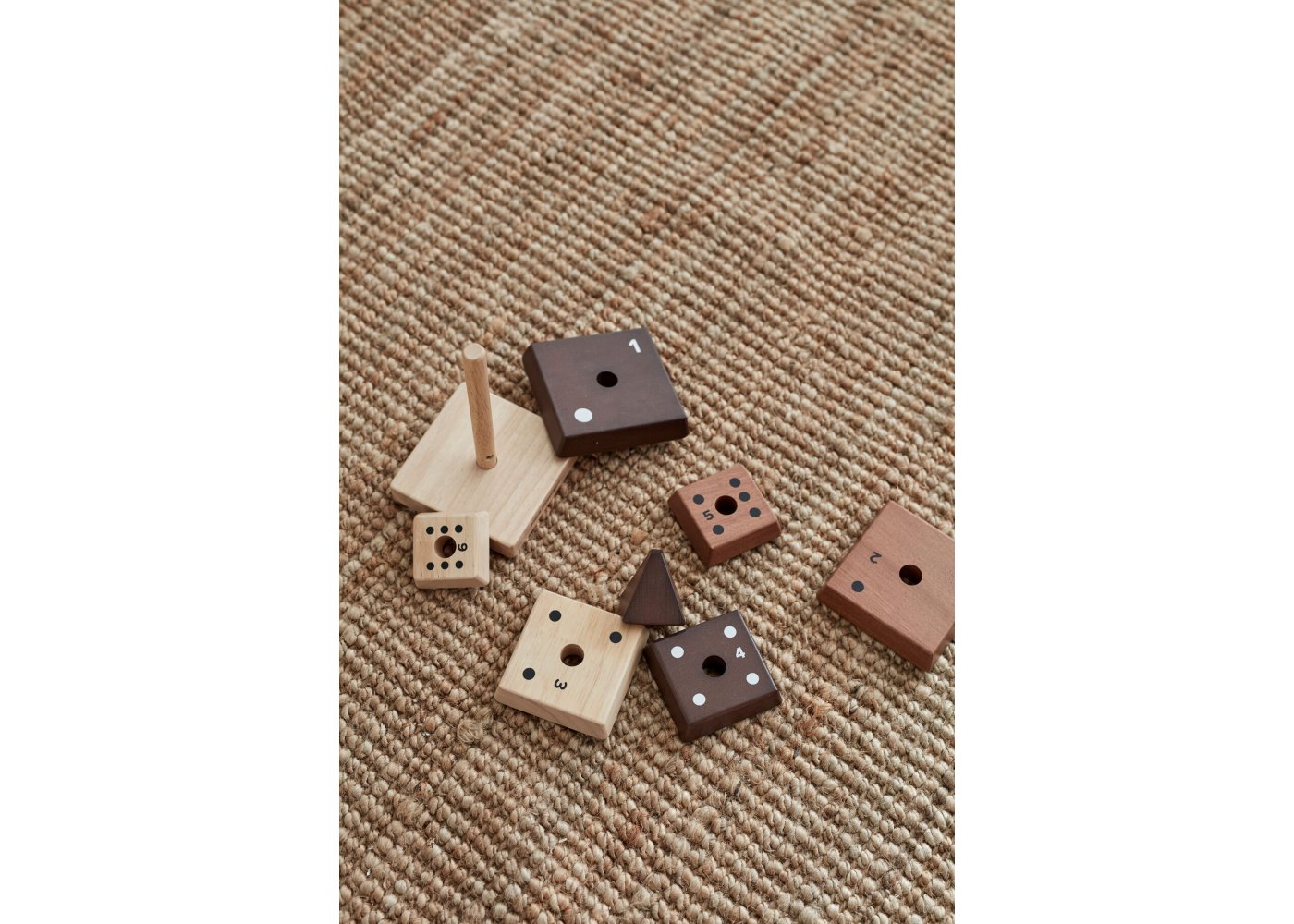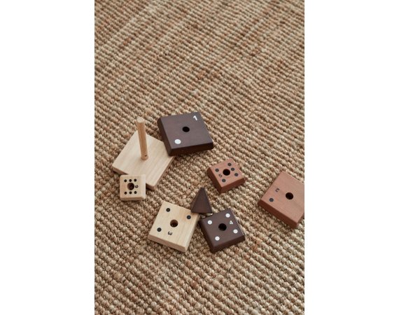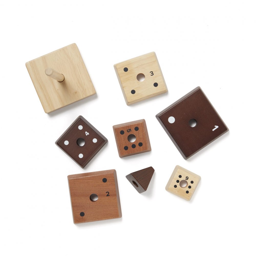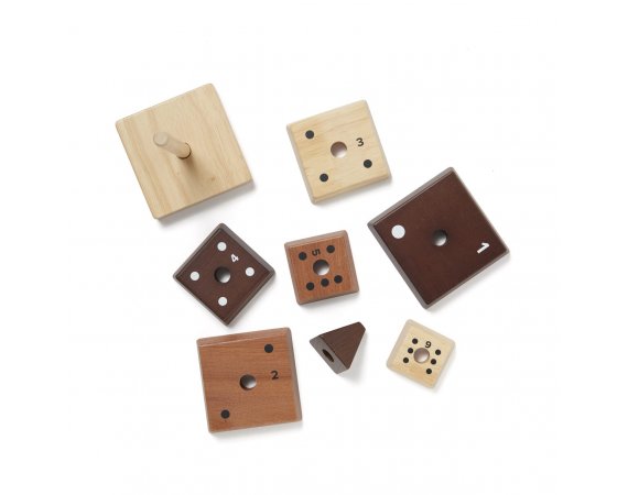 Stapeltornet består av ett stativ och 7 träringar i olika storlekar. Det har också prickar och siffror på varje träbit. Vem kan räkna och vem kan montera pyramiden korrekt.